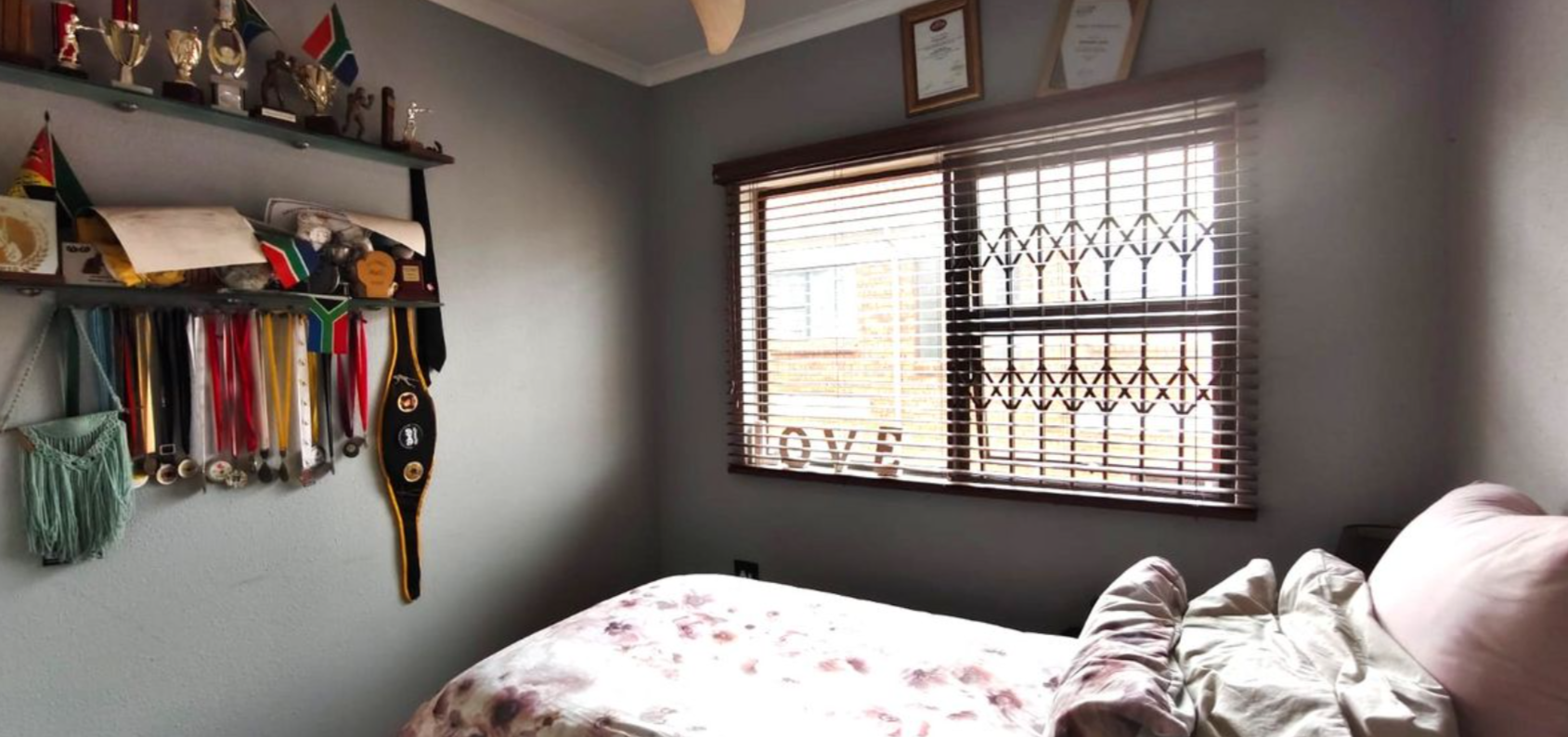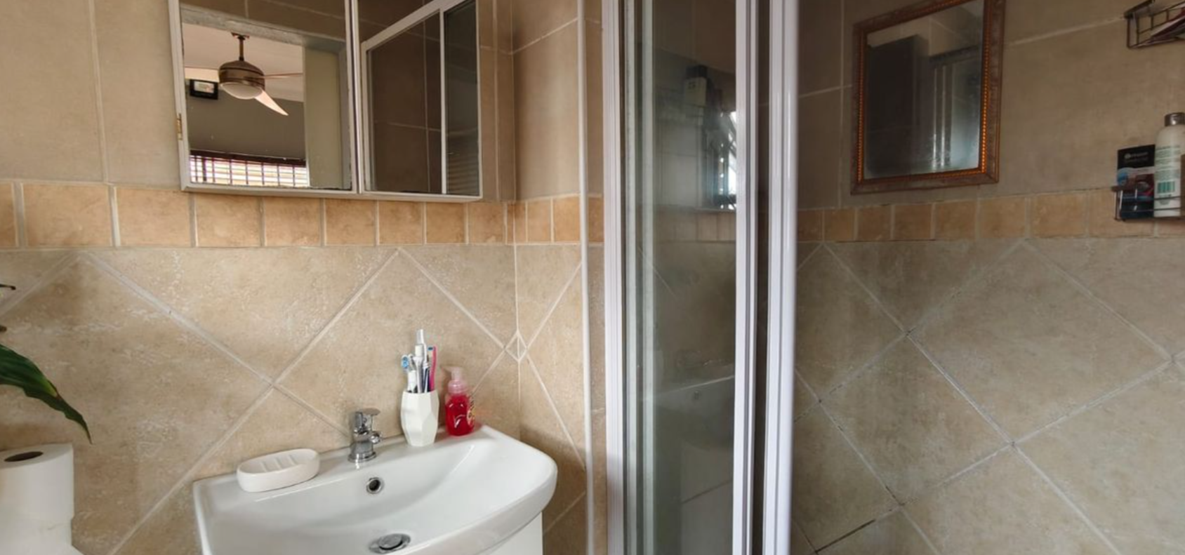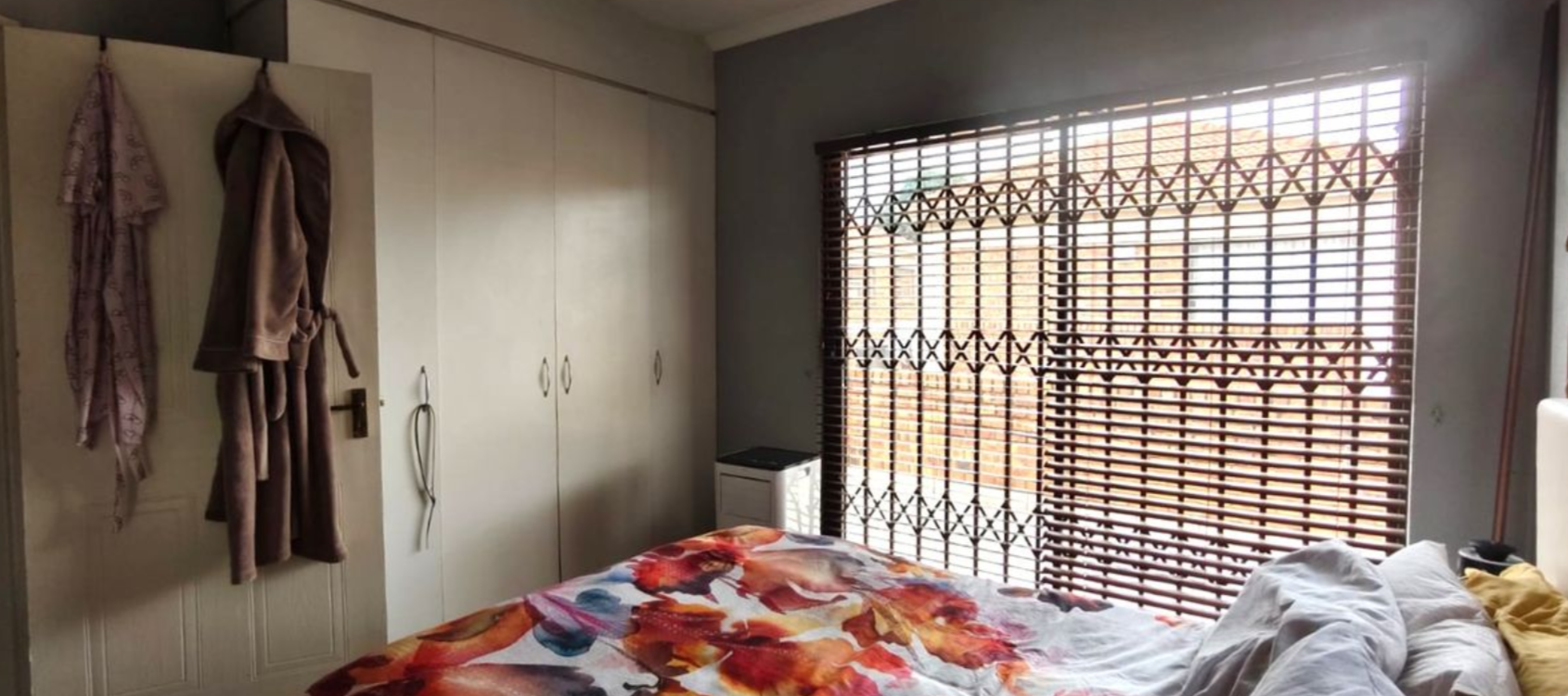 This attractively designed townhouse features three comfortable bedrooms upstairs. The main bedroom boasts laminate flooring, built-in cupboards, a ceiling fan, blinds and sliding doors opening to a private balcony, along with its own ensuite bathroom. The two additional bedrooms share the second bathroom, both with laminate flooring, built-in cupboards, ceiling fans and blinds.