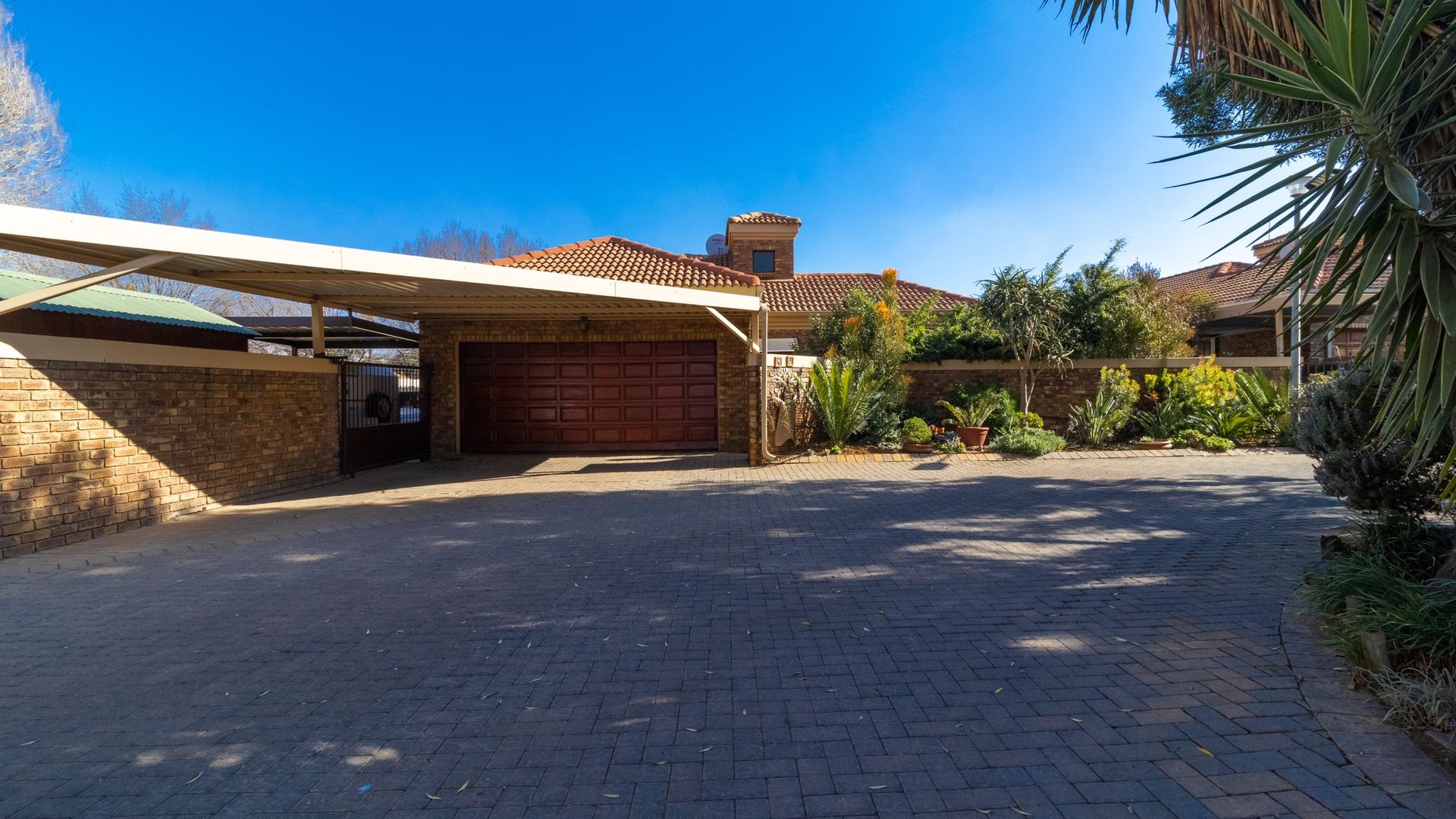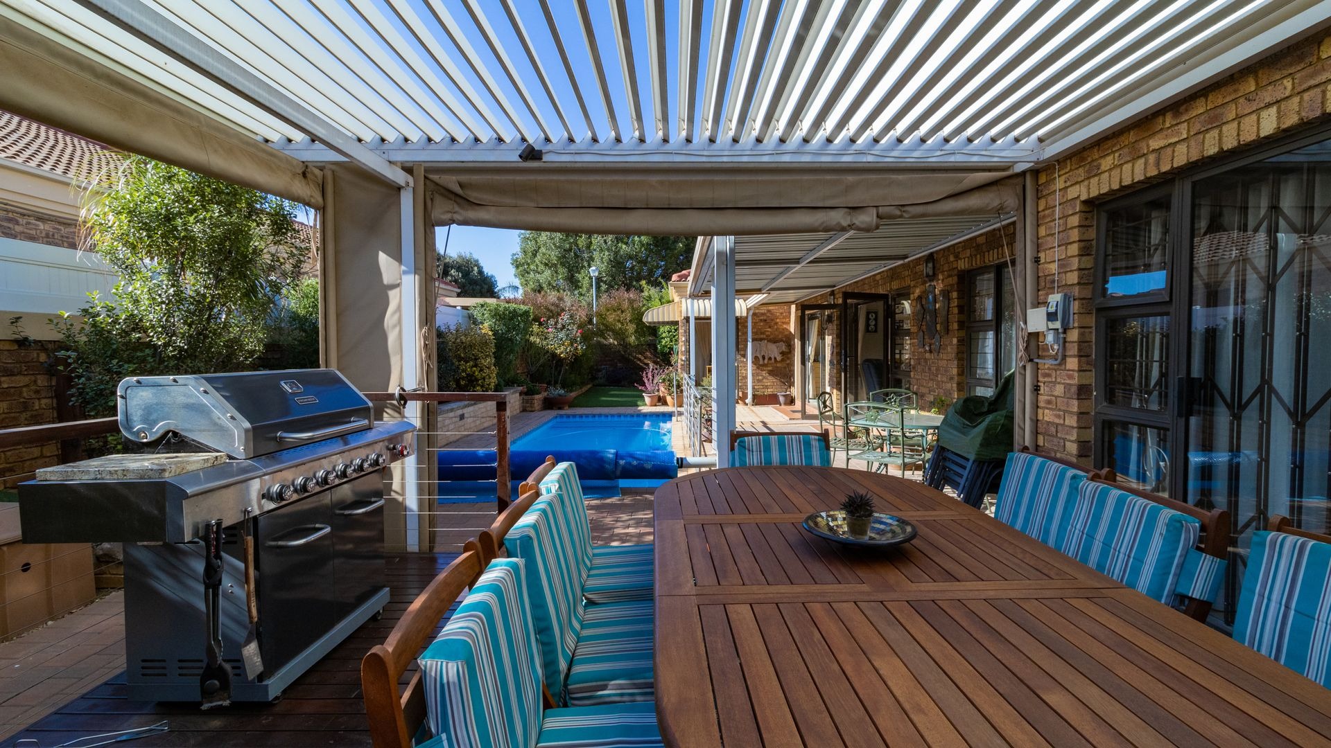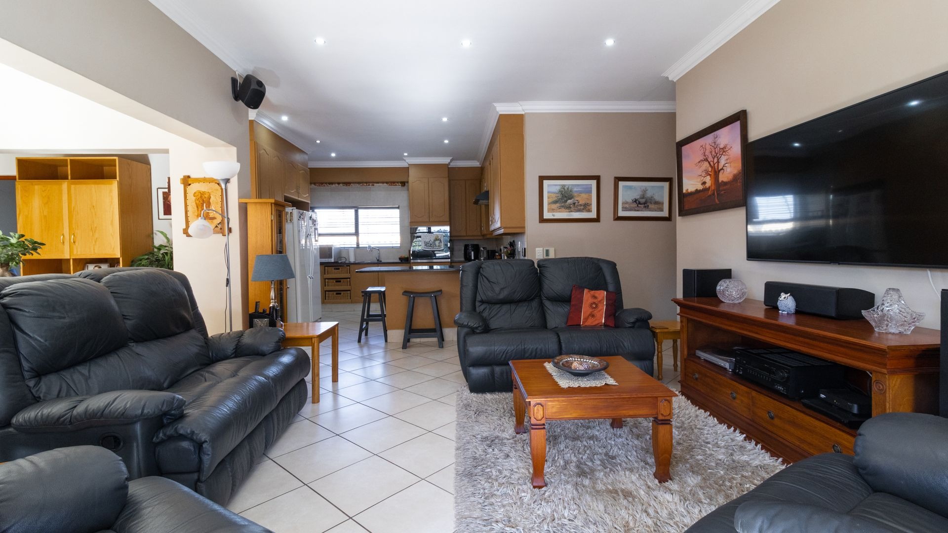 Outdoor living is well-catered for with a private garden, complete with an irrigation system and sprinkler system, ensuring lush surroundings. A patio, deck, and braai room, complemented by an awning, provide ample opportunities for outdoor entertaining. The property also includes two garages and three additional parking spaces, alongside a paved driveway, offering extensive vehicle accommodation.