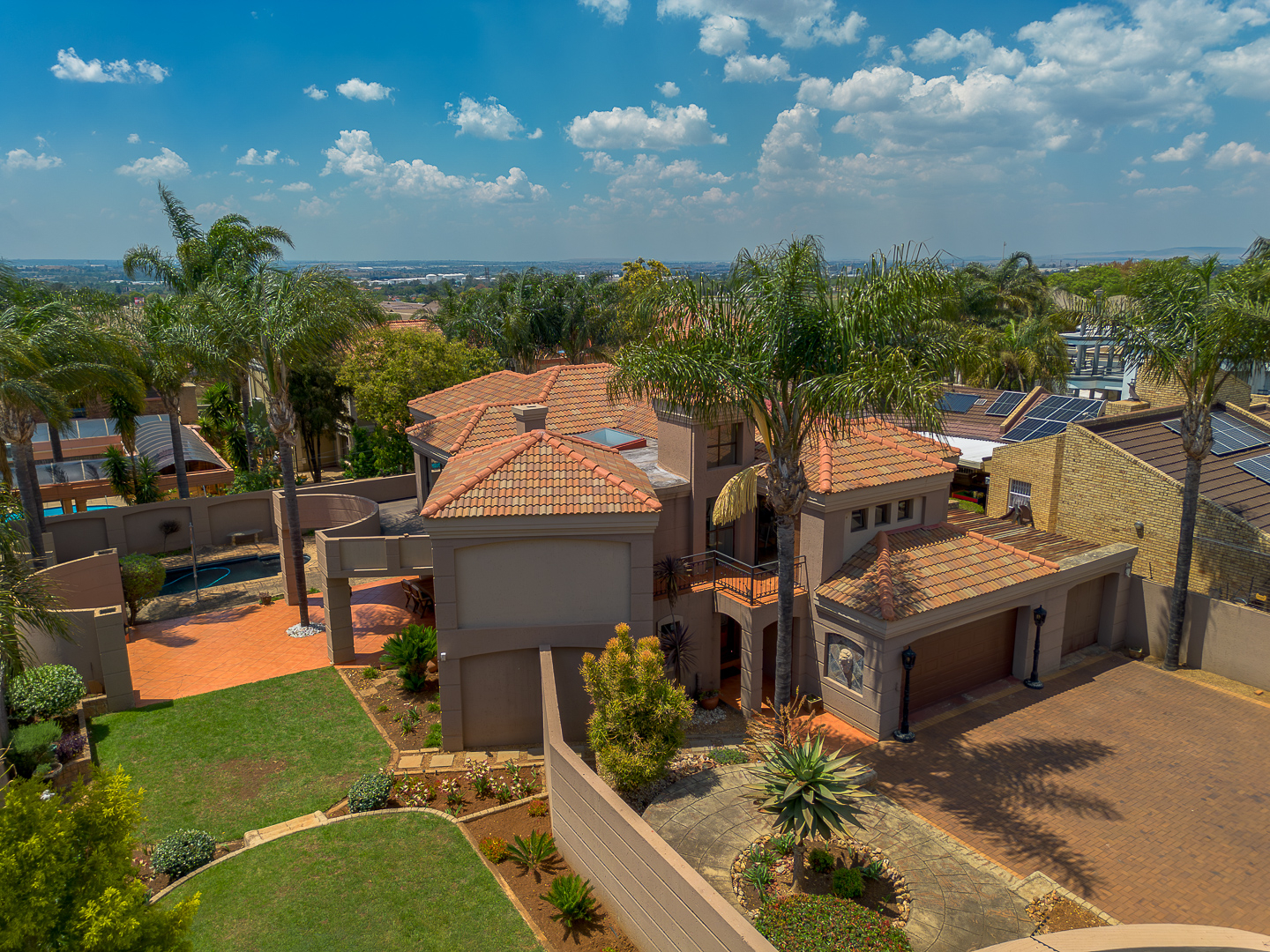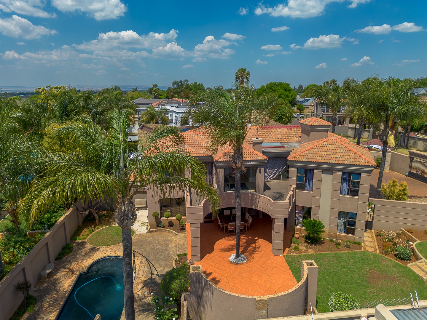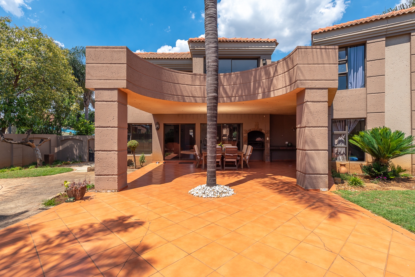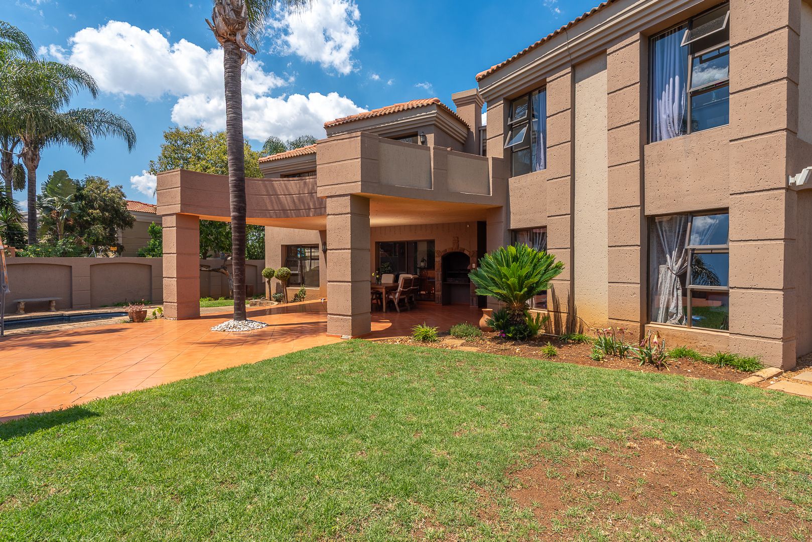 Seamlessly blending indoor and outdoor living, the property offers an unrivalled entertainment experience. Step out onto the spacious covered patio, complete with a built-in braai, perfect for al fresco dining and lavish gatherings. The private swimming pool, set within a meticulously maintained garden with an irrigation system and mature palm trees, creates a serene oasis. Practical amenities include three garages, ample parking for six vehicles, staff quarters, outside toilets, a wendy house, and a balcony offering elevated views.
