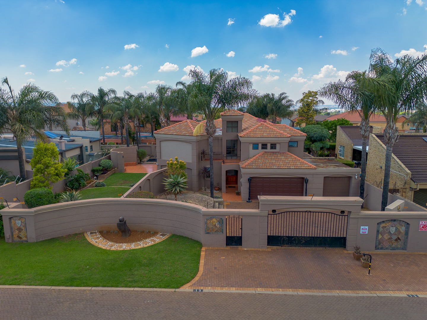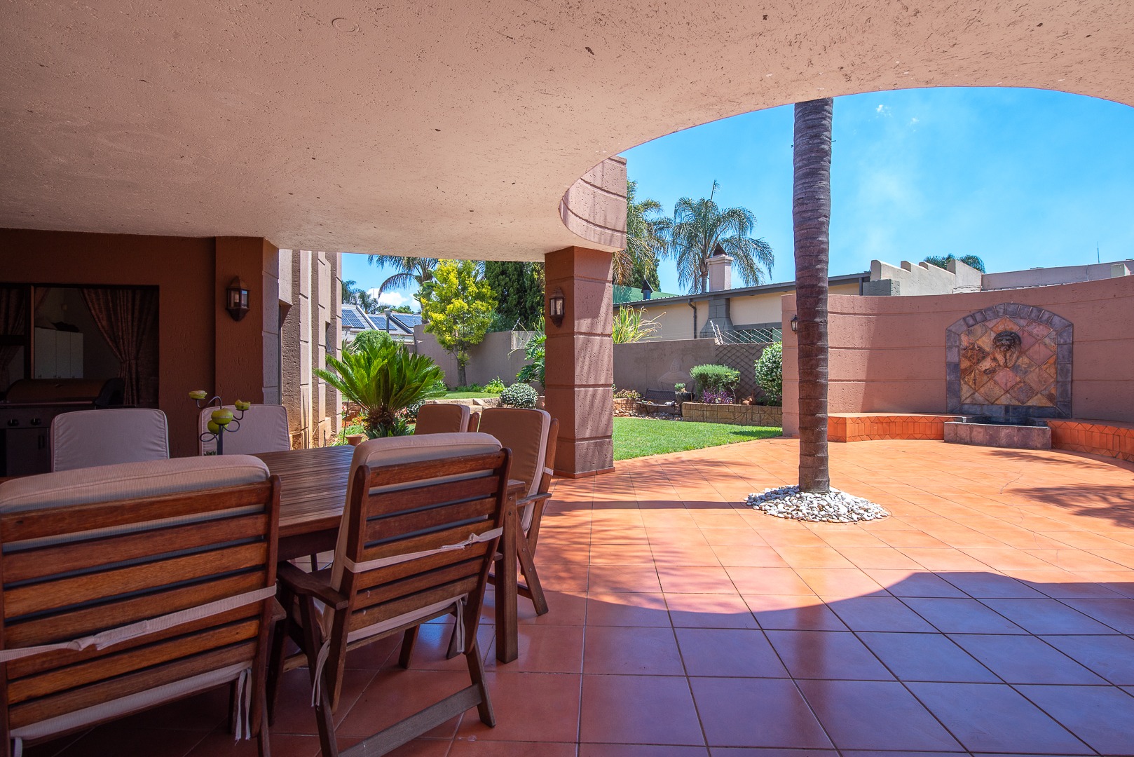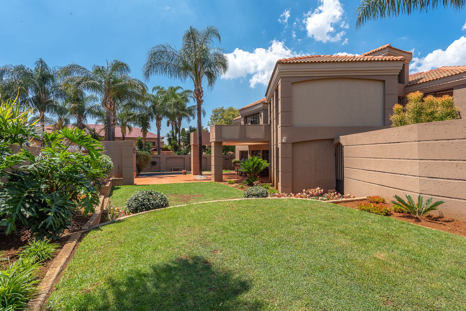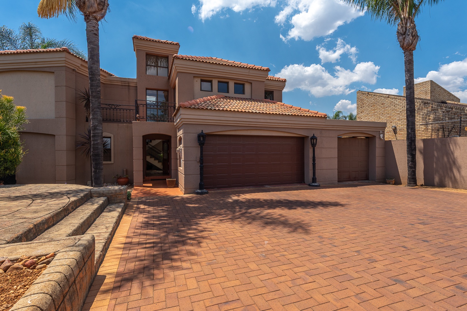 Seamlessly blending indoor and outdoor living, the property offers an unrivalled entertainment experience. Step out onto the spacious covered patio, complete with a built-in braai, perfect for al fresco dining and lavish gatherings. The private swimming pool, set within a meticulously maintained garden with an irrigation system and mature palm trees, creates a serene oasis. Practical amenities include three garages, ample parking for six vehicles, staff quarters, outside toilets, a wendy house, and a balcony offering elevated views.