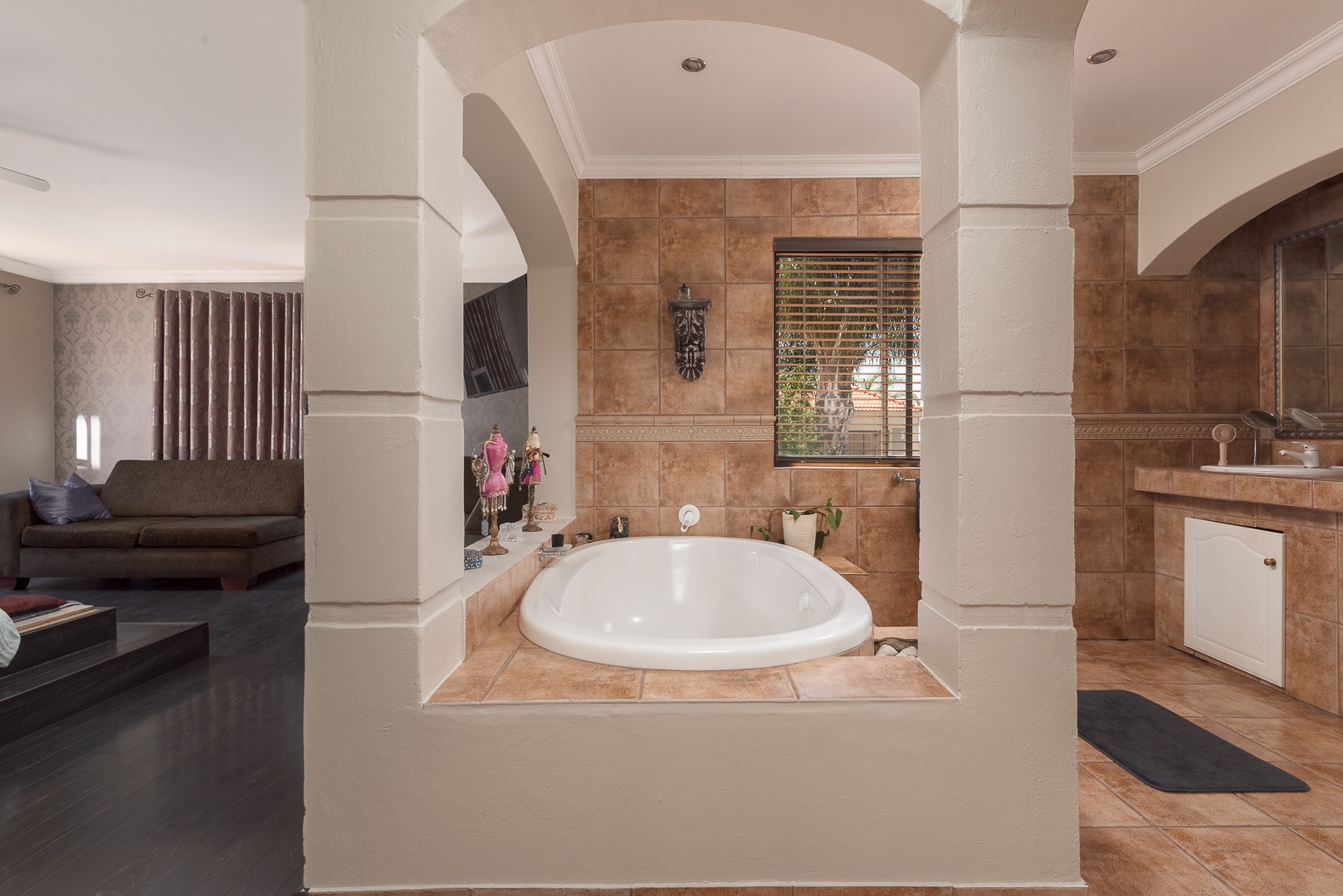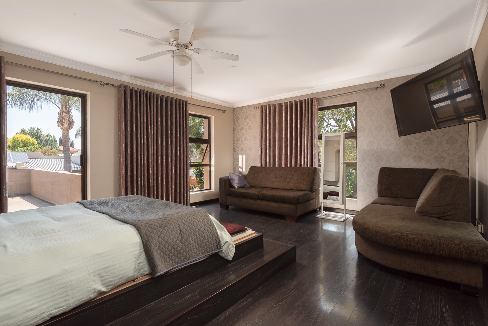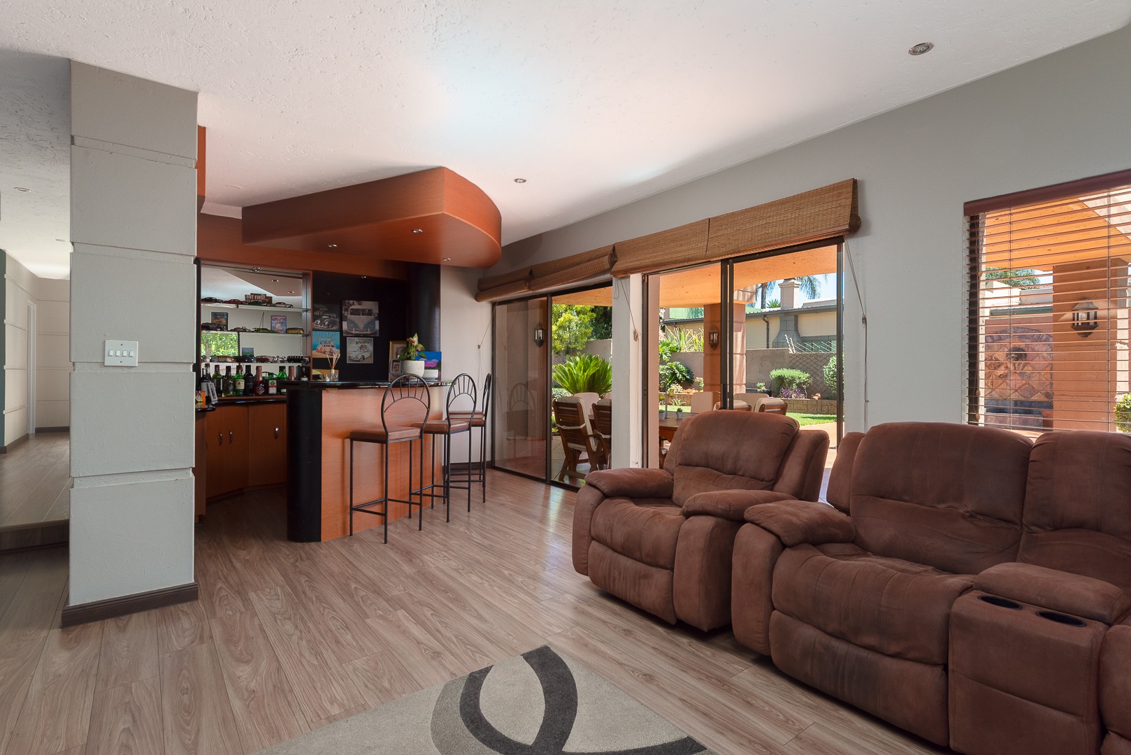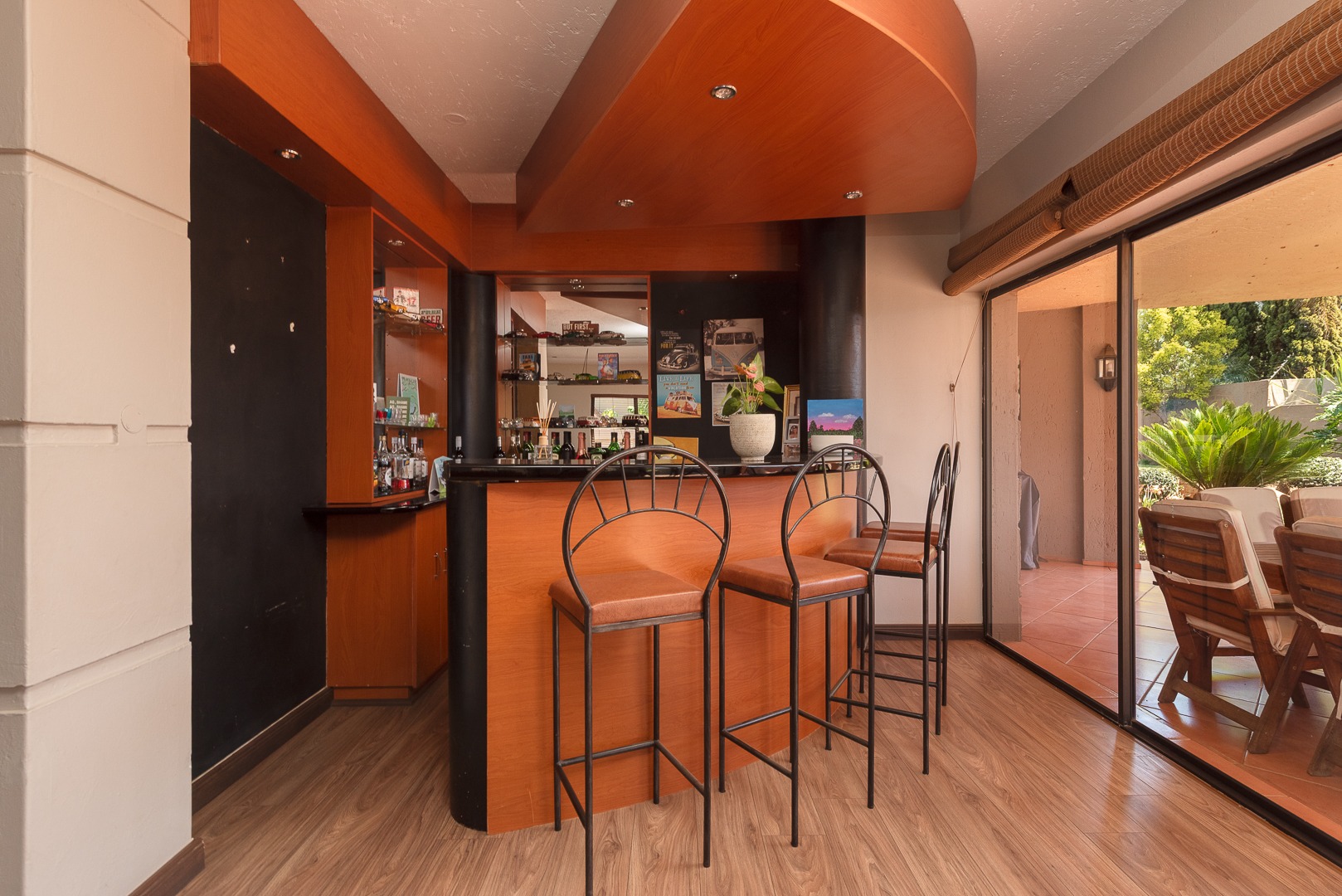 Seamlessly blending indoor and outdoor living, the property offers an unrivalled entertainment experience. Step out onto the spacious covered patio, complete with a built-in braai, perfect for al fresco dining and lavish gatherings. The private swimming pool, set within a meticulously maintained garden with an irrigation system and mature palm trees, creates a serene oasis. Practical amenities include three garages, ample parking for six vehicles, staff quarters, outside toilets, a wendy house, and a balcony offering elevated views.