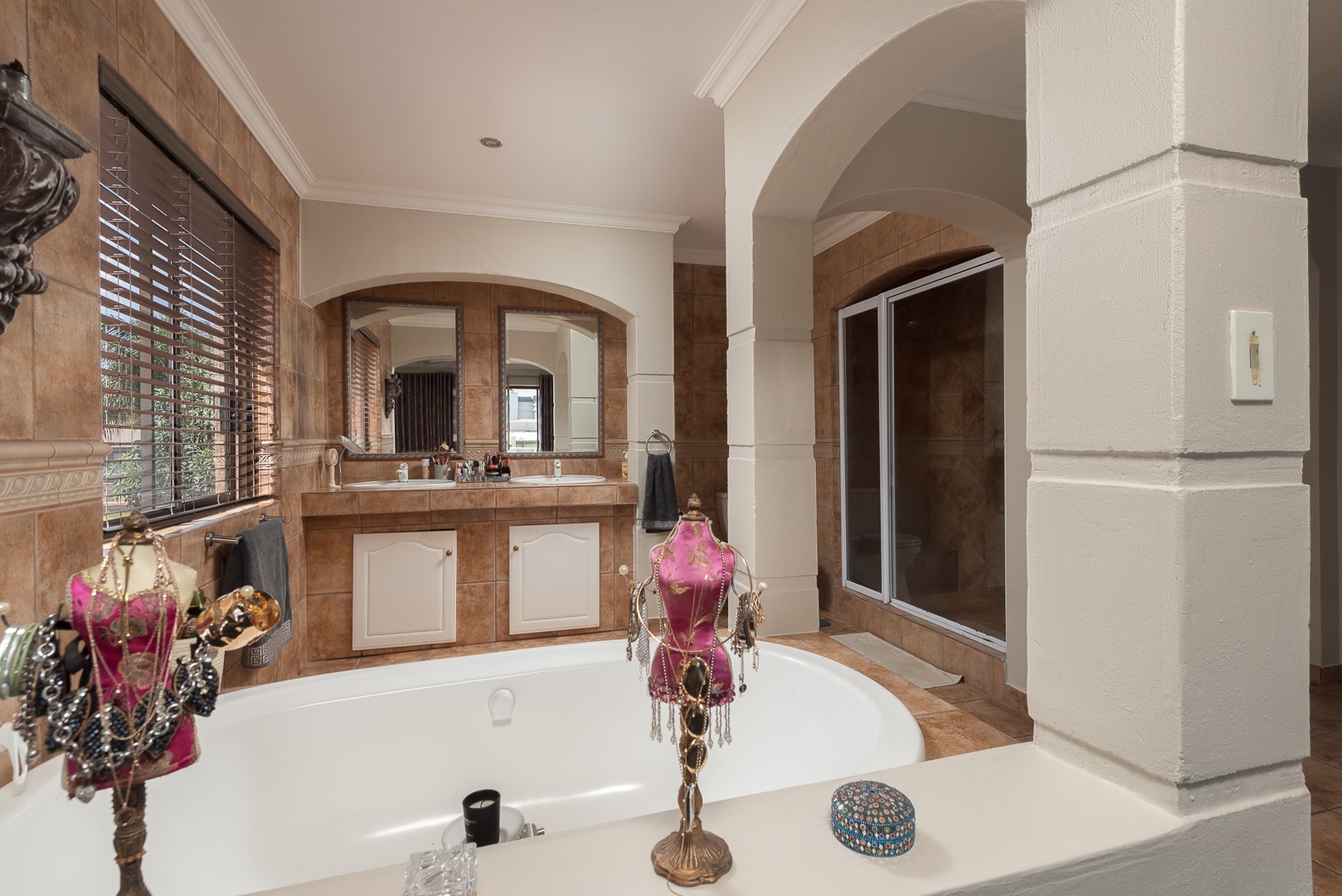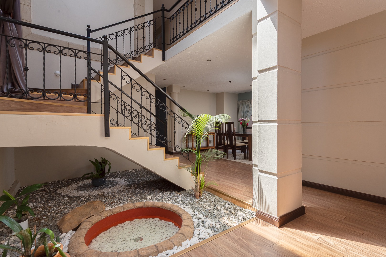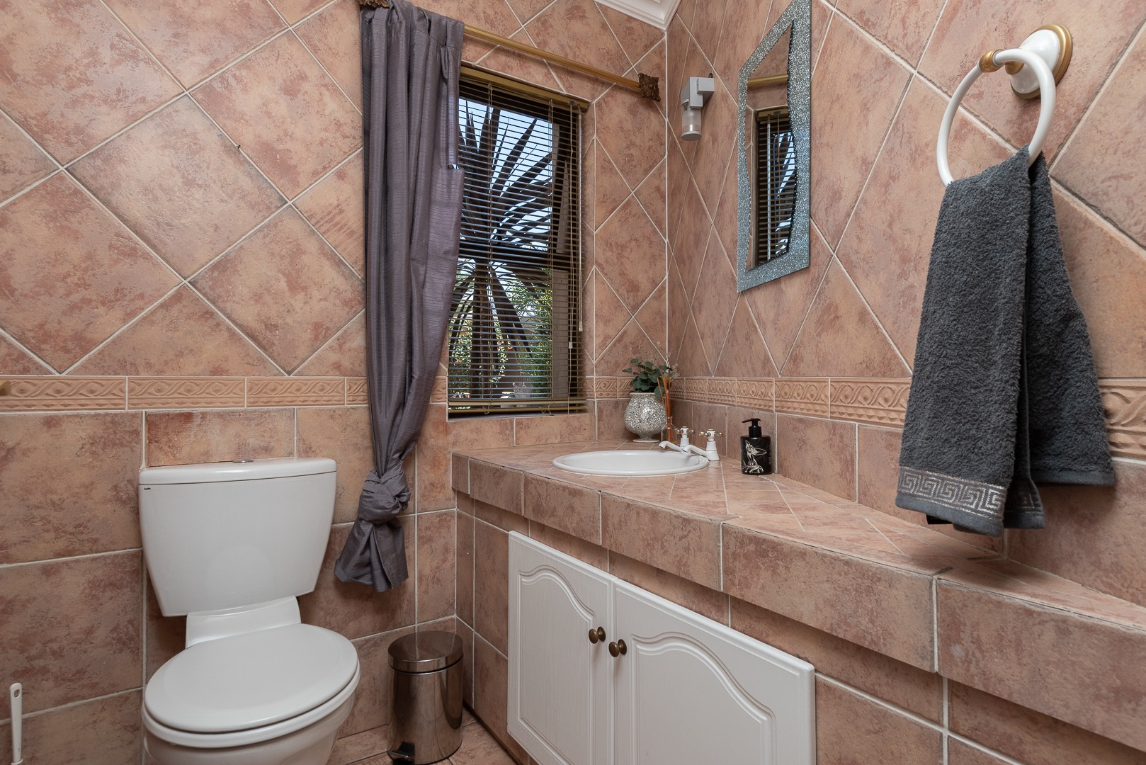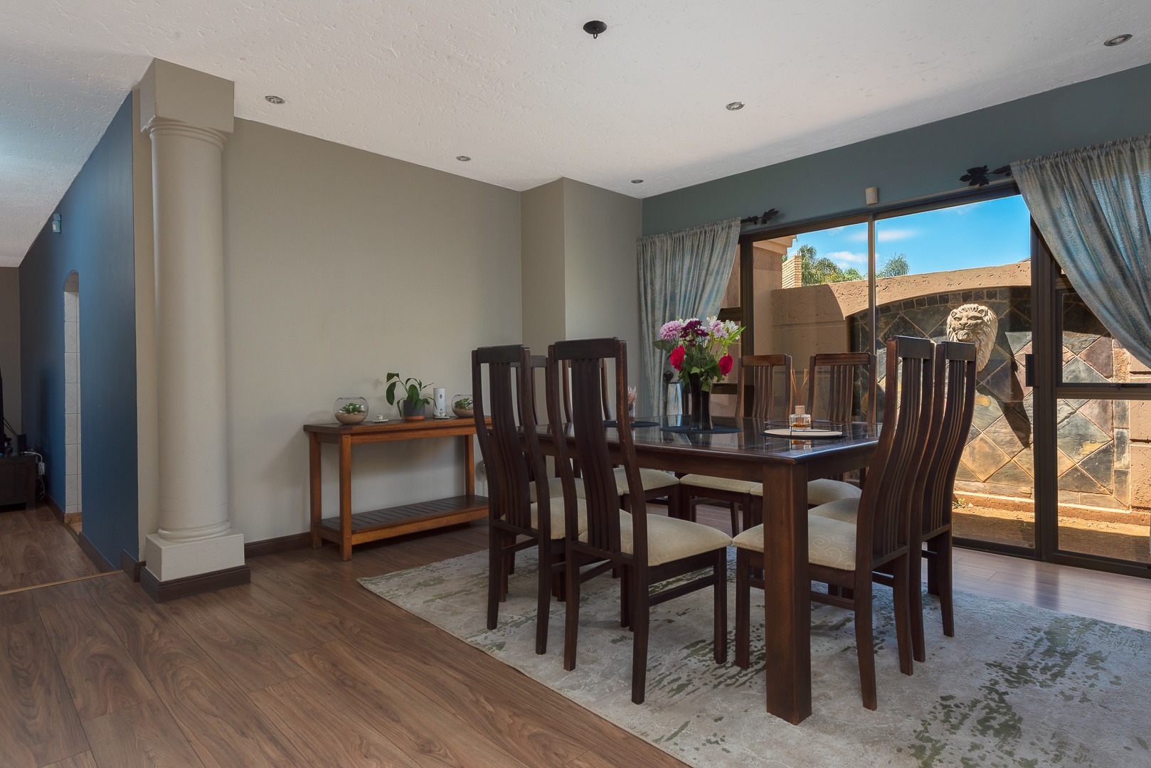 Seamlessly blending indoor and outdoor living, the property offers an unrivalled entertainment experience. Step out onto the spacious covered patio, complete with a built-in braai, perfect for al fresco dining and lavish gatherings. The private swimming pool, set within a meticulously maintained garden with an irrigation system and mature palm trees, creates a serene oasis. Practical amenities include three garages, ample parking for six vehicles, staff quarters, outside toilets, a wendy house, and a balcony offering elevated views.