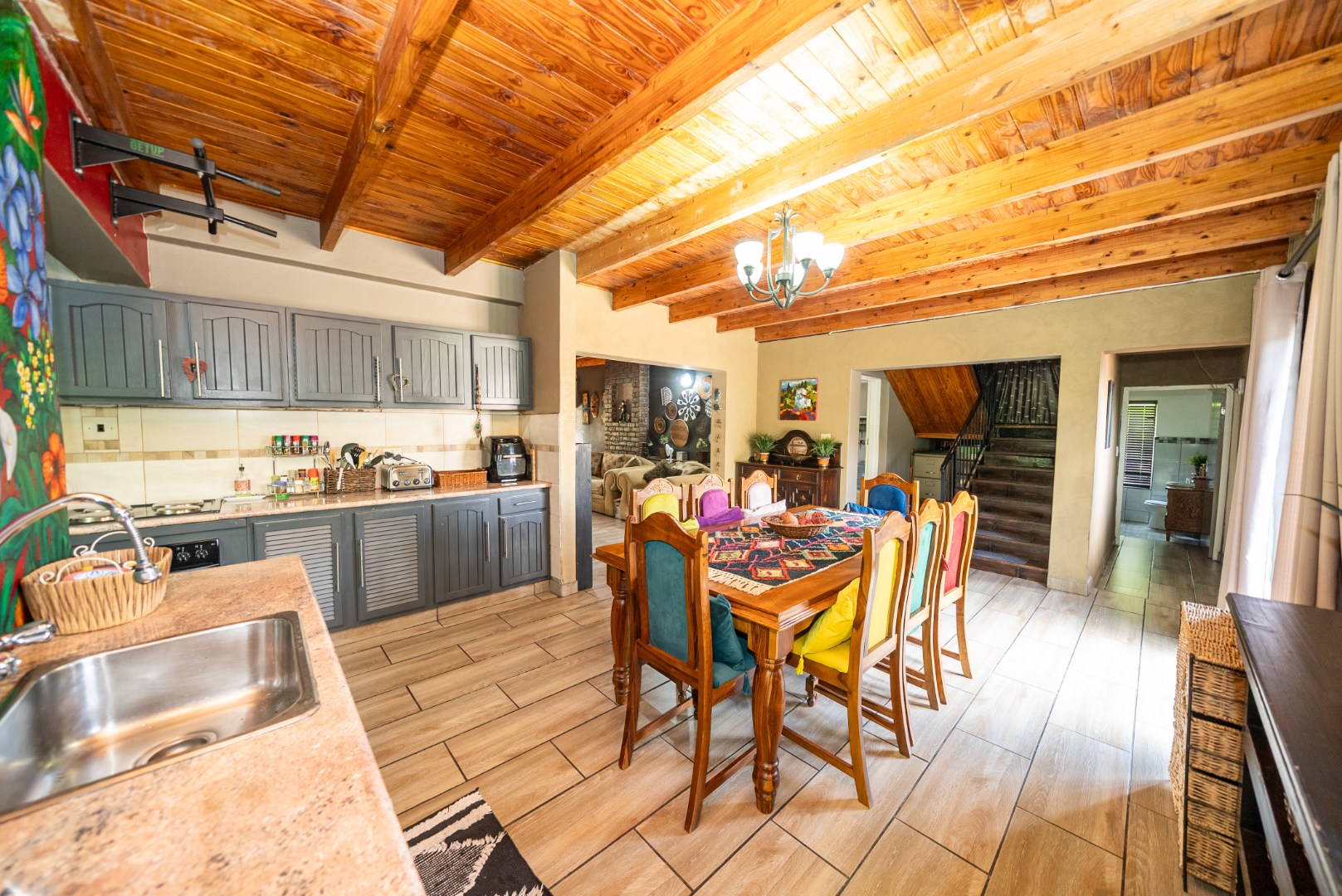The home boasts 3 well-appointed bathrooms and a beautifully designed open-plan kitchen that flows seamlessly into the dining and lounge areas. The kitchen overlooks the heart of the home, creating a warm, connected atmosphere perfect for entertaining and everyday family life. Above the kitchen, you’ll find a massive second lounge, offering the perfect space for a TV room, pajama lounge, or private retreat.