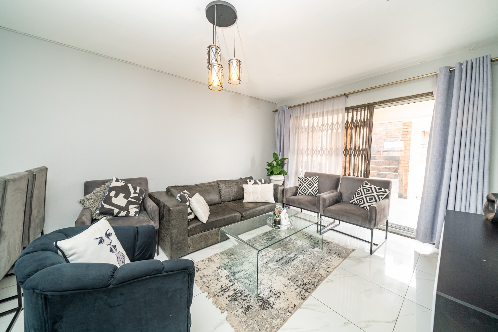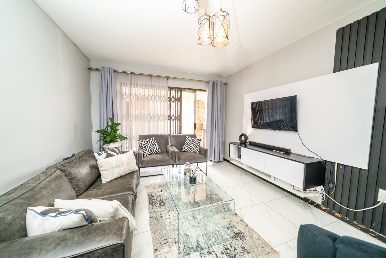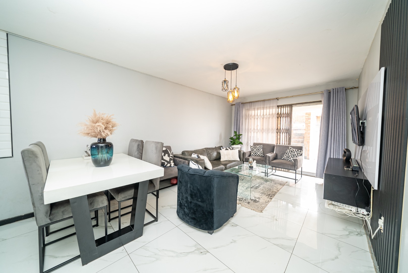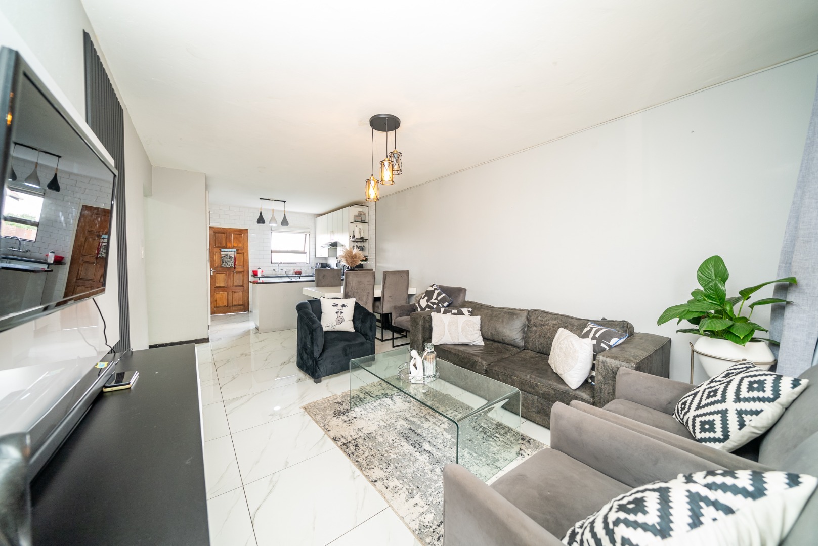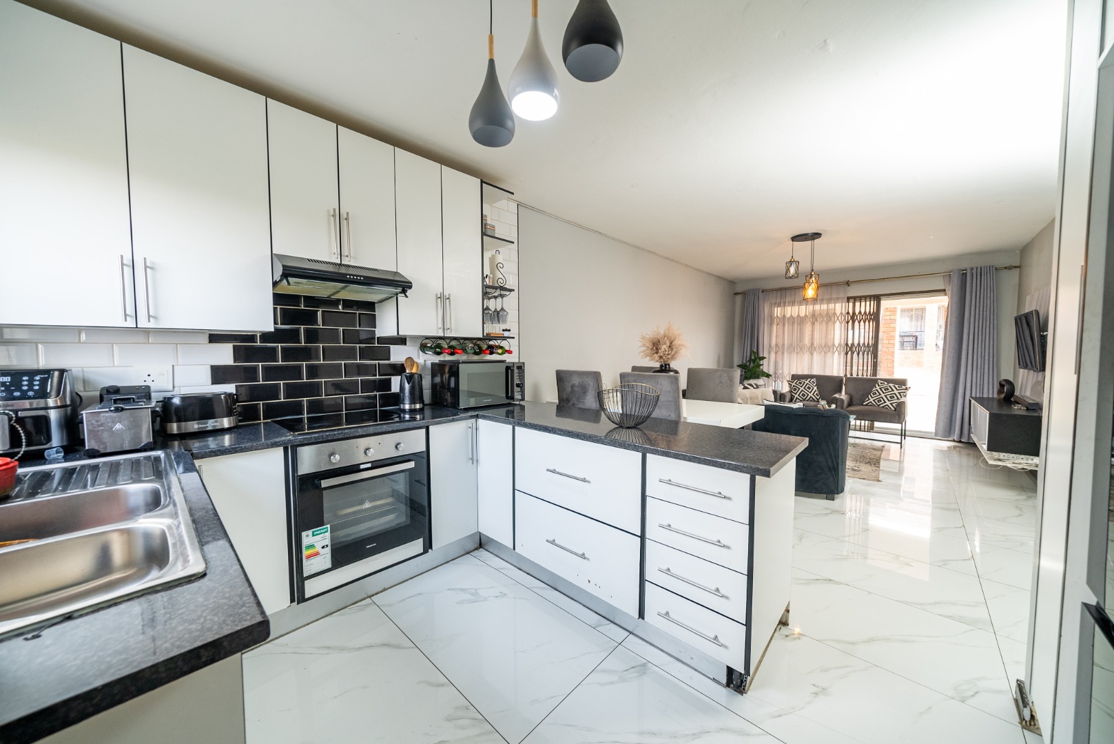 Discover contemporary living in this inviting 77 sqm residential sale property. The open-plan layout seamlessly integrates the lounge, dining area, and a stylish kitchen, creating a spacious and bright environment. Adorned with sleek white tiled flooring and light grey walls, the modern kitchen features white cabinetry, black countertops, a subway tile backsplash, and elegant pendant lighting. A contemporary TV feature wall and large sliding doors, equipped with security gates, enhance the living space, allowing for abundant natural light and easy access to the outdoors. This home offers three well-proportioned bedrooms and two modern bathrooms, including a private en-suite, plus a convenient guest toilet. Step outside to a private covered patio, perfect for outdoor enjoyment. The property features durable brick construction, brick-paved driveways, and dedicated covered parking for two vehicles, ensuring practicality and ease of access. The neat and uniform brick exterior with modern dark-framed windows contributes to its appealing kerb side presence. Situated within a secure estate and gated community, this property offers peace of mind with 24-hour security, an access gate, security post, electric fencing, and an intercom system. Further enhancing security, the sliding doors are fitted with security gates. Fibre connectivity is available, catering to modern communication needs. Located in a cul-de-sac within the estate, it offers a tranquil setting away from through traffic. Key Features: * 3 Bedrooms, 2 Bathrooms (1 en-suite) * Open-plan living, dining, and modern kitchen * 77 sqm floor size * Covered patio with sliding security doors * Dedicated covered parking for 2 vehicles * Secure estate with 24-hour security and electric fencing * Fibre ready * Brick exterior with paved driveway