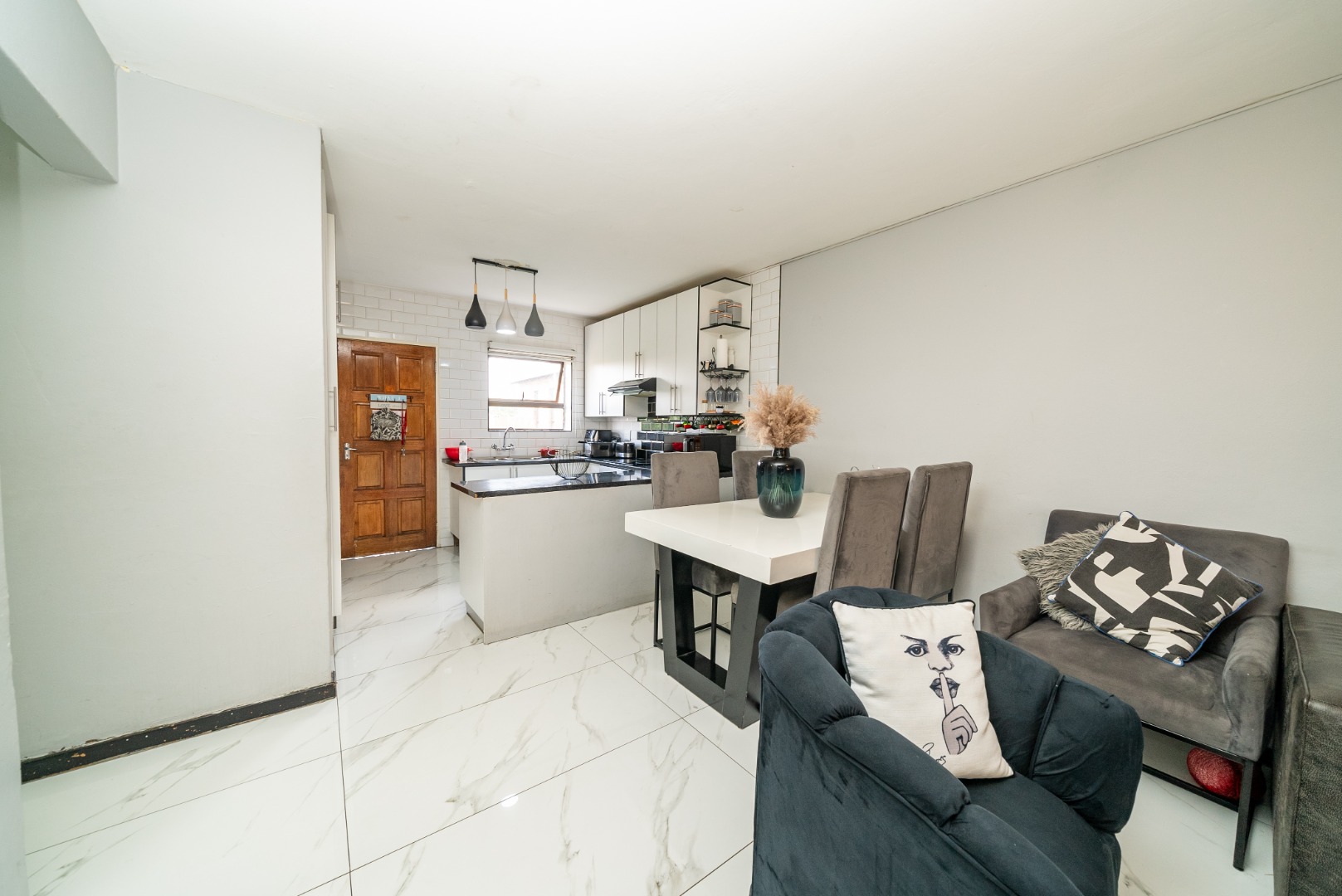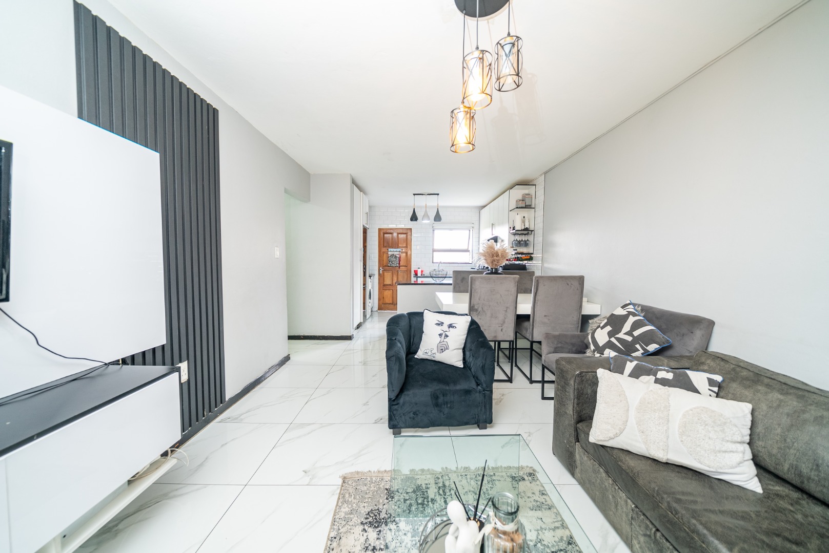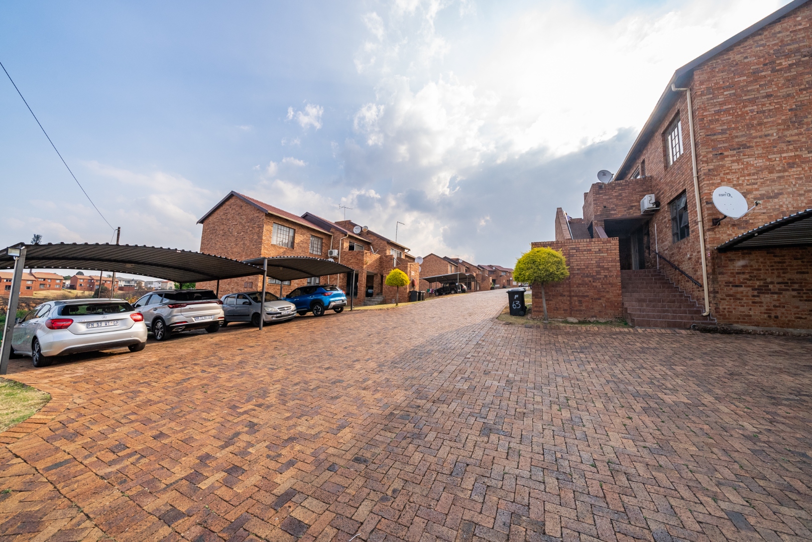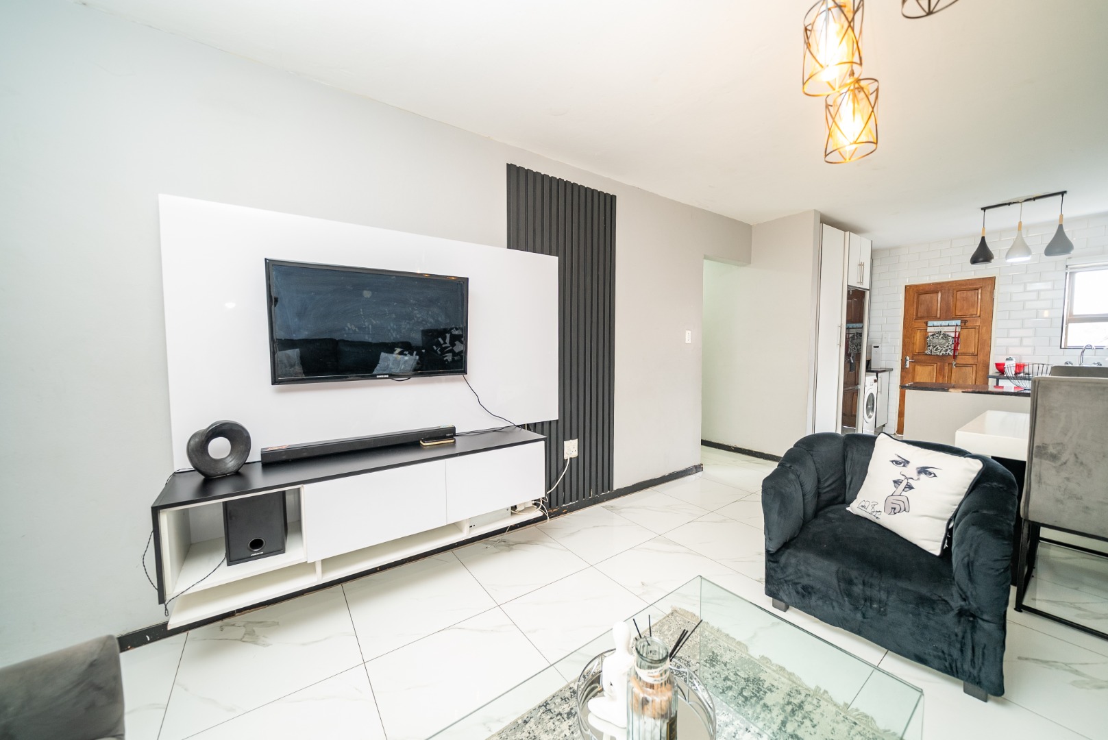Discover contemporary living in this inviting 77 sqm residential sale property. The open-plan layout seamlessly integrates the lounge, dining area, and a stylish kitchen, creating a spacious and bright environment. Adorned with sleek white tiled flooring and light grey walls, the modern kitchen features white cabinetry, black countertops, a subway tile backsplash, and elegant pendant lighting. A contemporary TV feature wall and large sliding doors, equipped with security gates, enhance the living space, allowing for abundant natural light and easy access to the outdoors. This home offers three well-proportioned bedrooms and two modern bathrooms, including a private en-suite, plus a convenient guest toilet. Step outside to a private covered patio, perfect for outdoor enjoyment. The property features durable brick construction, brick-paved driveways, and dedicated covered parking for two vehicles, ensuring practicality and ease of access. The neat and uniform brick exterior with modern dark-framed windows contributes to its appealing kerb side presence. Situated within a secure estate and gated community, this property offers peace of mind with 24-hour security, an access gate, security post, electric fencing, and an intercom system. Further enhancing security, the sliding doors are fitted with security gates. Fibre connectivity is available, catering to modern communication needs. Located in a cul-de-sac within the estate, it offers a tranquil setting away from through traffic. Key Features: * 3 Bedrooms, 2 Bathrooms (1 en-suite) * Open-plan living, dining, and modern kitchen * 77 sqm floor size * Covered patio with sliding security doors * Dedicated covered parking for 2 vehicles * Secure estate with 24-hour security and electric fencing * Fibre ready * Brick exterior with paved driveway