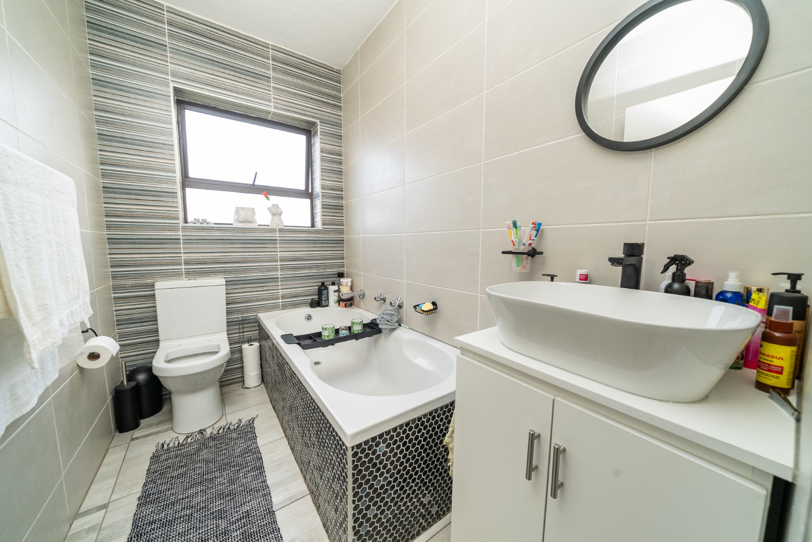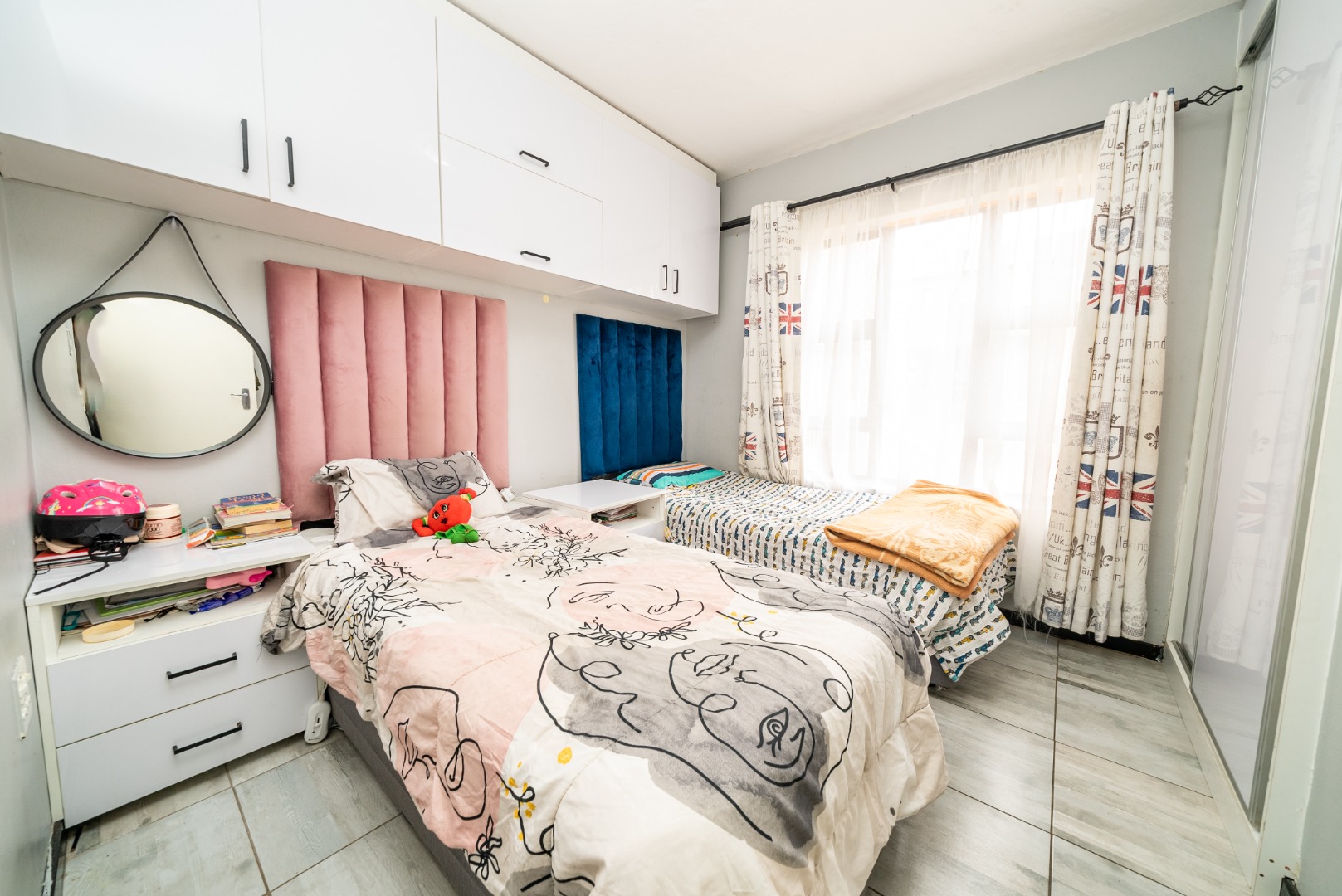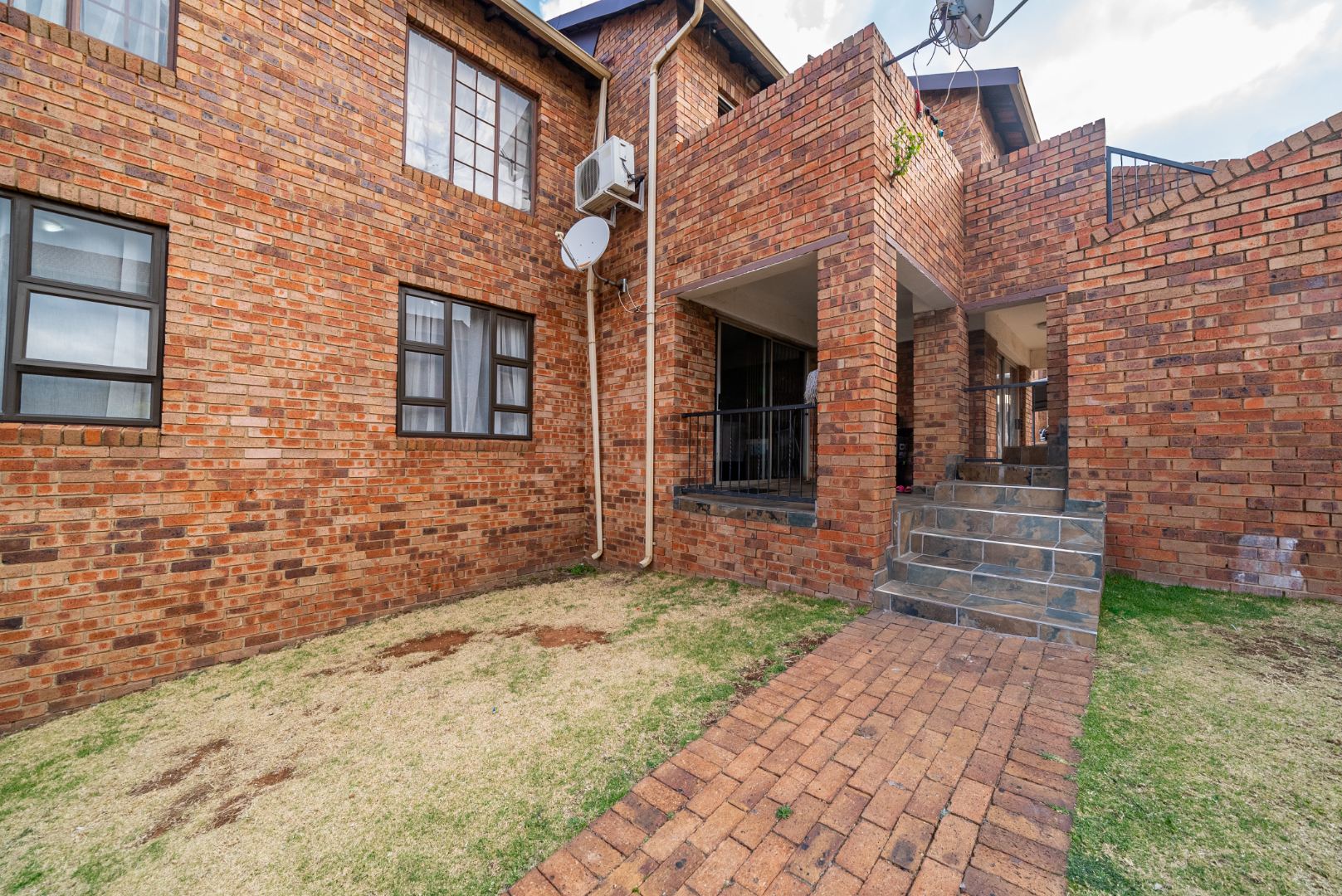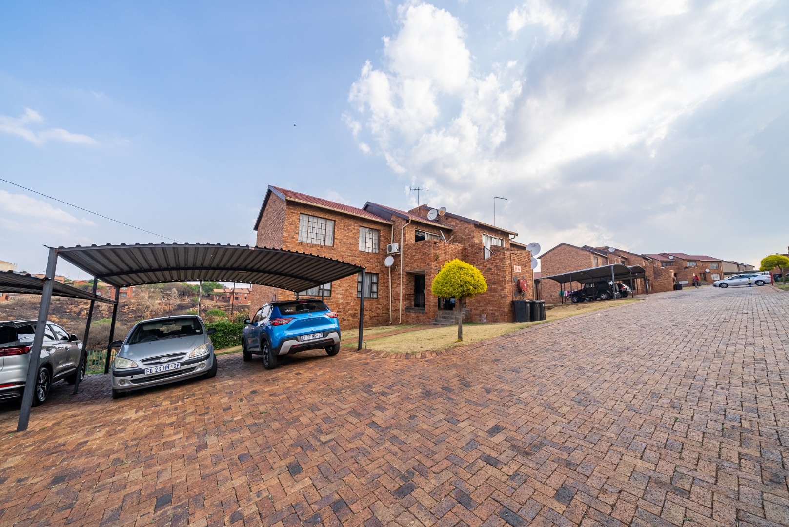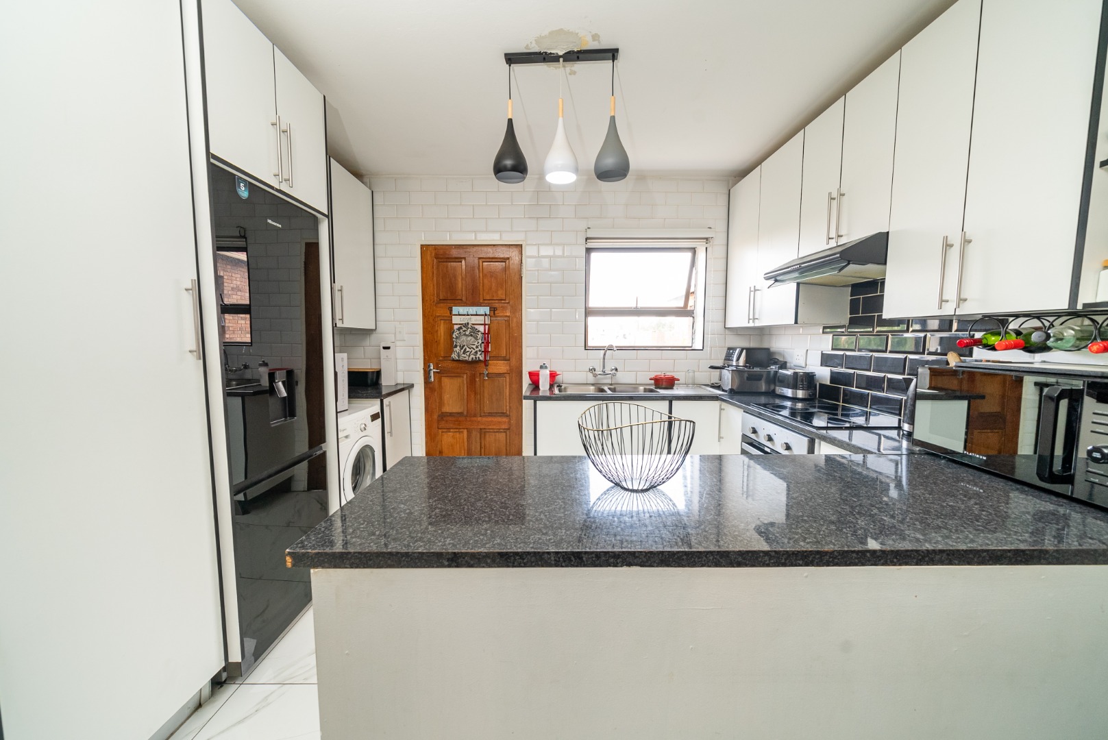 Discover contemporary living in this inviting 77 sqm residential sale property. The open-plan layout seamlessly integrates the lounge, dining area, and a stylish kitchen, creating a spacious and bright environment. Adorned with sleek white tiled flooring and light grey walls, the modern kitchen features white cabinetry, black countertops, a subway tile backsplash, and elegant pendant lighting. A contemporary TV feature wall and large sliding doors, equipped with security gates, enhance the living space, allowing for abundant natural light and easy access to the outdoors. This home offers three well-proportioned bedrooms and two modern bathrooms, including a private en-suite, plus a convenient guest toilet. Step outside to a private covered patio, perfect for outdoor enjoyment. The property features durable brick construction, brick-paved driveways, and dedicated covered parking for two vehicles, ensuring practicality and ease of access. The neat and uniform brick exterior with modern dark-framed windows contributes to its appealing kerb side presence. Situated within a secure estate and gated community, this property offers peace of mind with 24-hour security, an access gate, security post, electric fencing, and an intercom system. Further enhancing security, the sliding doors are fitted with security gates. Fibre connectivity is available, catering to modern communication needs. Located in a cul-de-sac within the estate, it offers a tranquil setting away from through traffic. Key Features: * 3 Bedrooms, 2 Bathrooms (1 en-suite) * Open-plan living, dining, and modern kitchen * 77 sqm floor size * Covered patio with sliding security doors * Dedicated covered parking for 2 vehicles * Secure estate with 24-hour security and electric fencing * Fibre ready * Brick exterior with paved driveway