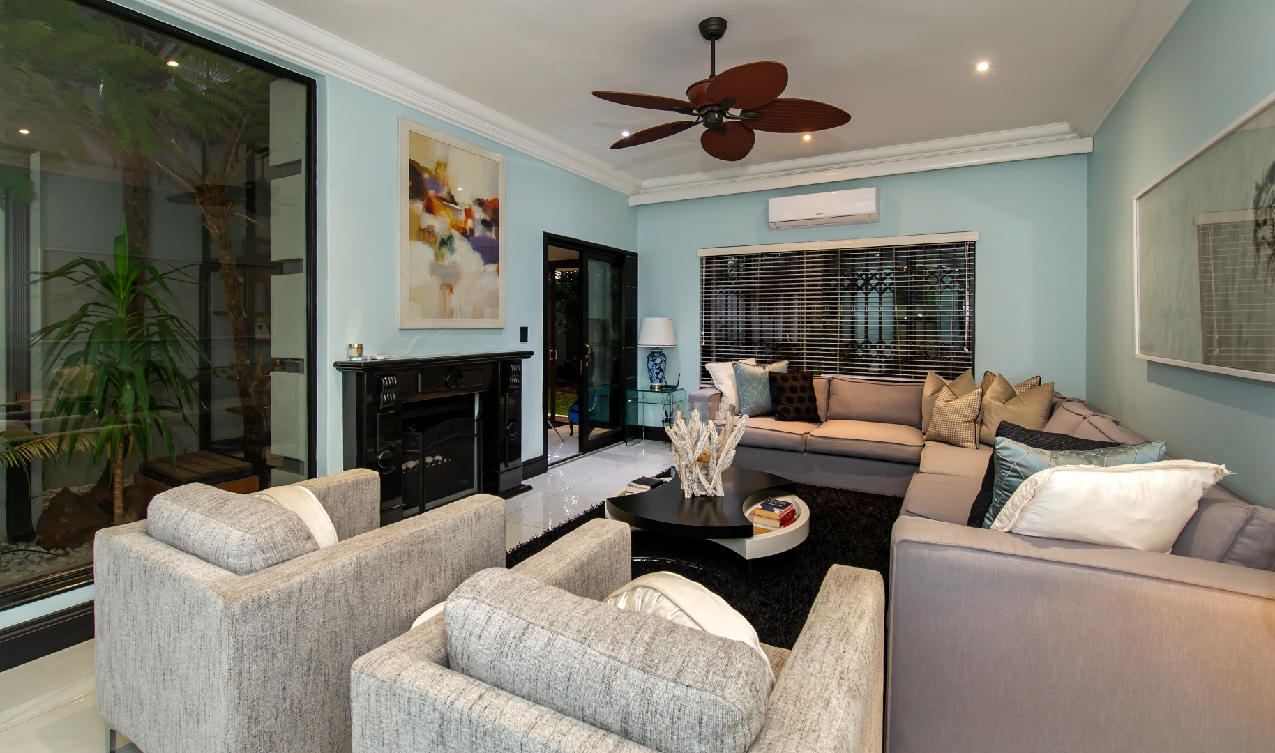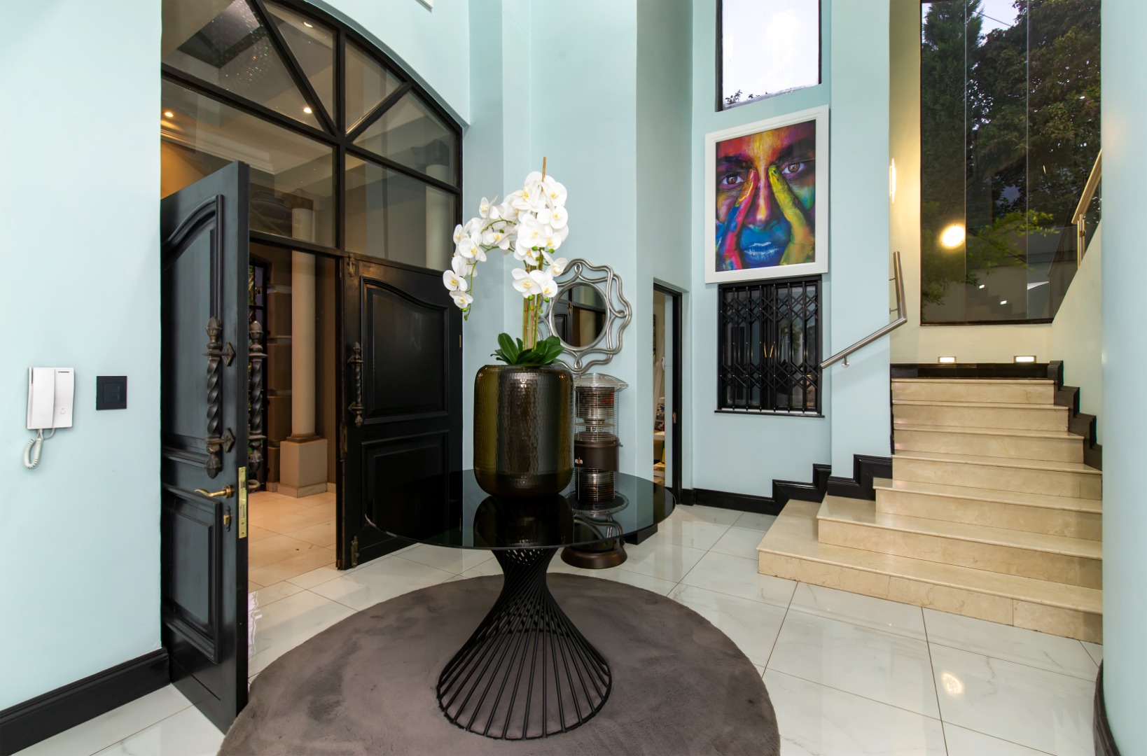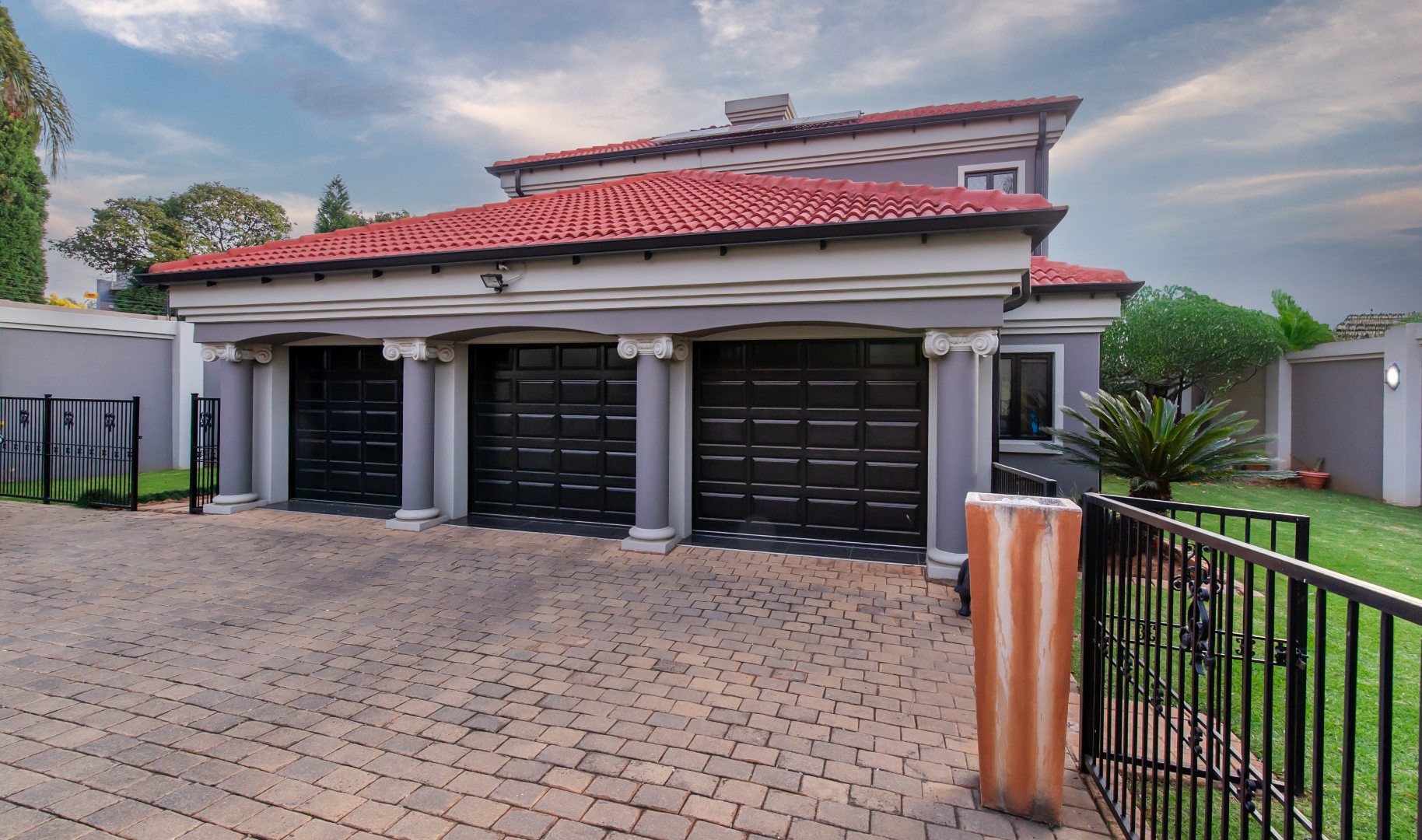 This smart home is equipped for contemporary living, with energy-efficient features including a full solar-powered inverter system. Additional amenities include three automated garages, full staff accommodation, and abundant secure visitor parking.