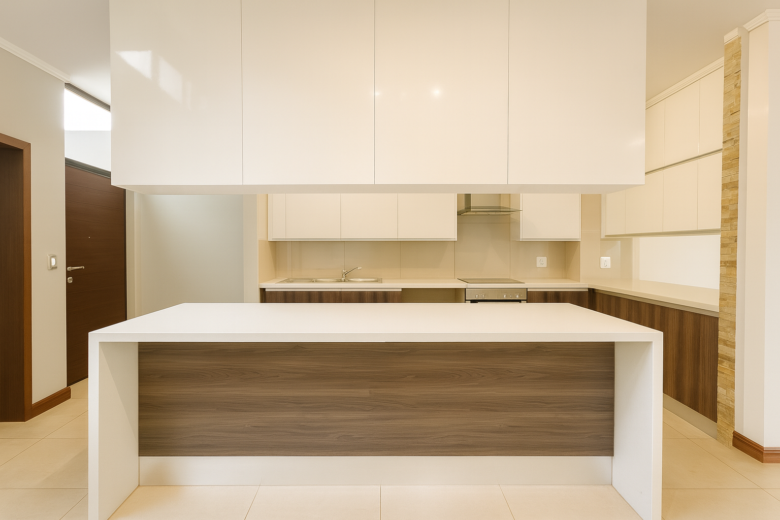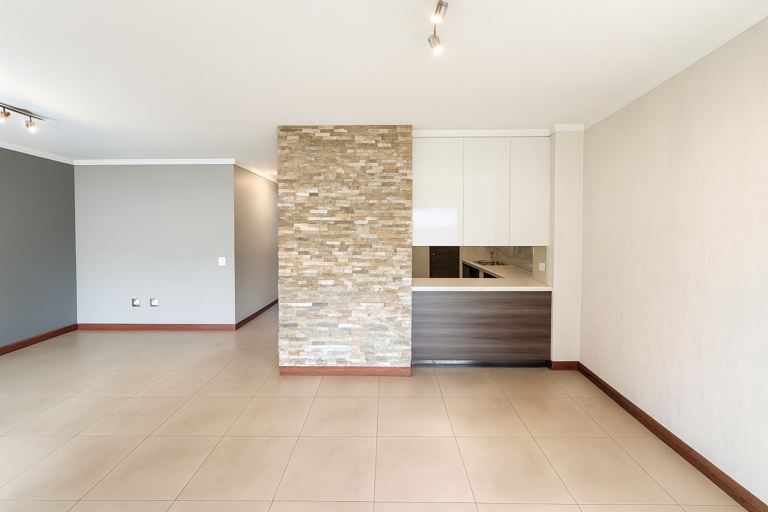 The interior boasts a sophisticated aesthetic with light-colored tiled flooring, neutral walls, and modern track lighting throughout. The main living area features a stylish stacked stone accent wall, creating a focal point. The modern kitchen is a chef's delight, showcasing clean lines, cream/white high-gloss cabinetry, wood-grain base cabinets, and a central island. Integrated appliances and extensive storage are further enhanced by a dedicated utility kitchen with a shelved pantry, ensuring functionality and elegance. A separate family TV room provides additional versatile living space.