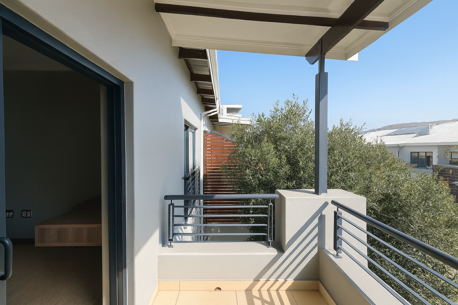Accommodation includes three well-proportioned bedrooms, with the main bedroom offering a private ensuite bathroom for ultimate comfort. A bright bedroom features hardwood flooring and direct access to a private outdoor area, while a convenient guest toilet serves the main living areas. The property's outdoor features are designed for relaxation and entertainment, including a covered patio with tiled flooring and an integrated built-in braai area, perfect for al fresco dining. This space opens to a private garden, offering a tranquil retreat, and pets are allowed.