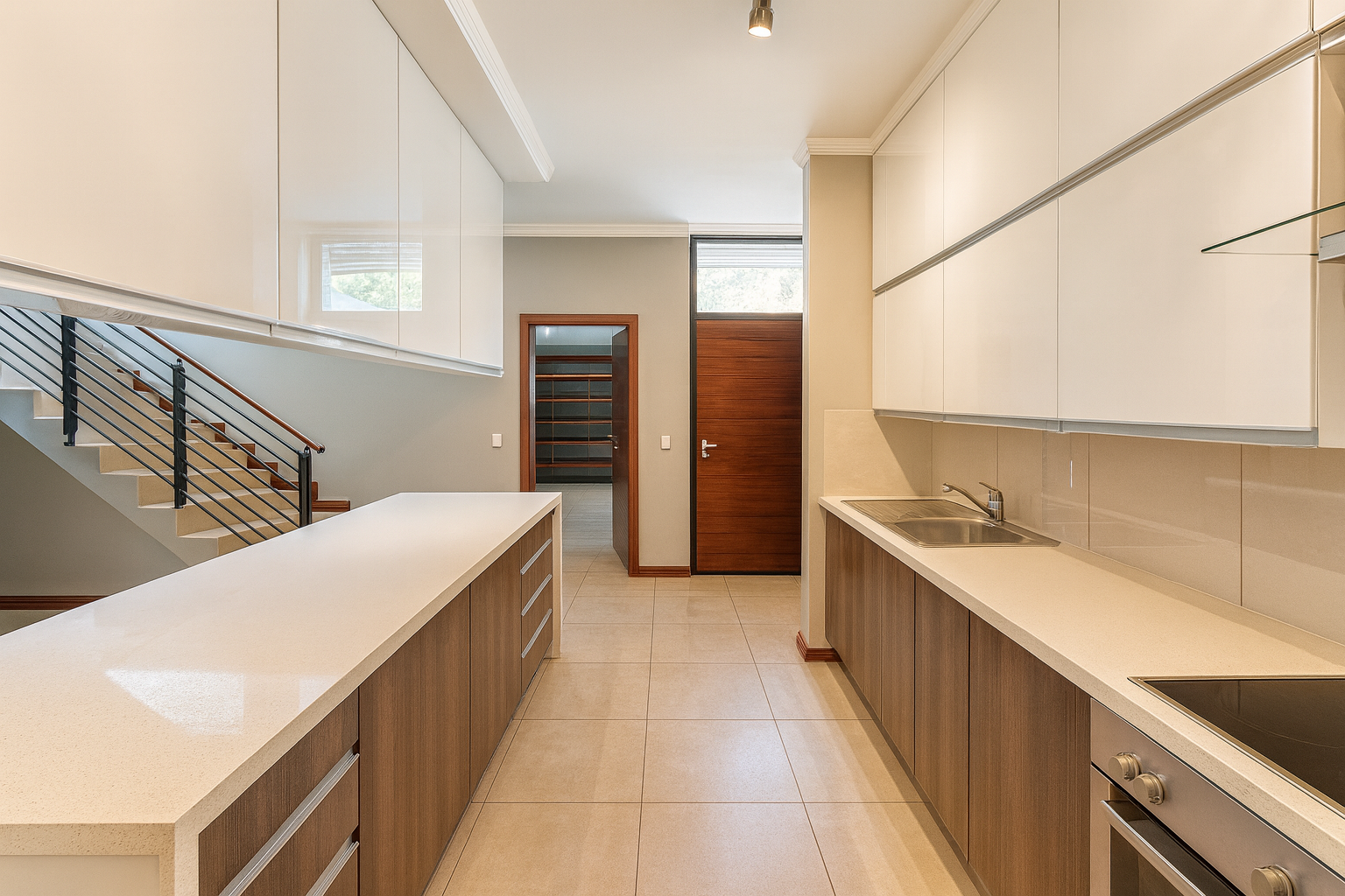 * Contemporary kitchen with island and pantry