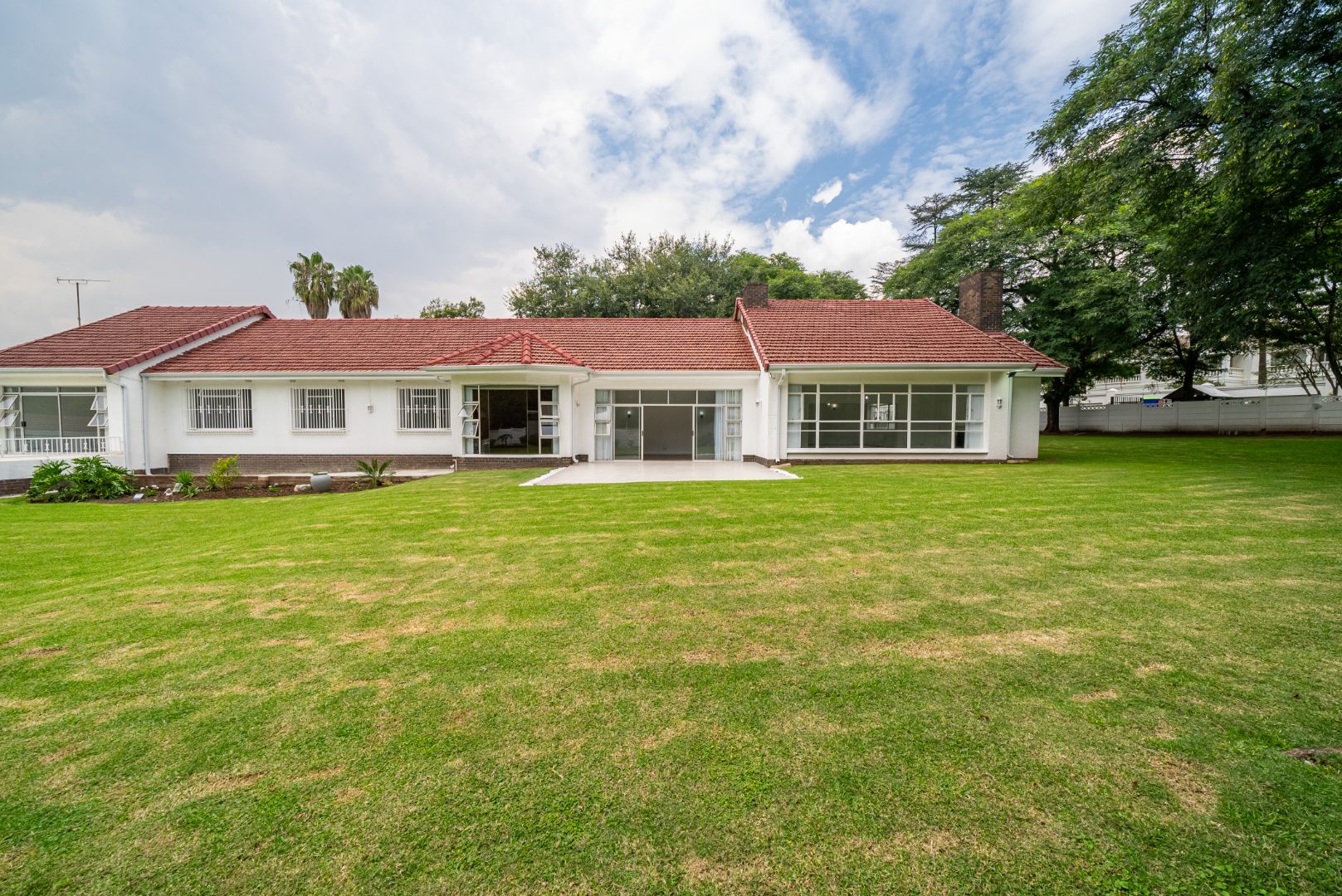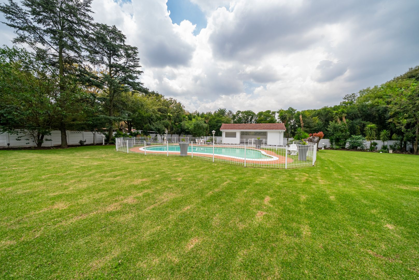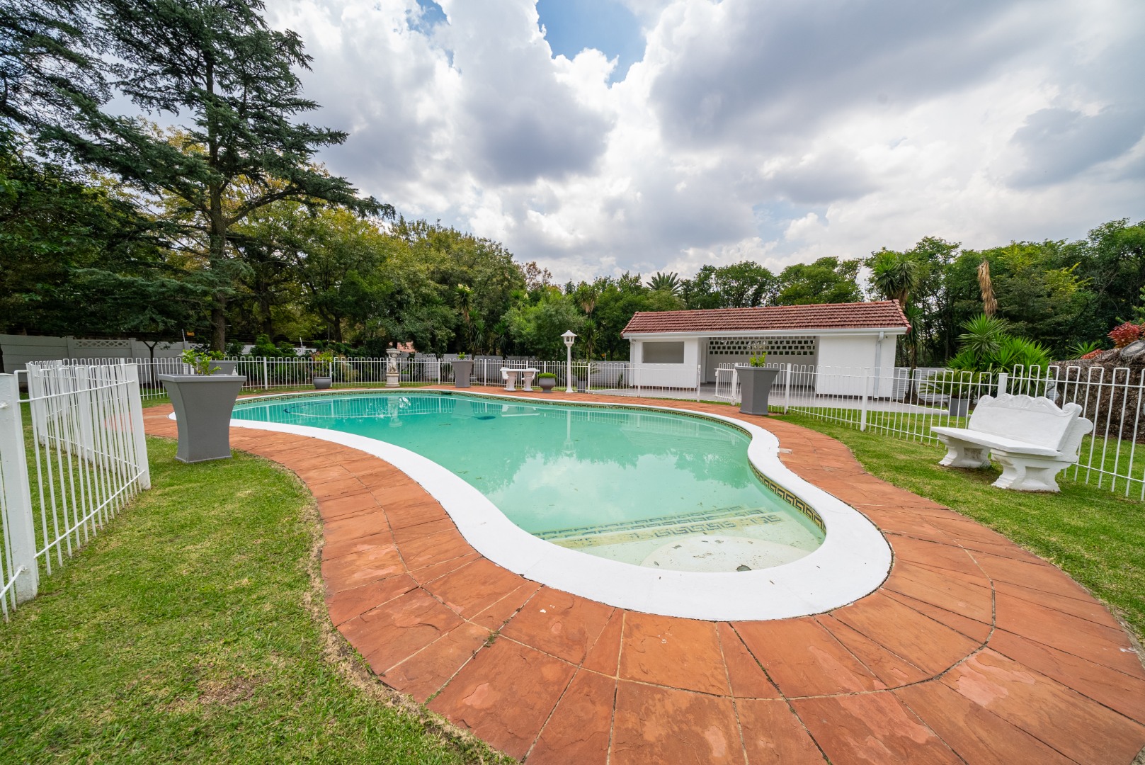 Designed for effortless living and entertaining, the home boasts multiple living areas, including two spacious lounges and an open-plan dining area with elegant parquet flooring. These areas flow seamlessly out to a well-established garden and an enclosed swimming pool, creating a serene and private outdoor retreat. A lapa and a separate bar area with its own bathroom further enhance the home’s entertainment appeal.