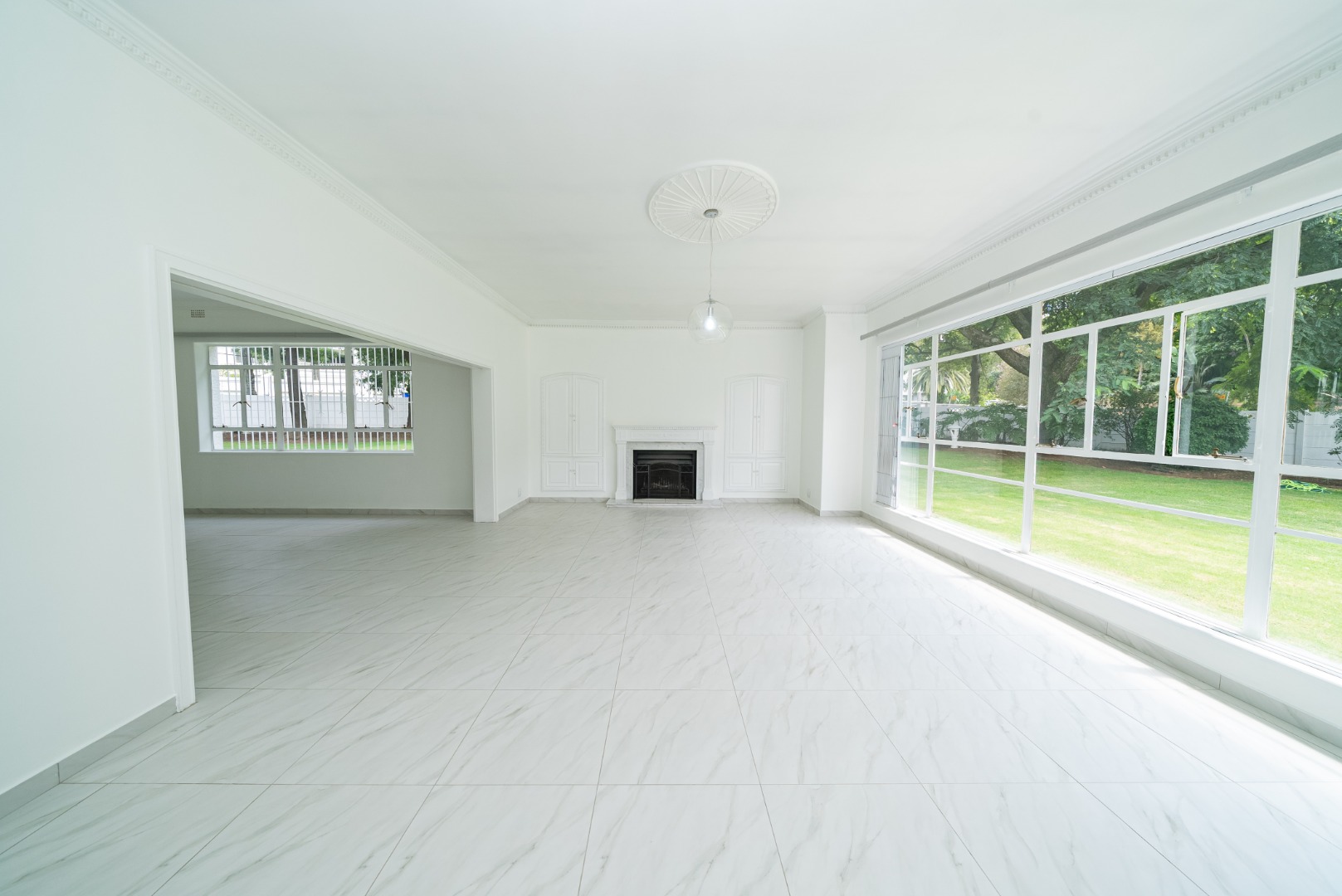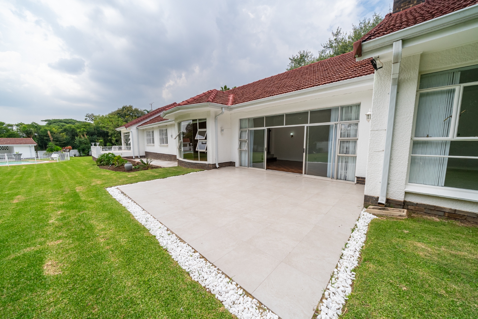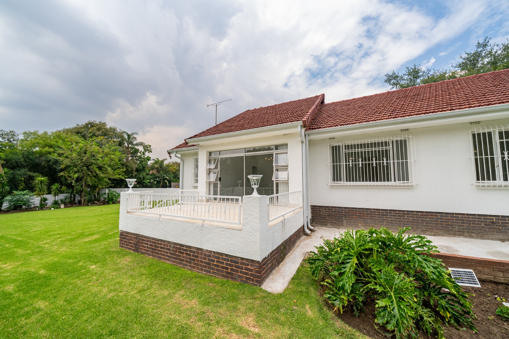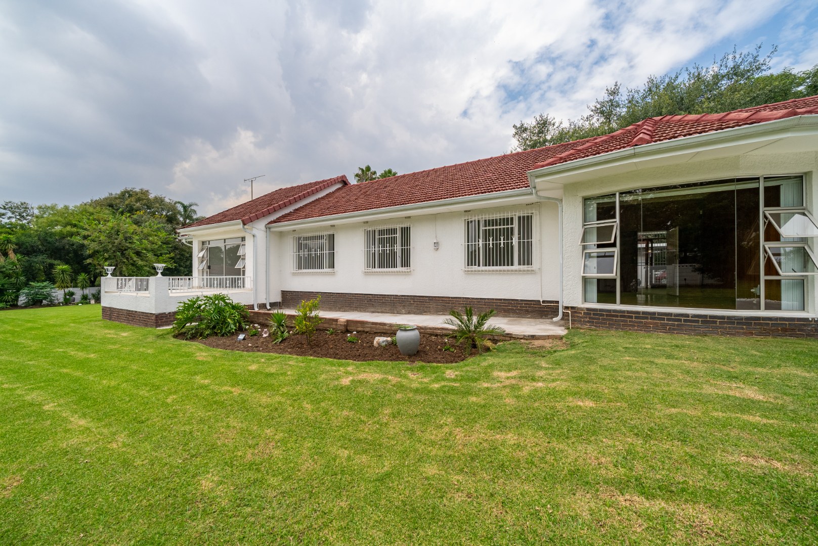 Designed for effortless living and entertaining, the home boasts multiple living areas, including two spacious lounges and an open-plan dining area with elegant parquet flooring. These areas flow seamlessly out to a well-established garden and an enclosed swimming pool, creating a serene and private outdoor retreat. A lapa and a separate bar area with its own bathroom further enhance the home’s entertainment appeal.