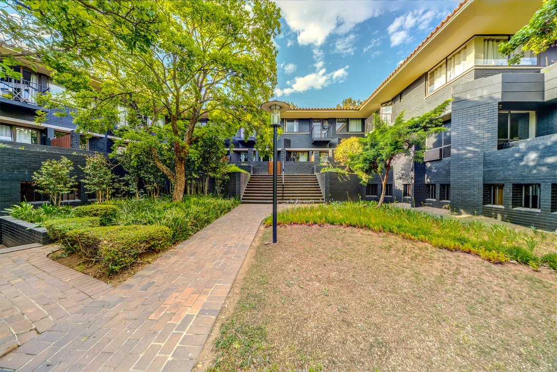 Both bedrooms benefit from en-suite bathrooms, providing ultimate privacy and comfort. Each room is neutrally decorated, featuring modern grey doors and ample natural light. The complex itself presents a striking kerb appeal with its modern architectural design, dark brick, concrete elements, and elevated glass walkways, all set amidst lush, well-maintained landscaping.