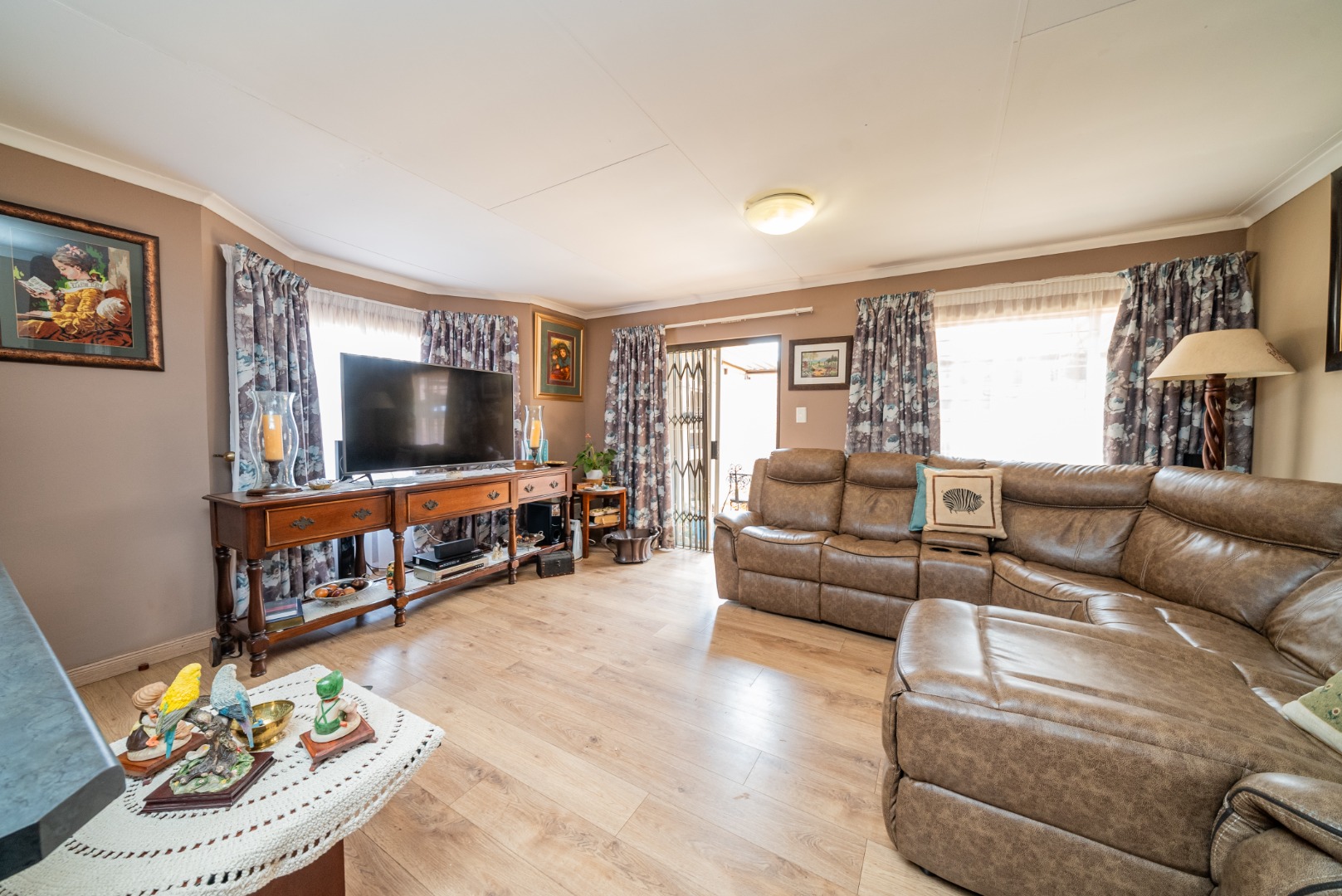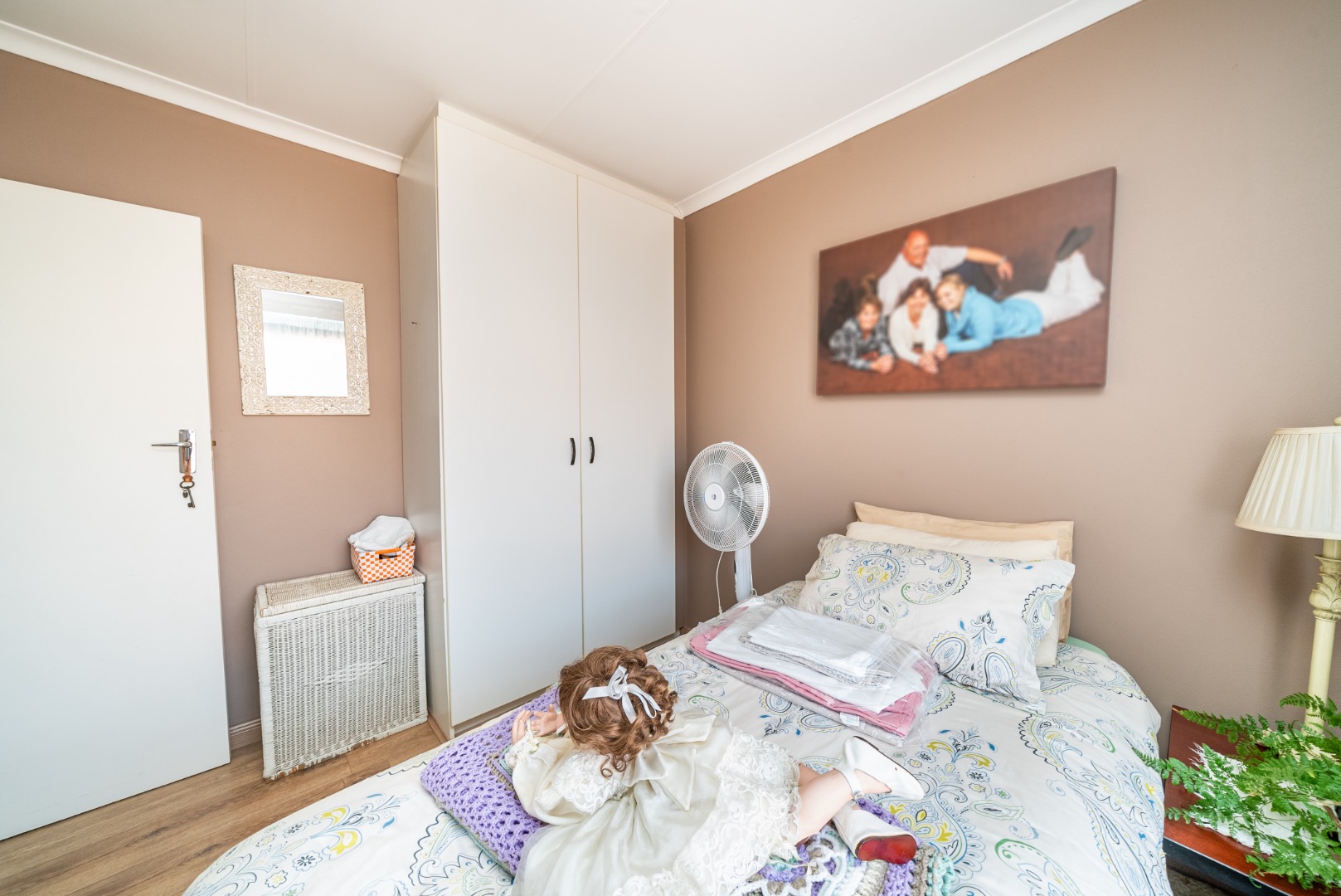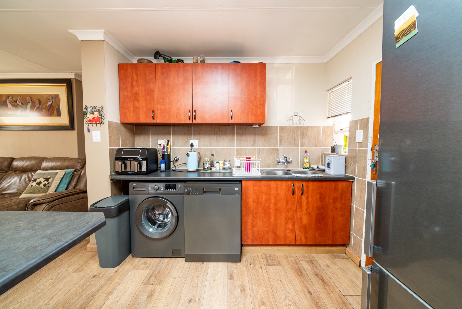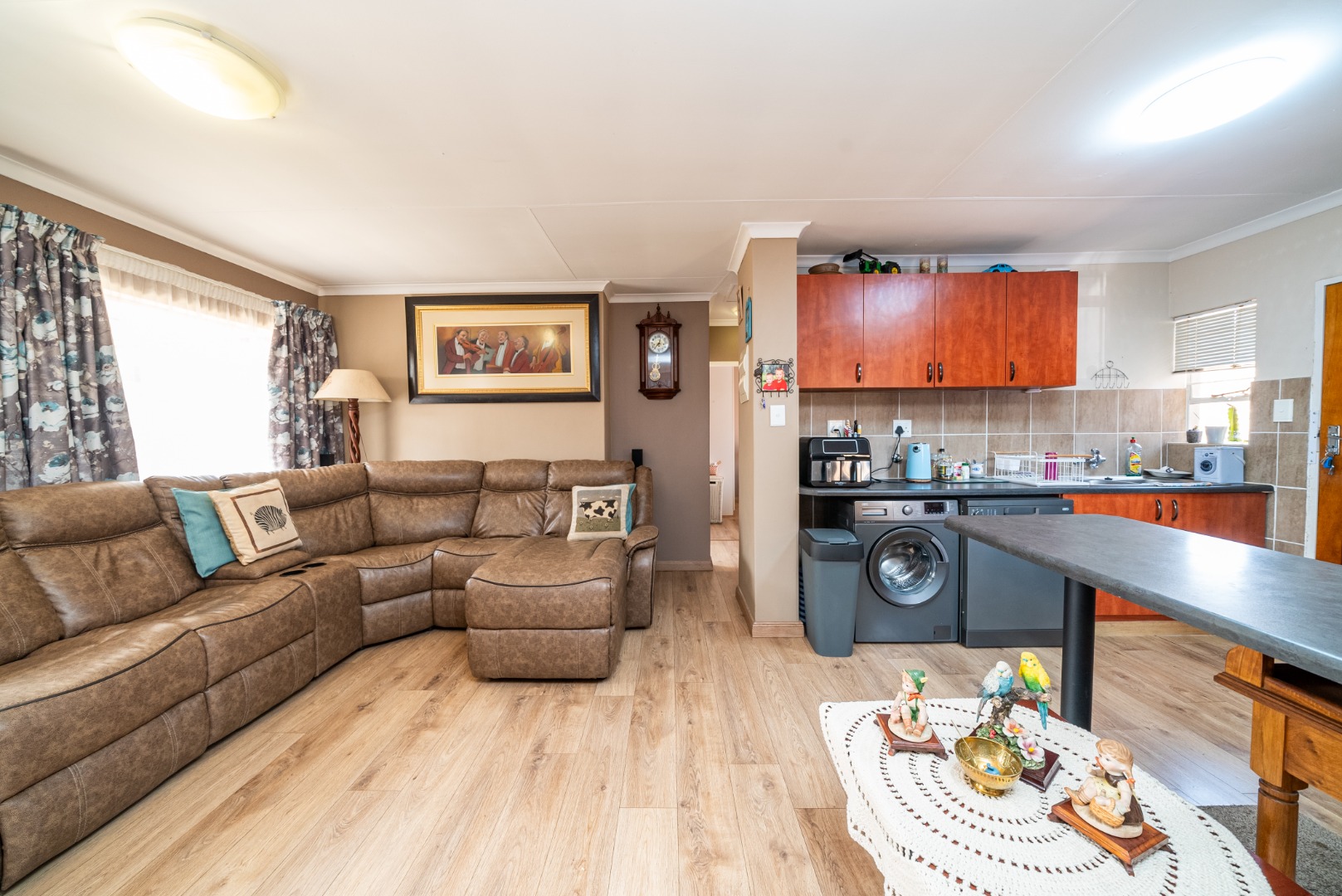 Inside, you’ll find 2 spacious laminated bedrooms with built-in cupboards and a full bathroom with shower-over-tub, basin, and loo. The open-plan kitchen accommodates 2 under-counter appliances and flows seamlessly into the dining and lounge area. From the lounge, doors open onto a sunny patio with a built-in braai – the perfect spot for relaxing or entertaining friends.