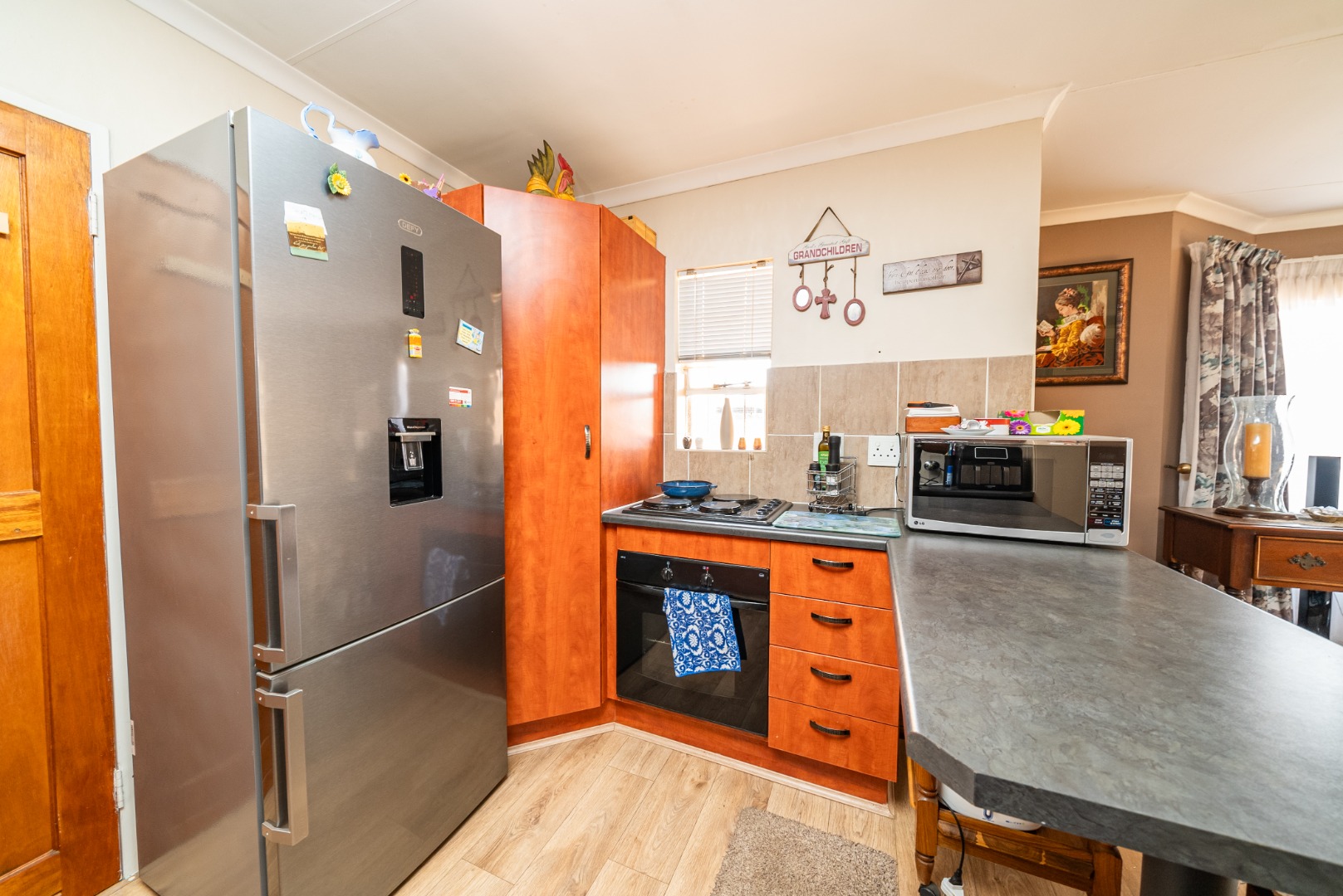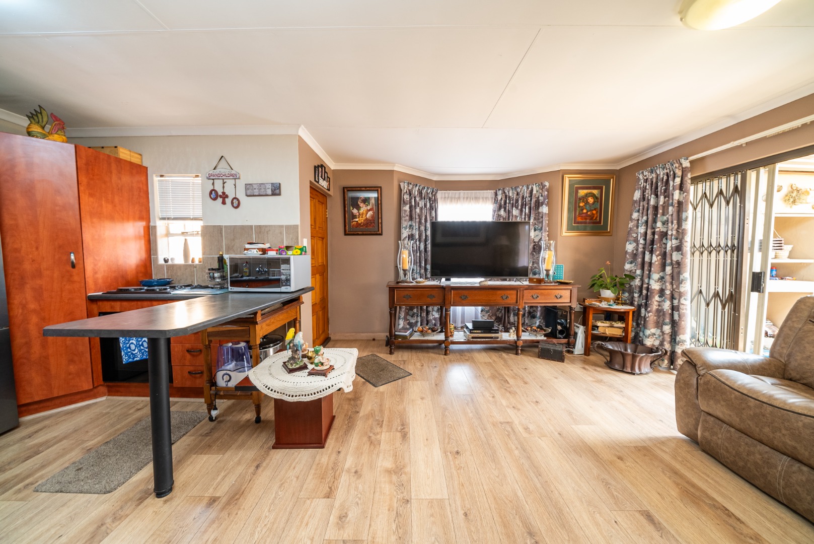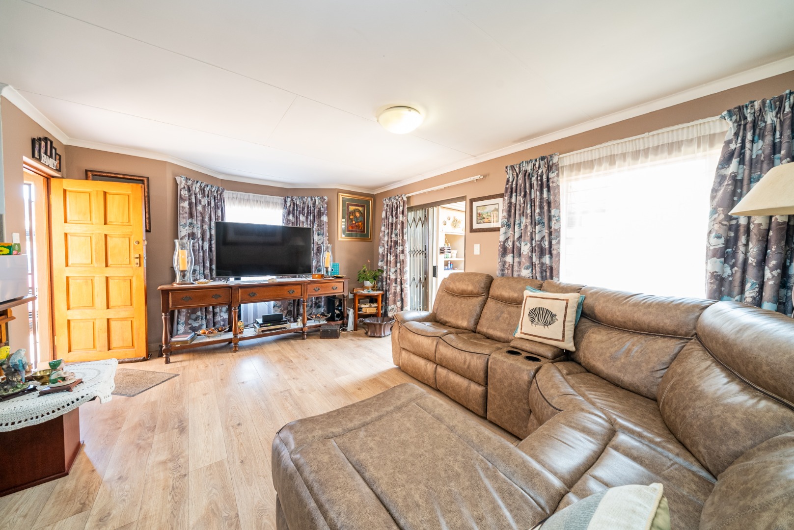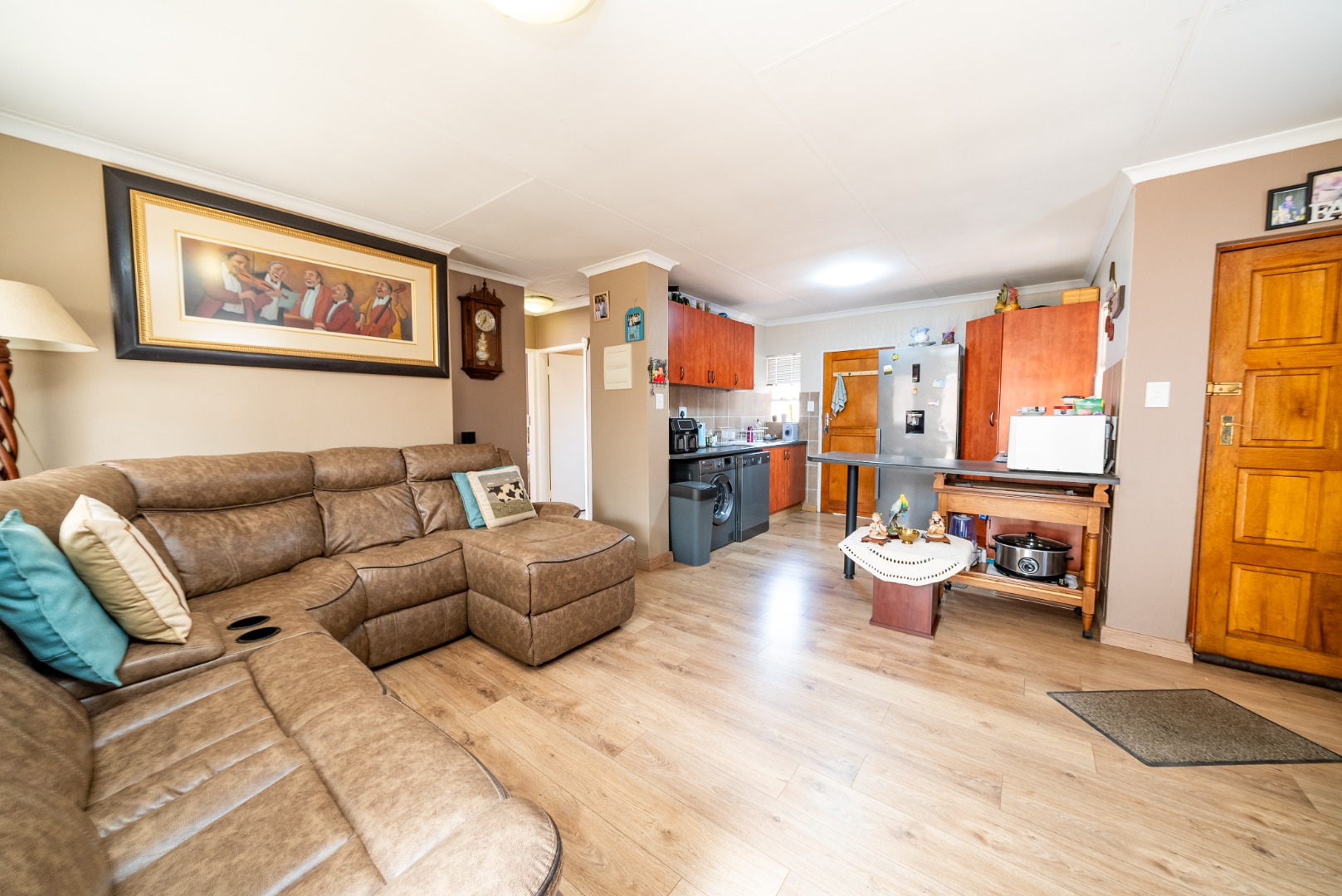 Inside, you’ll find 2 spacious laminated bedrooms with built-in cupboards and a full bathroom with shower-over-tub, basin, and loo. The open-plan kitchen accommodates 2 under-counter appliances and flows seamlessly into the dining and lounge area. From the lounge, doors open onto a sunny patio with a built-in braai – the perfect spot for relaxing or entertaining friends.