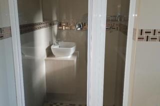 Open plan kitchen with double sink, extractor fan and breakfast nook