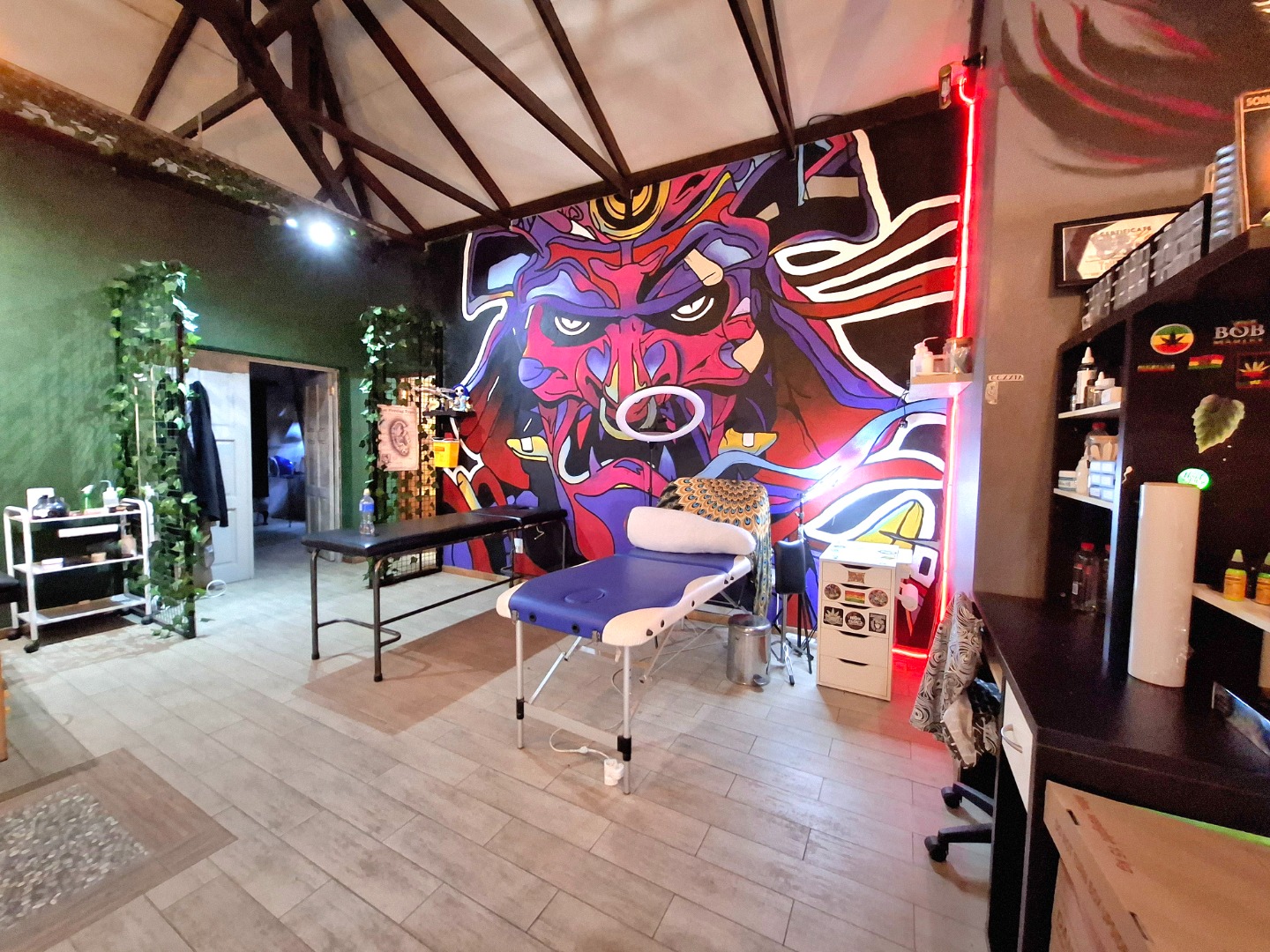 A highlight is the inviting outdoor paved courtyard, complete with shaded seating areas, perfect for customer relaxation. The interior boasts operational features such as a well-equipped kitchen with a traditional brick-built pizza oven, alongside a spacious common area featuring eclectic decor