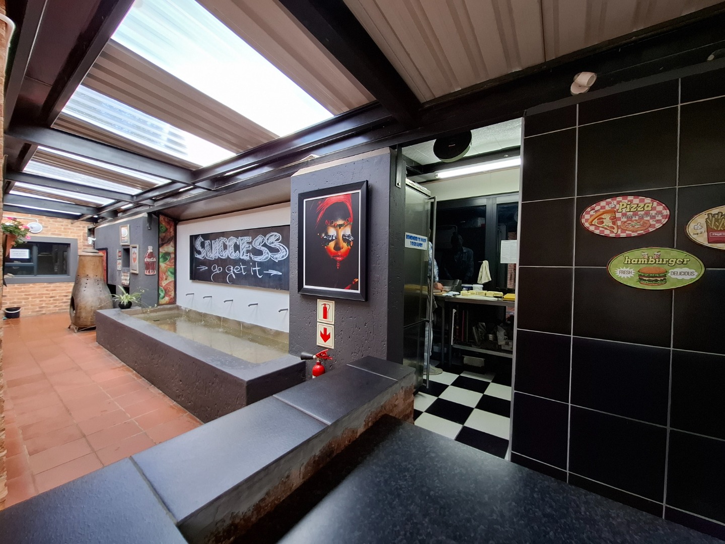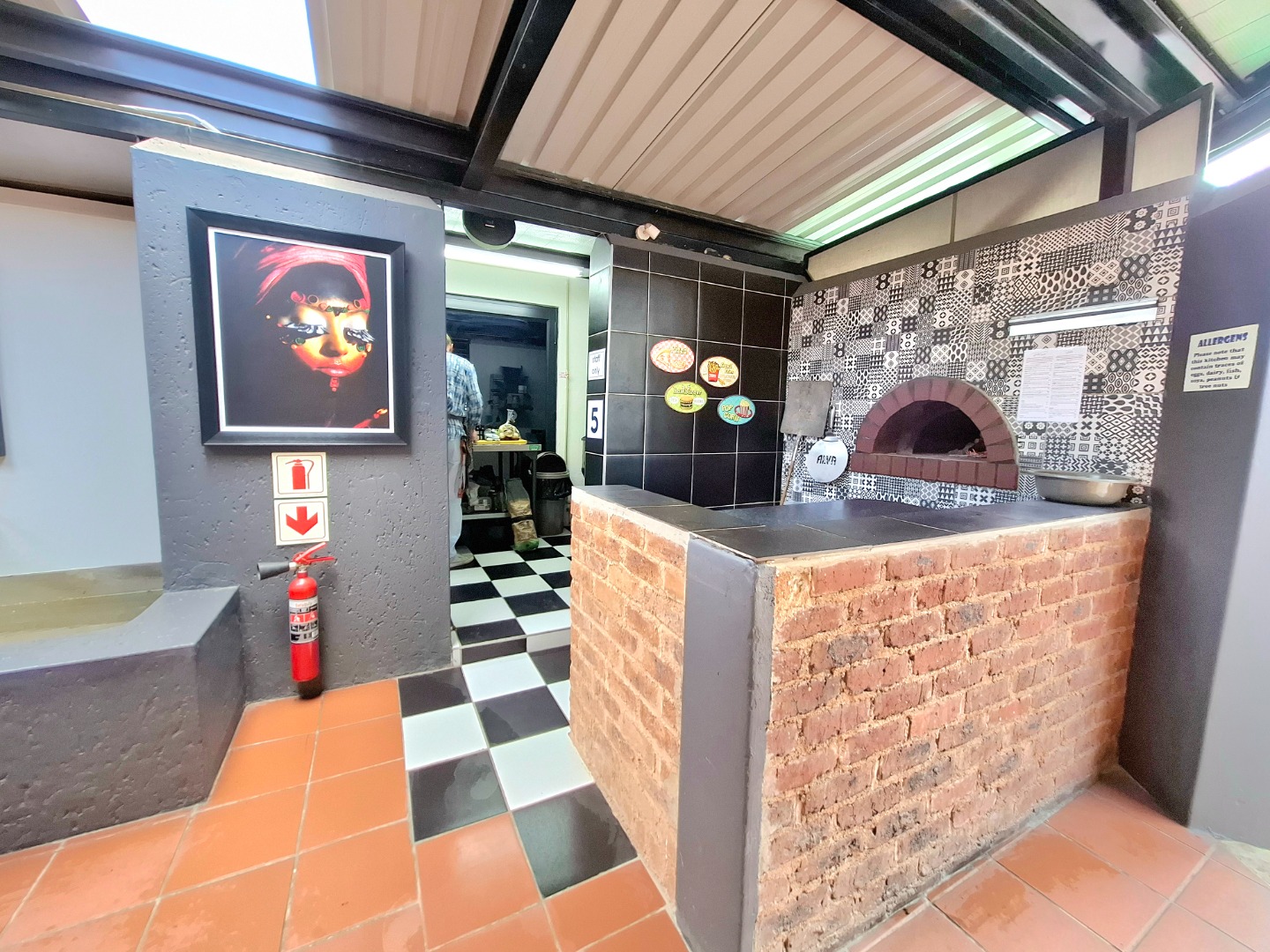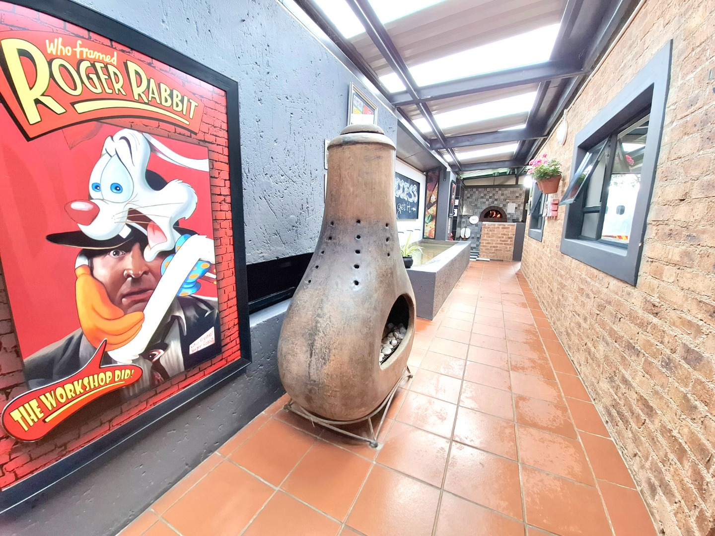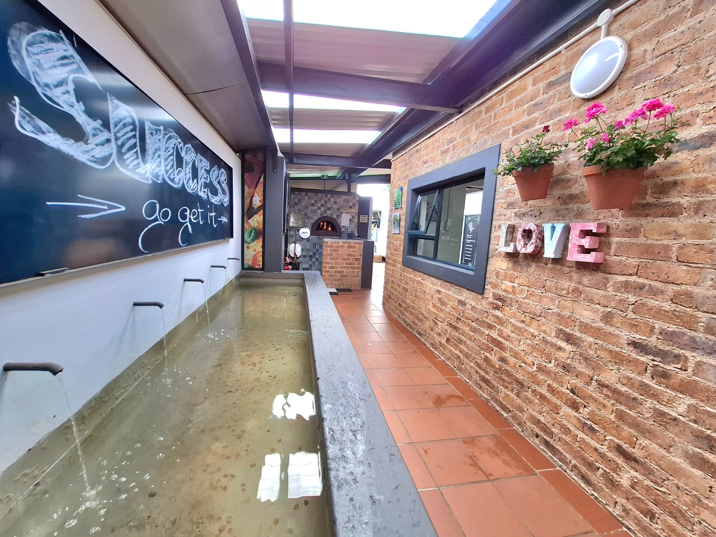 A highlight is the inviting outdoor paved courtyard, complete with shaded seating areas, perfect for customer relaxation. The interior boasts operational features such as a well-equipped kitchen with a traditional brick-built pizza oven, alongside a spacious common area featuring eclectic decor