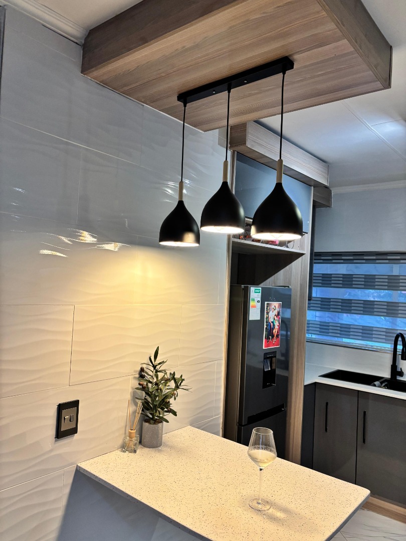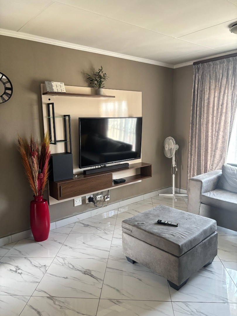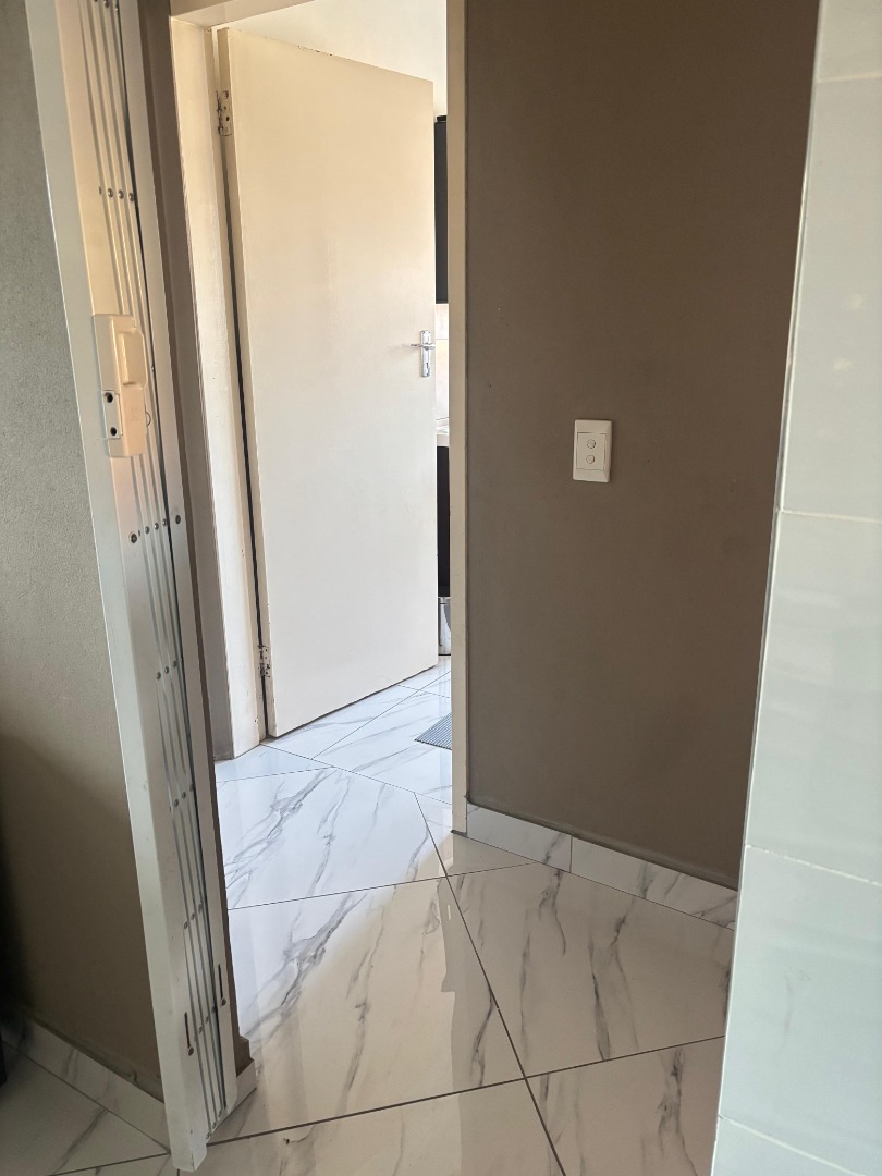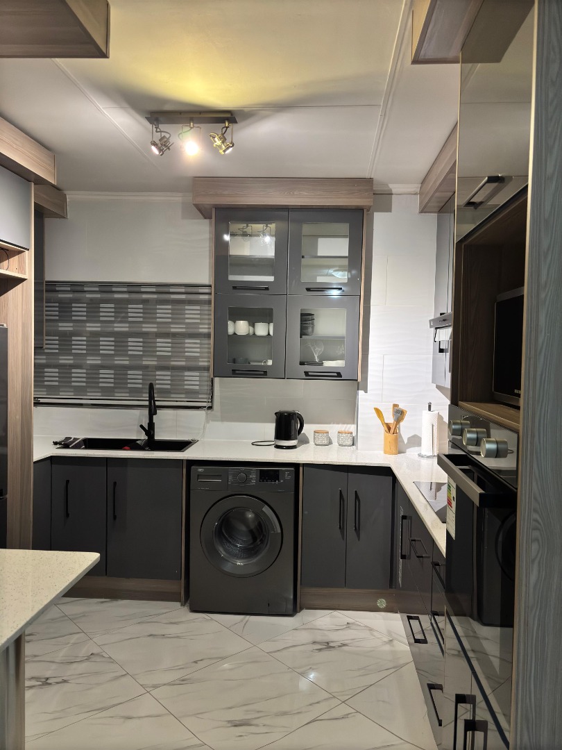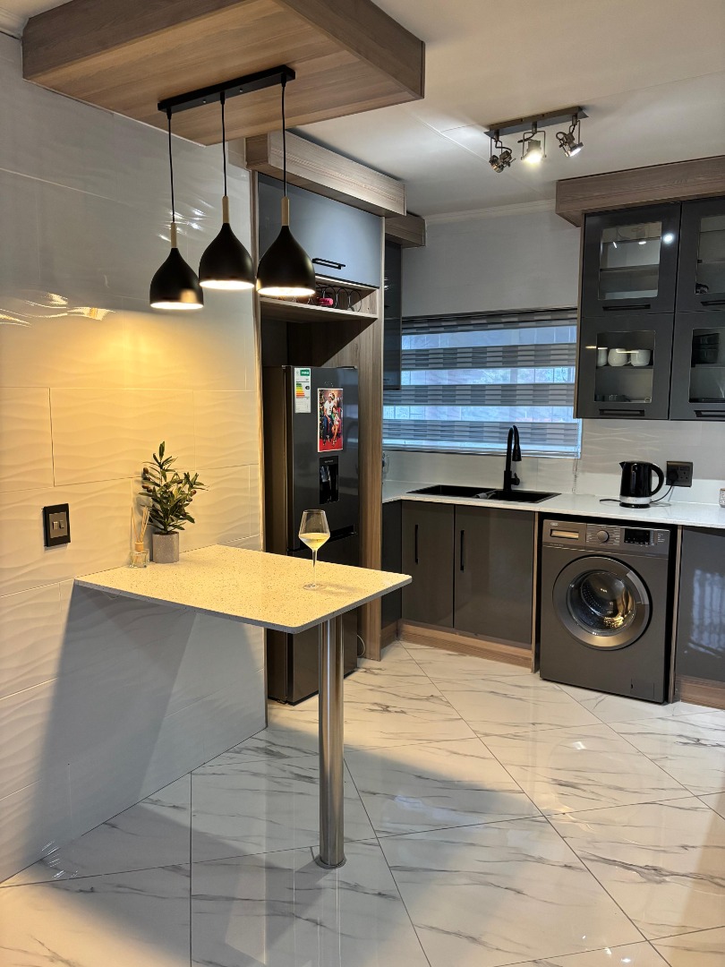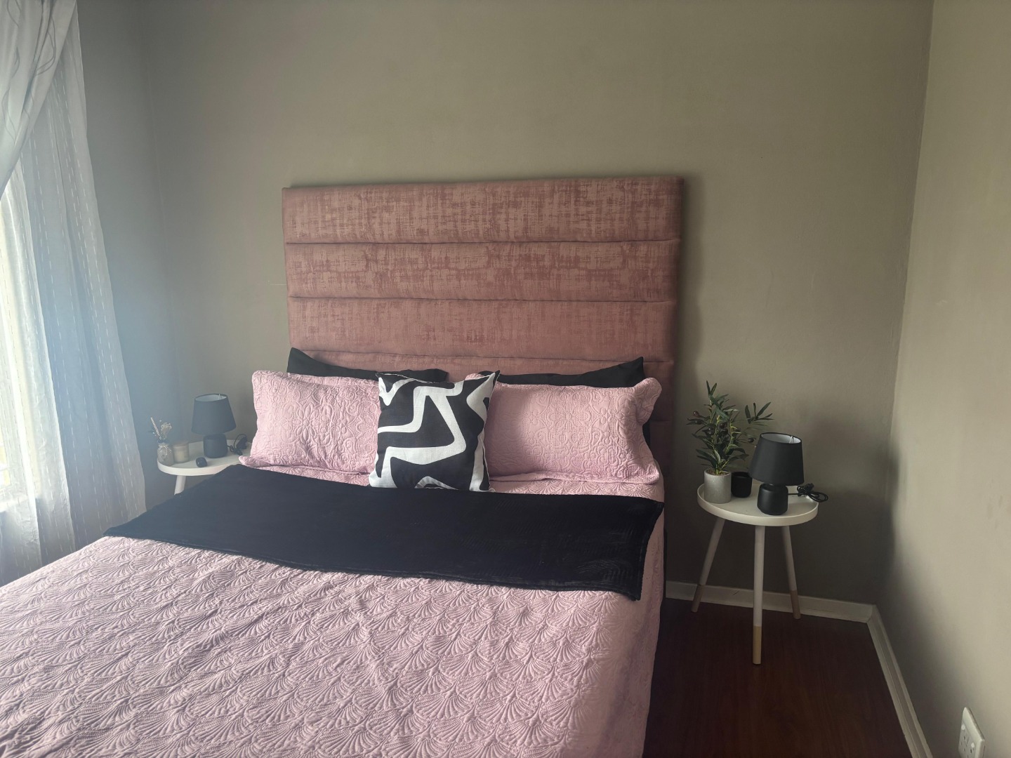 Take a look at this lovely 2-bedroom, 1-bathroom 1st floor apartment in Ravensklip, Boksburg. It’s got a super modern feel with sleek marble-look tiled flooring throughout, keeping things fresh and bright. The open-plan living area, featuring a cool wall-mounted TV setup and neutral walls, flows nicely into the kitchen. This kitchen is a real gem, boasting stylish dark grey cabinetry, white countertops, and integrated appliances like a washing machine, oven, and hob, plus a neat breakfast bar. The cozy main bedroom offers a chic pink upholstered headboard and warm wooden flooring. You'll also find two convenient parking spaces. Security bars on windows and a security gate provide peace of mind. This home offers a great suburban lifestyle in Boksburg, South Africa.