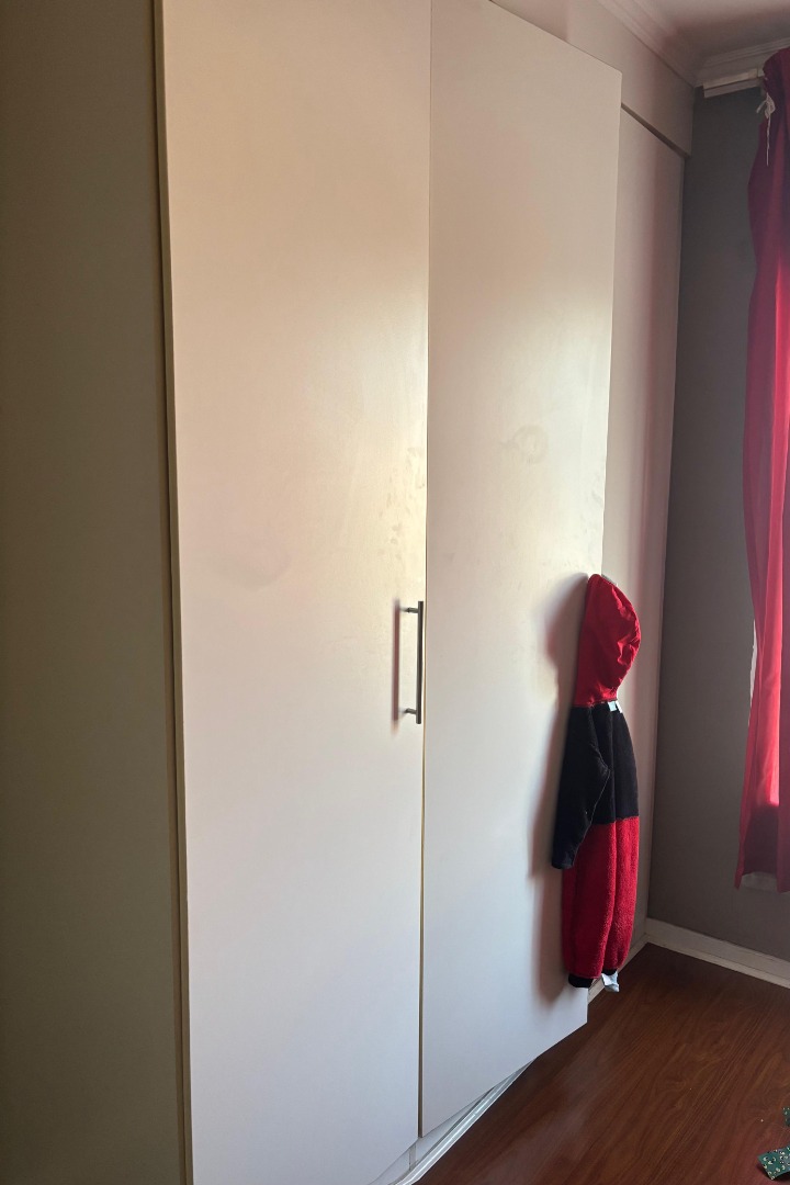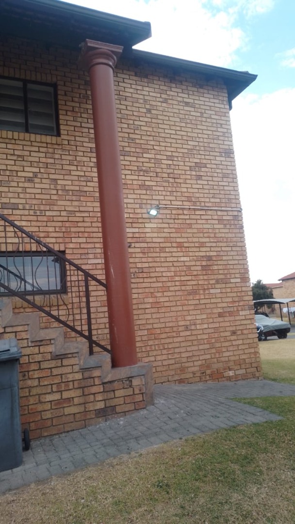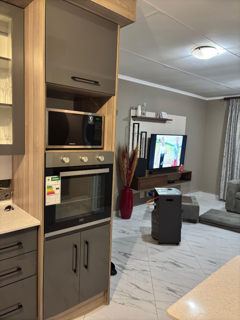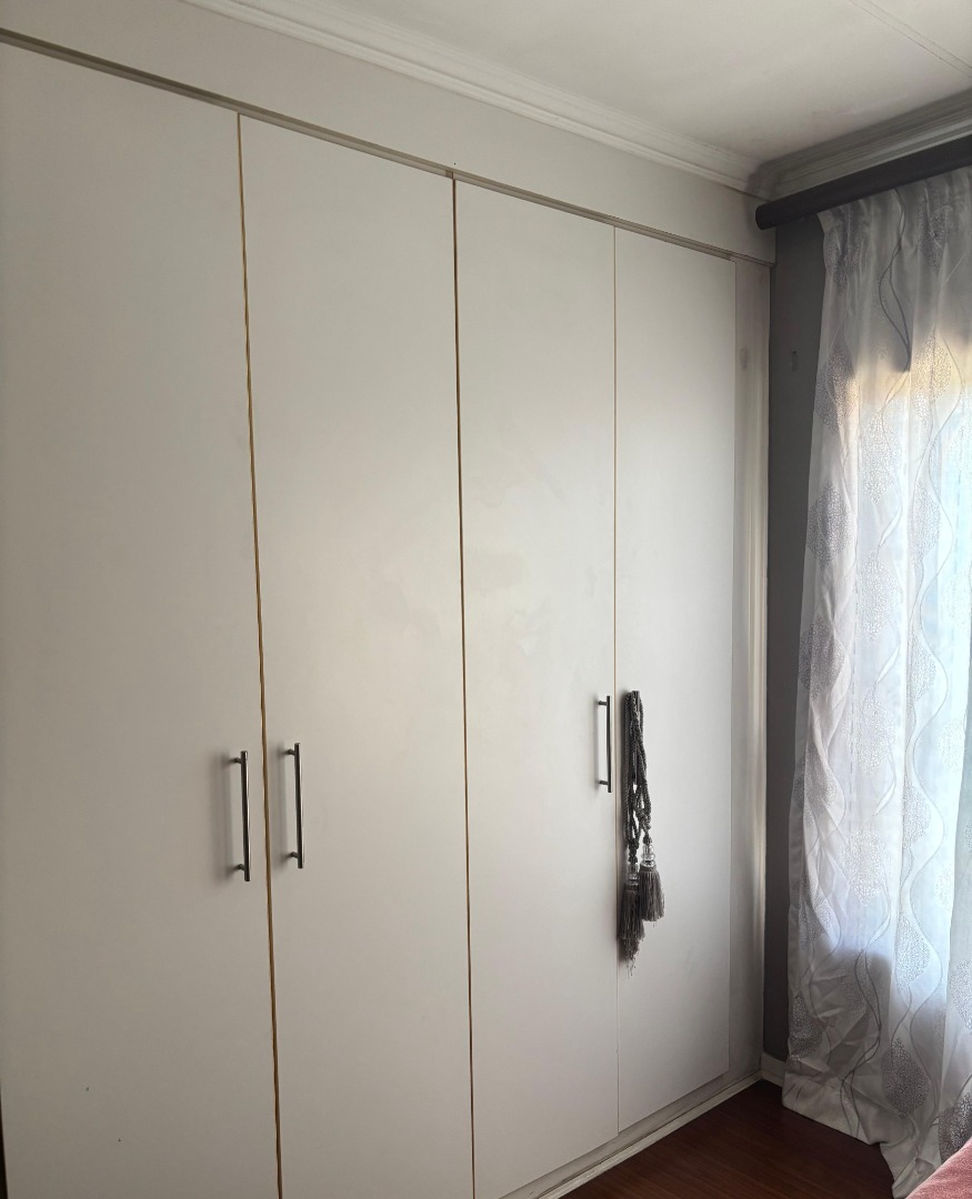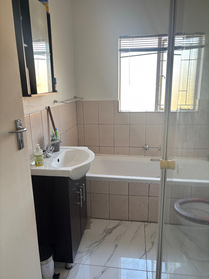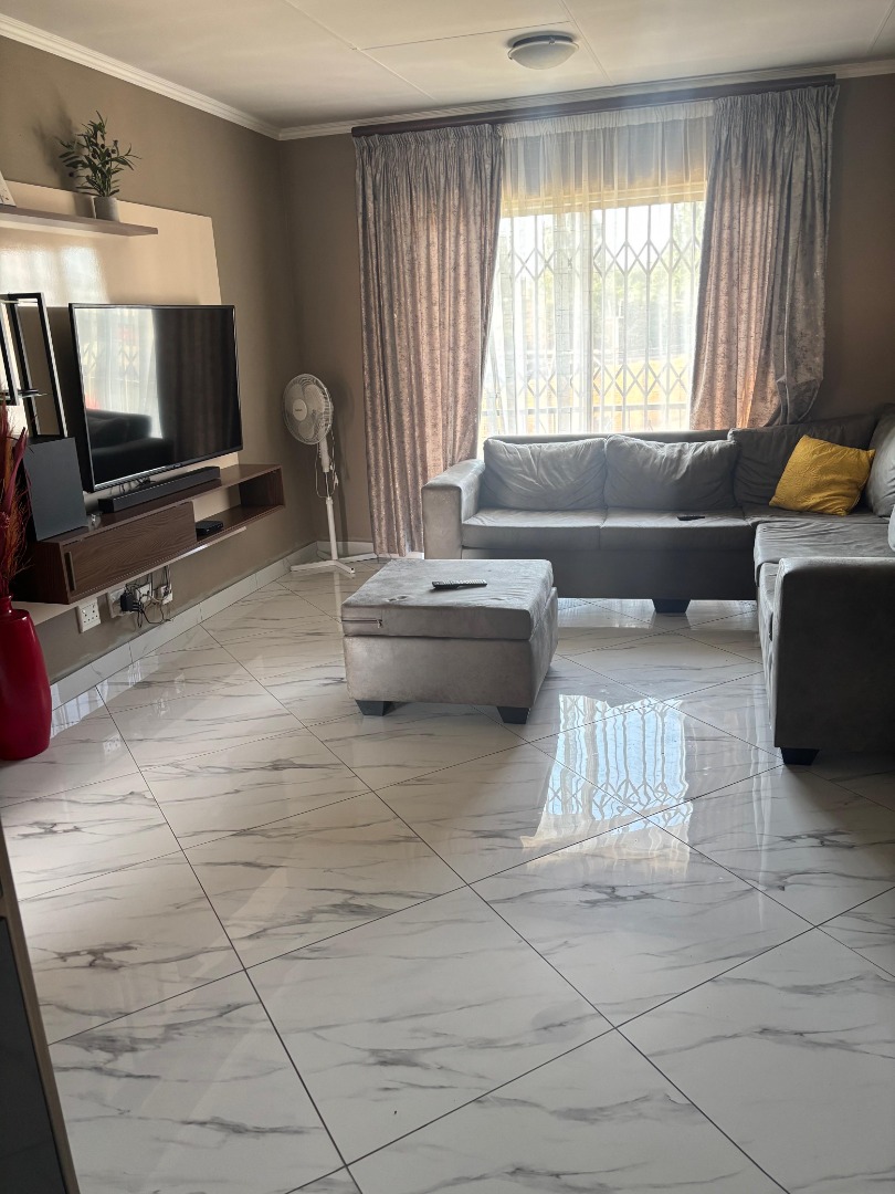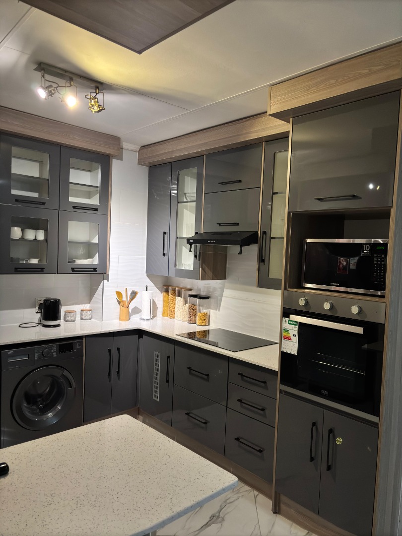 Take a look at this lovely 2-bedroom, 1-bathroom 1st floor apartment in Ravensklip, Boksburg. It’s got a super modern feel with sleek marble-look tiled flooring throughout, keeping things fresh and bright. The open-plan living area, featuring a cool wall-mounted TV setup and neutral walls, flows nicely into the kitchen. This kitchen is a real gem, boasting stylish dark grey cabinetry, white countertops, and integrated appliances like a washing machine, oven, and hob, plus a neat breakfast bar. The cozy main bedroom offers a chic pink upholstered headboard and warm wooden flooring. You'll also find two convenient parking spaces. Security bars on windows and a security gate provide peace of mind. This home offers a great suburban lifestyle in Boksburg, South Africa.
