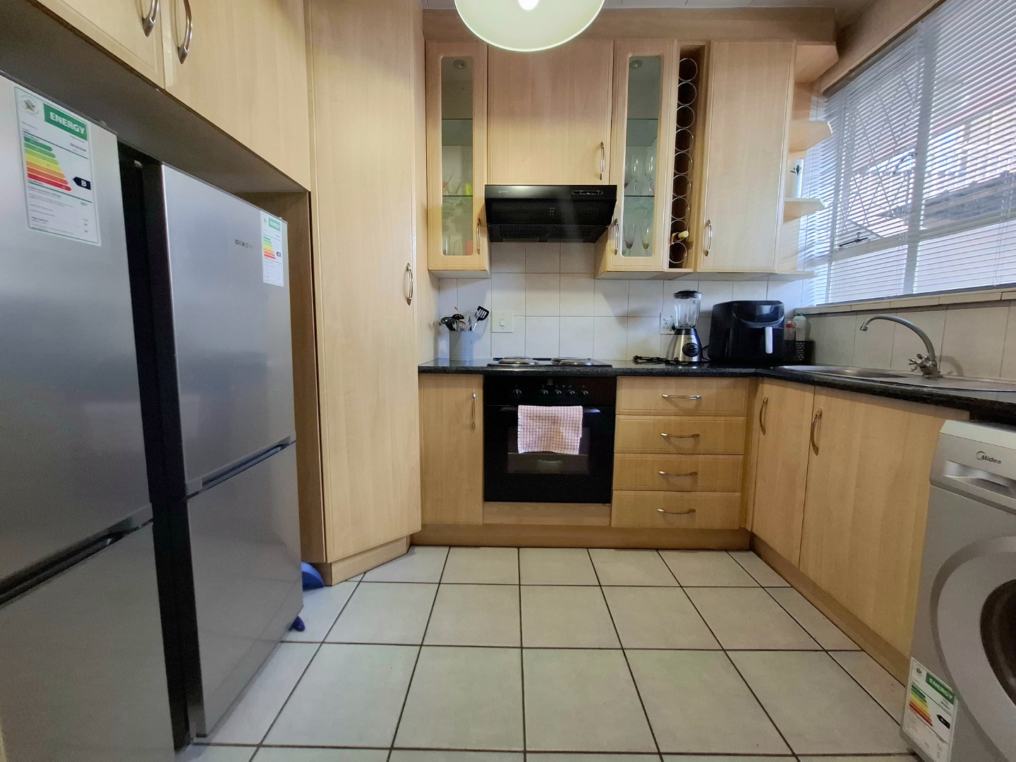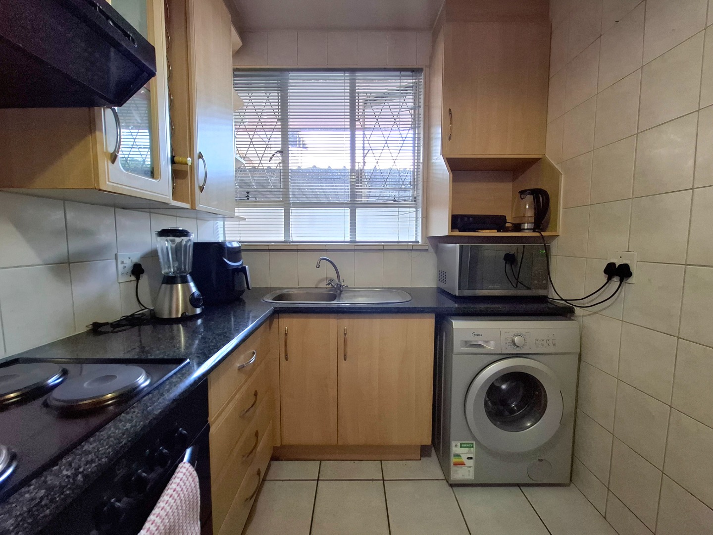 The kitchen is neat and practical, featuring light wood cabinets that offer ample storage, a built-in oven and stovetop, and even integrated space for your washing machine. You've got two cosy bedrooms, both boasting those easy-to-maintain tiled floors and plenty of natural light streaming in through large windows. Built-in wardrobes, which is always a bonus for keeping things tidy! A clean, functional bathroom serves both rooms, completing this comfortable home.