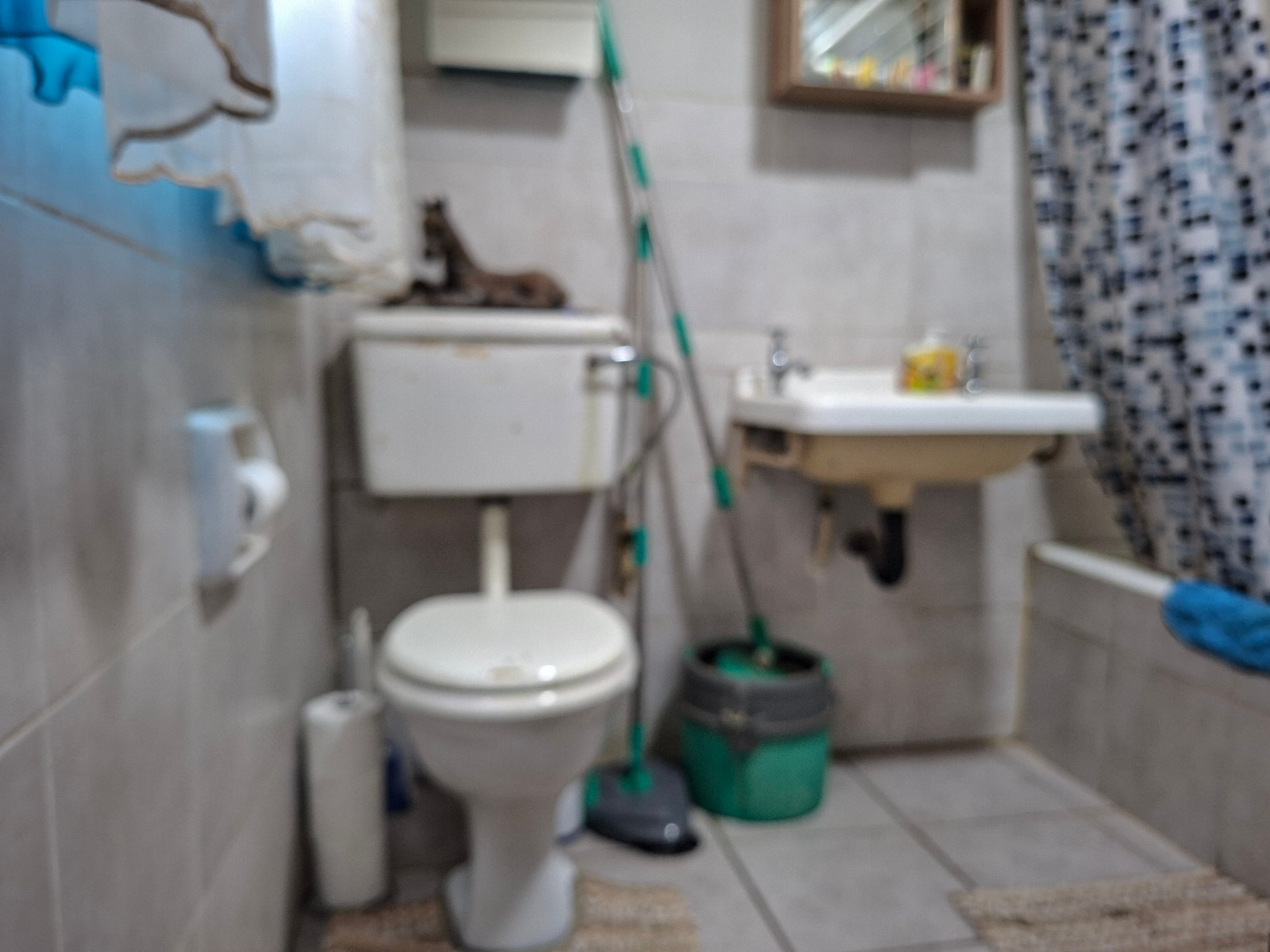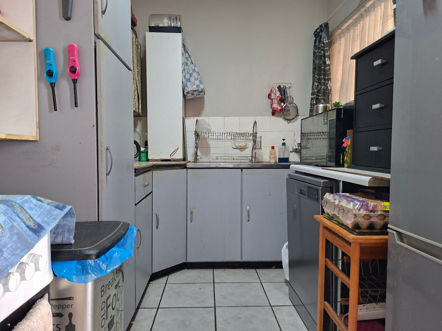 The kitchen is equipped with U-shaped cabinetry, an integrated stove, and a range hood, complemented by a tiled backsplash. The bathroom features modern tiling and fixtures, including a pedestal sink and toilet. Built-in cupboards offer storage solutions, though some areas may benefit from refurbishment.