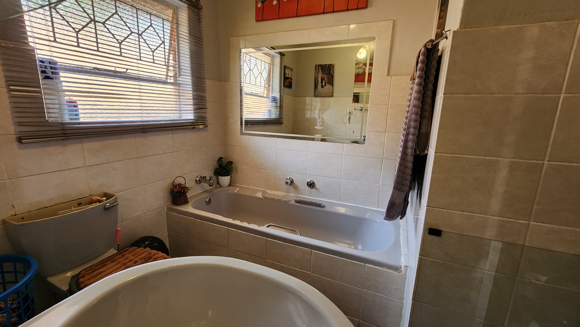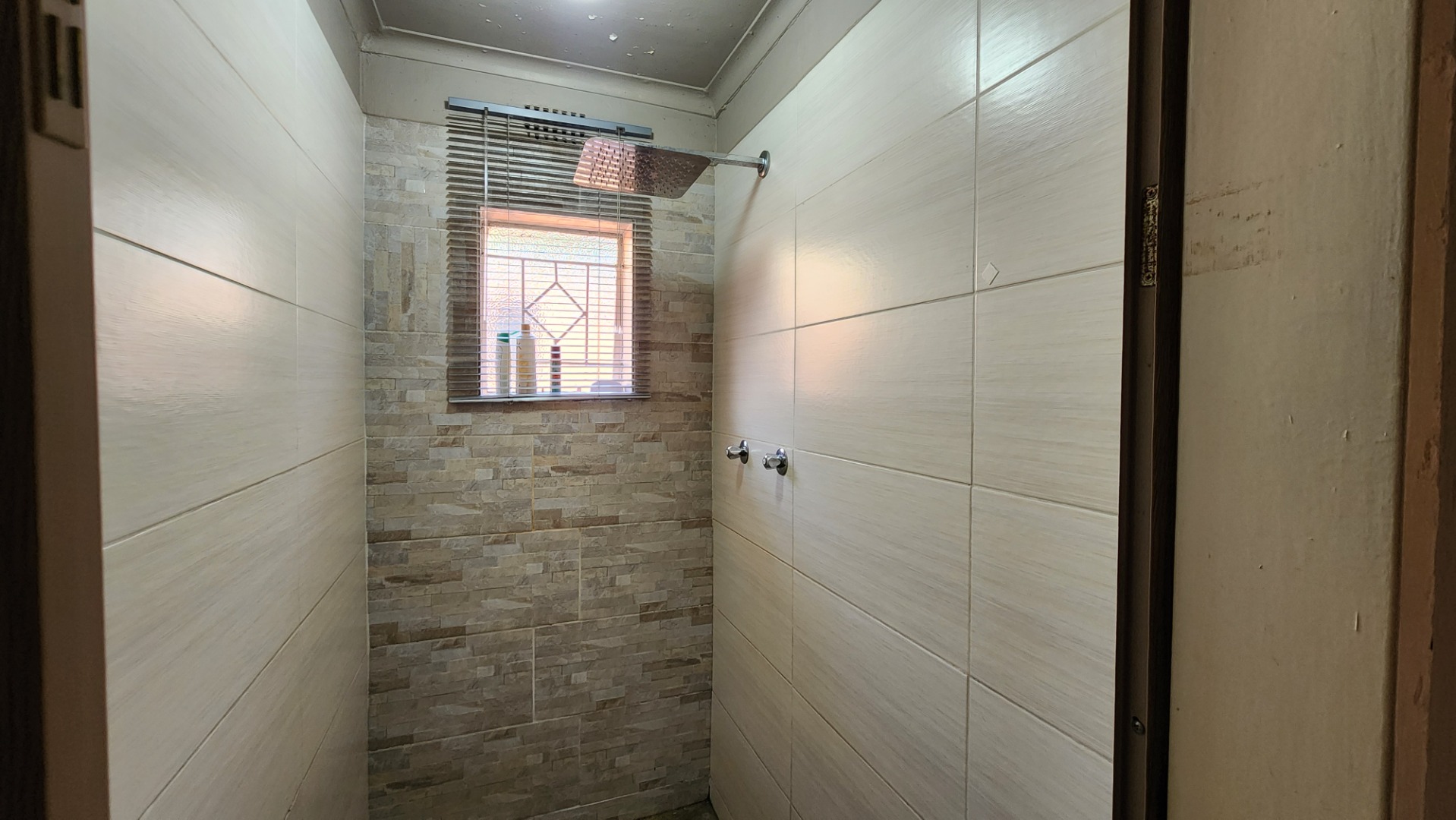Both bedrooms are tiled and fitted with security bars, while the bathroom includes a bath, toilet, and a separate shower with a modern rain showerhead.
