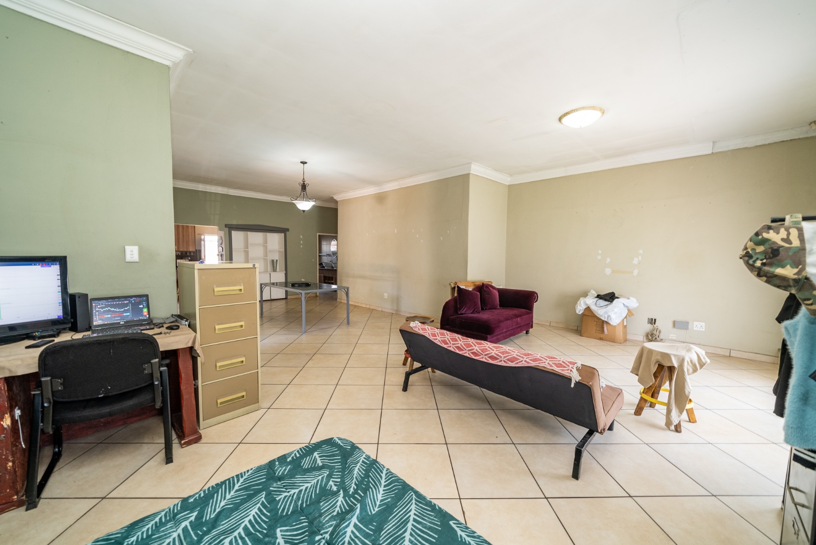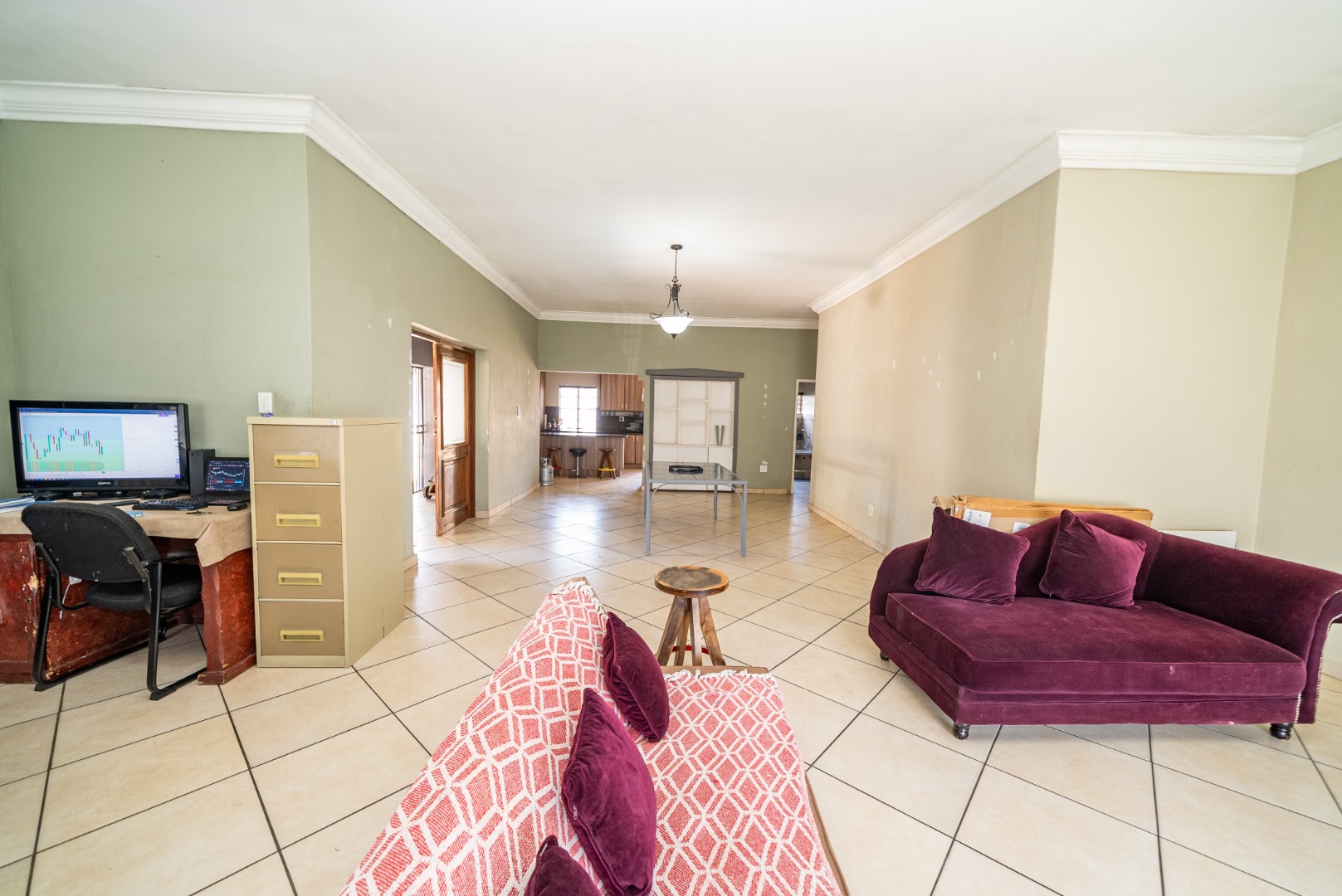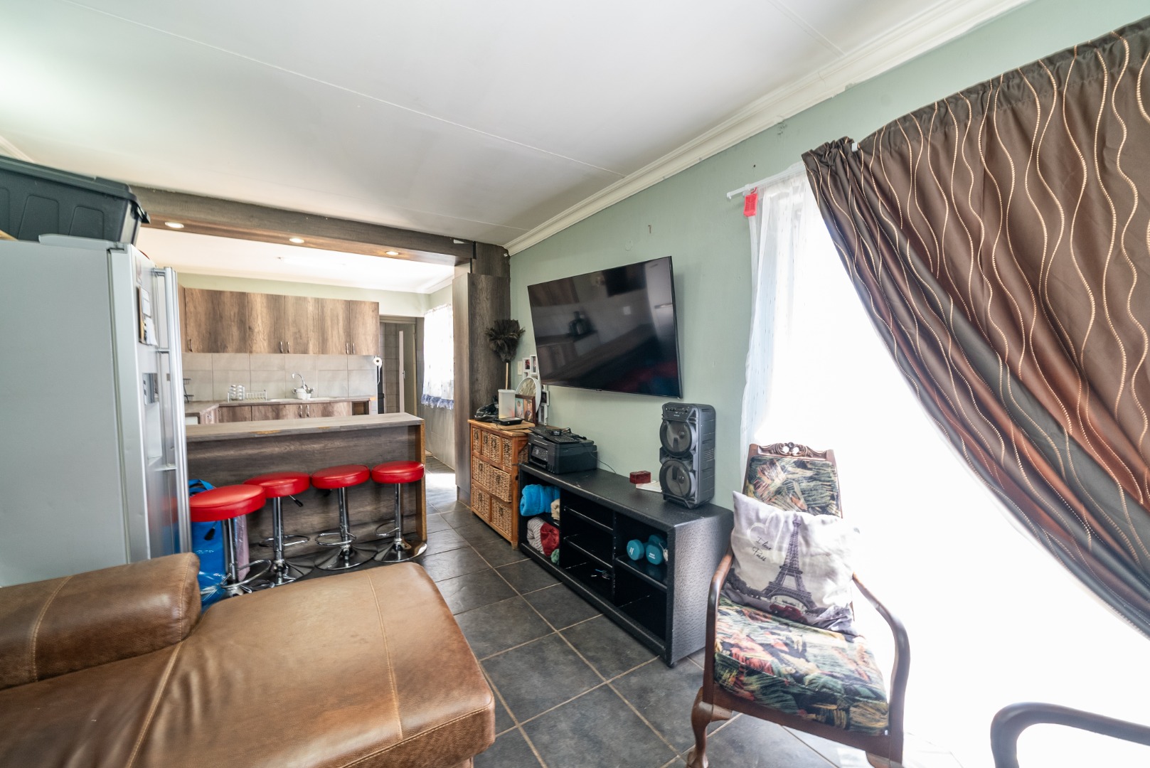 Open-plan kitchen and lounge, fully tiled