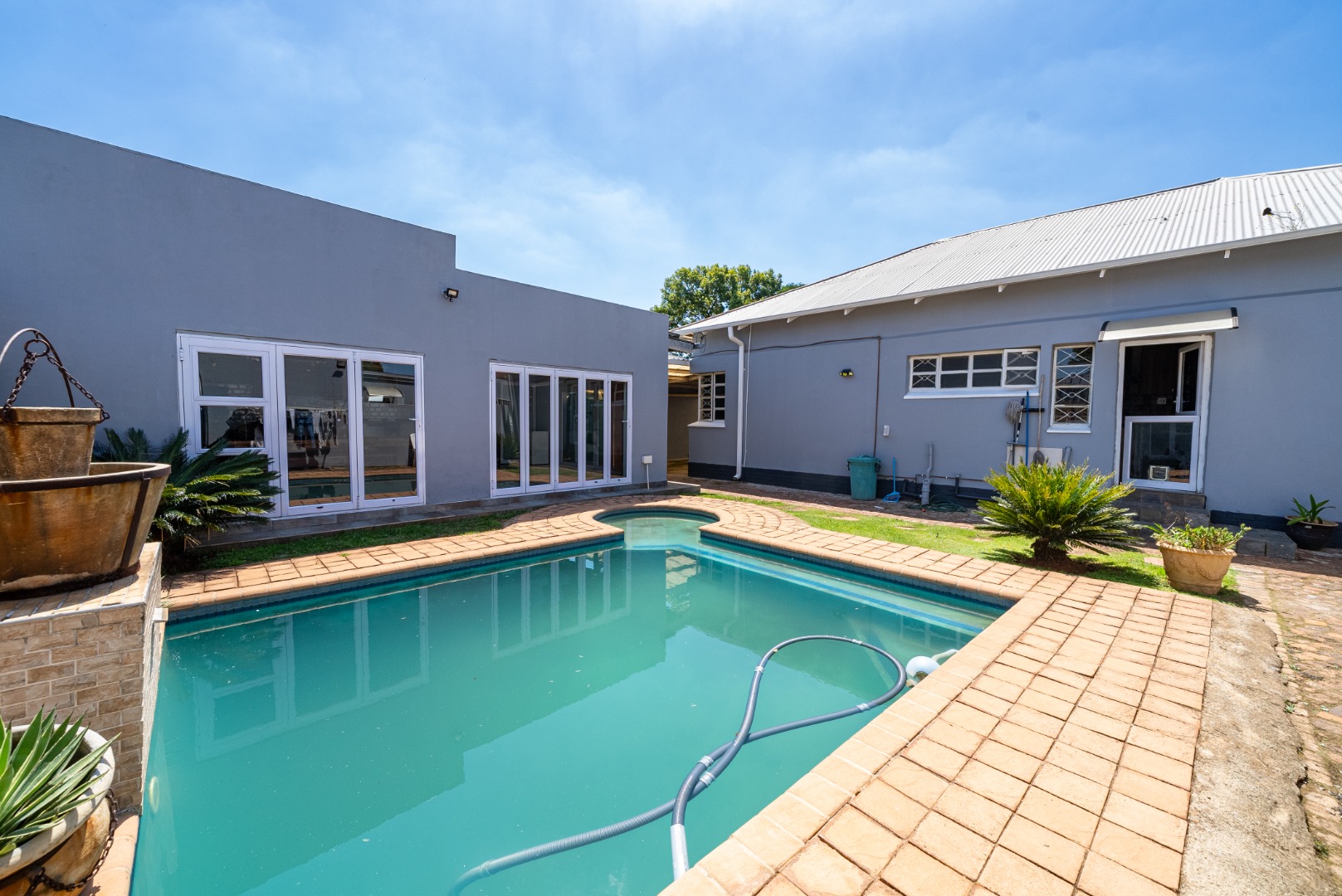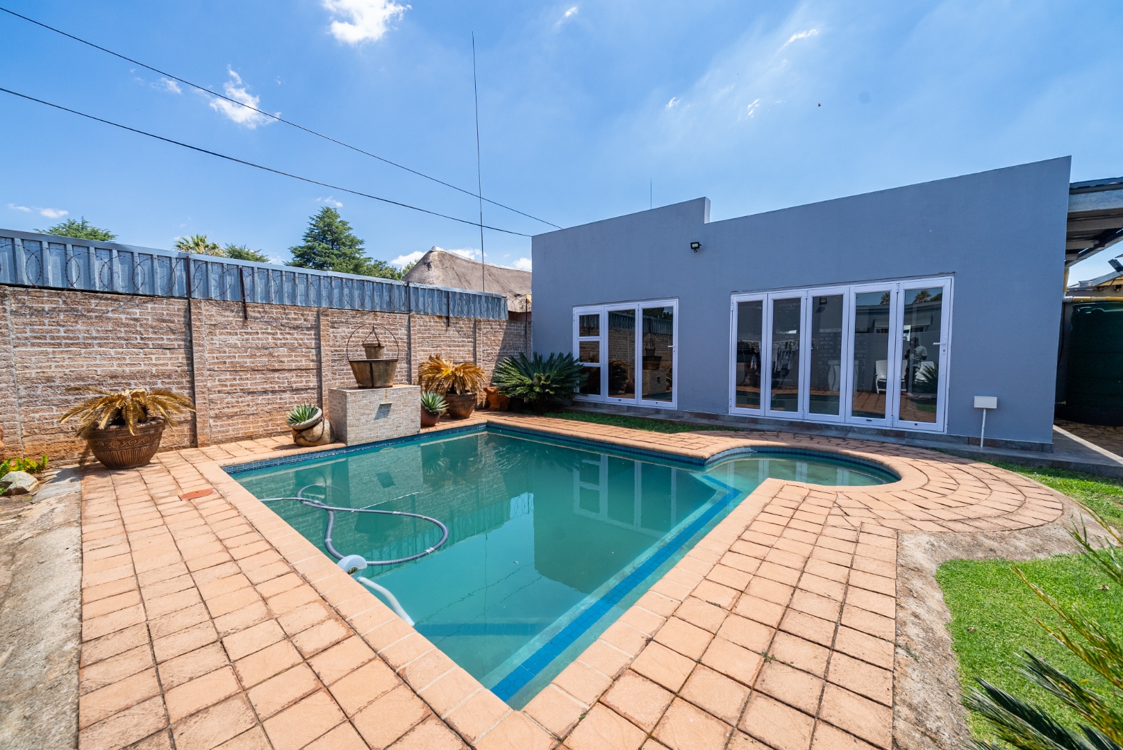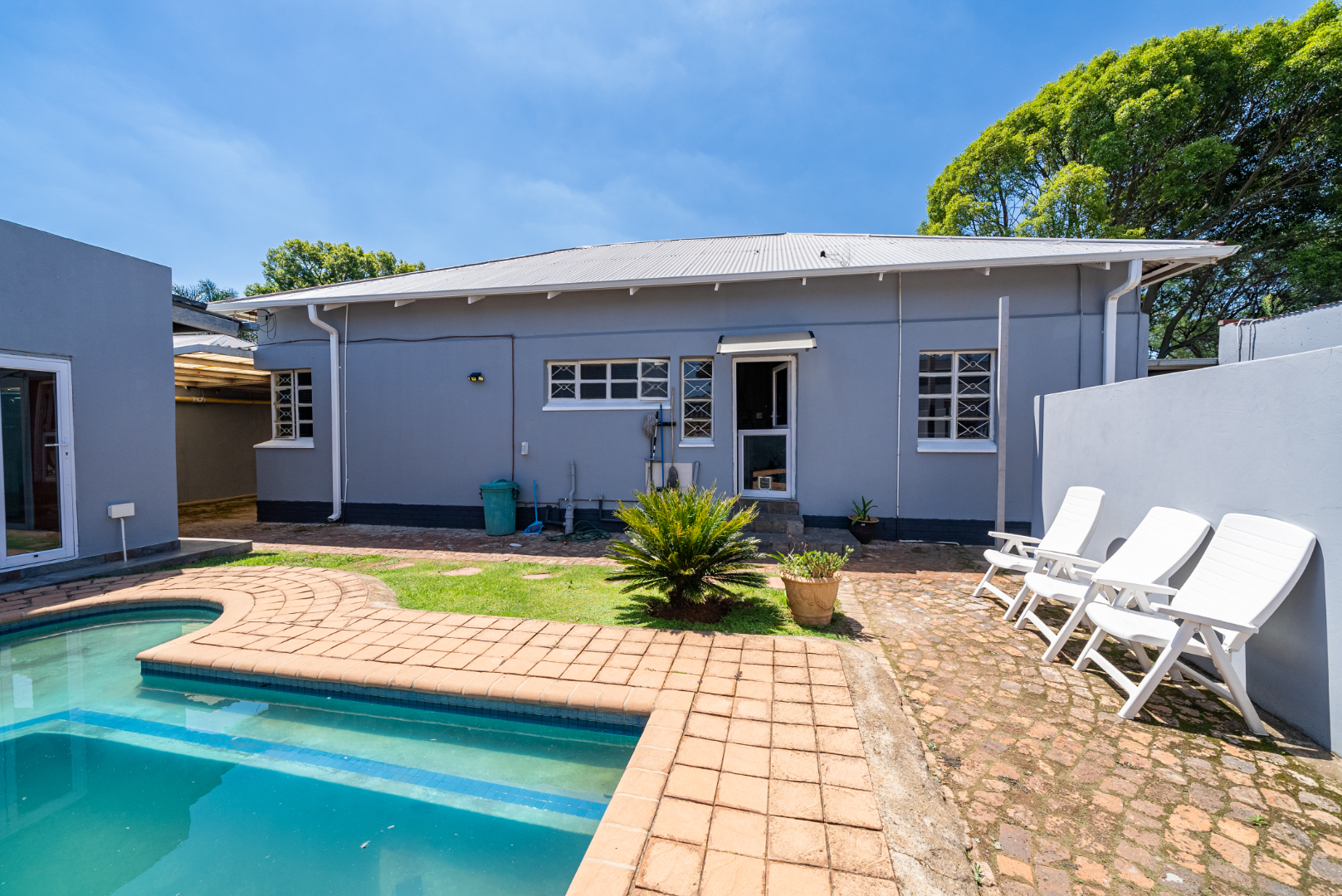Sparkling swimming pool positioned centrally in the yard