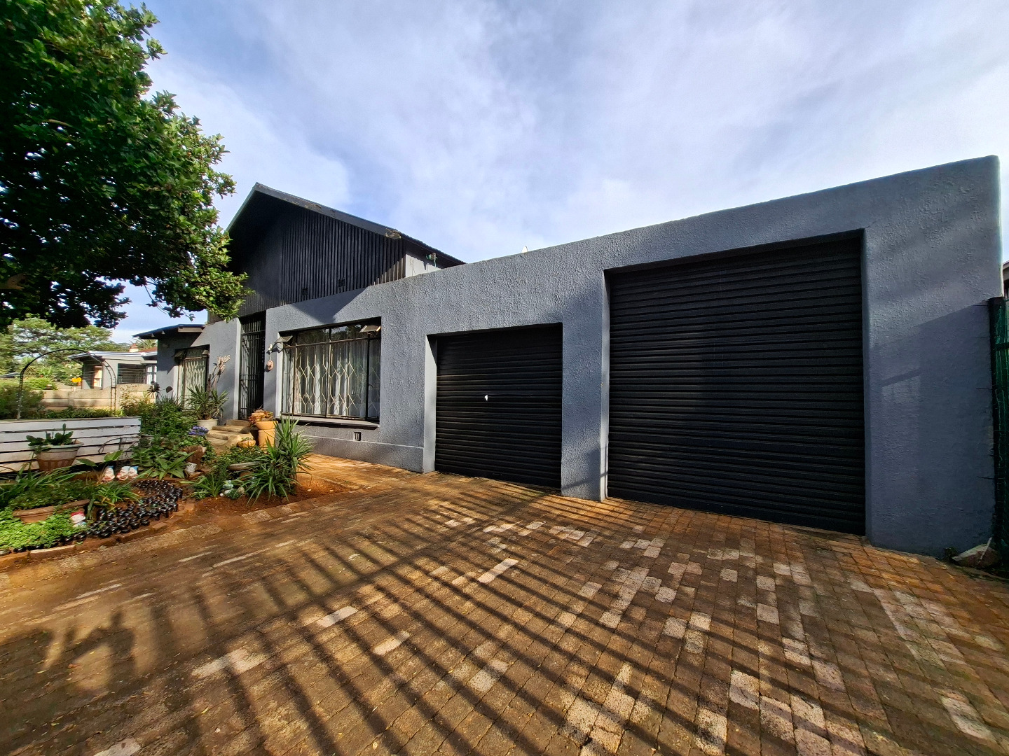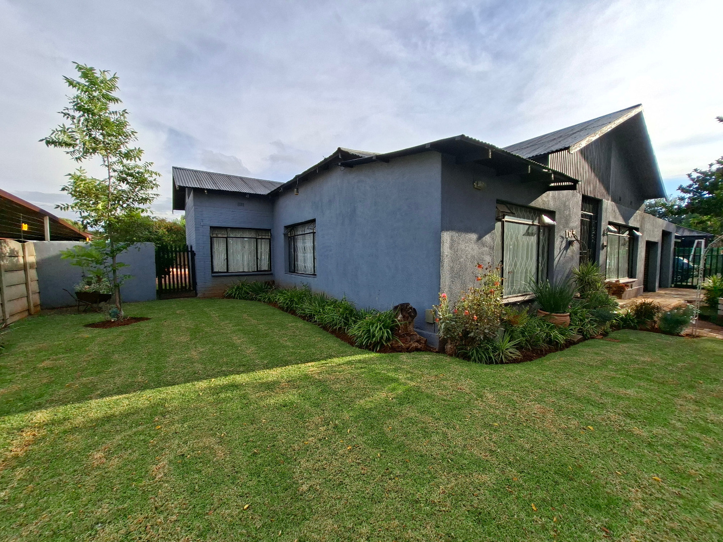 This inviting 4-bedroom, 2-bathroom family home in Dalview, Brakpan, offers a welcoming first impression with its well-maintained front garden, neat lawn, and charming brick pathway. The property features a modern grey and black facade, complemented by security grilles and an access gate, ensuring peace of mind in this established suburban setting.