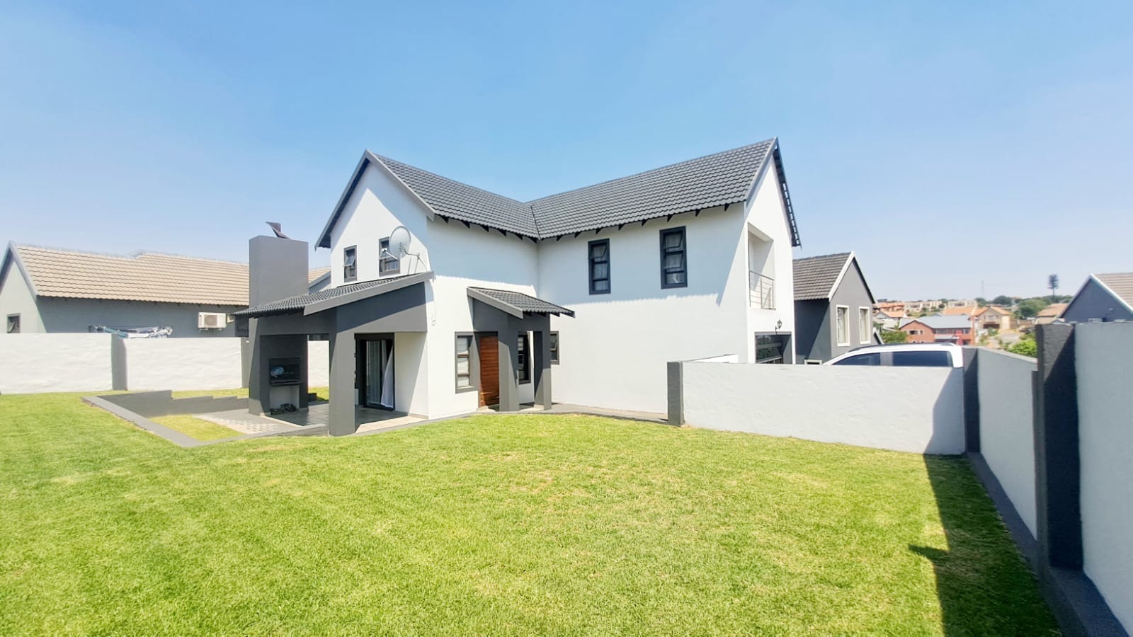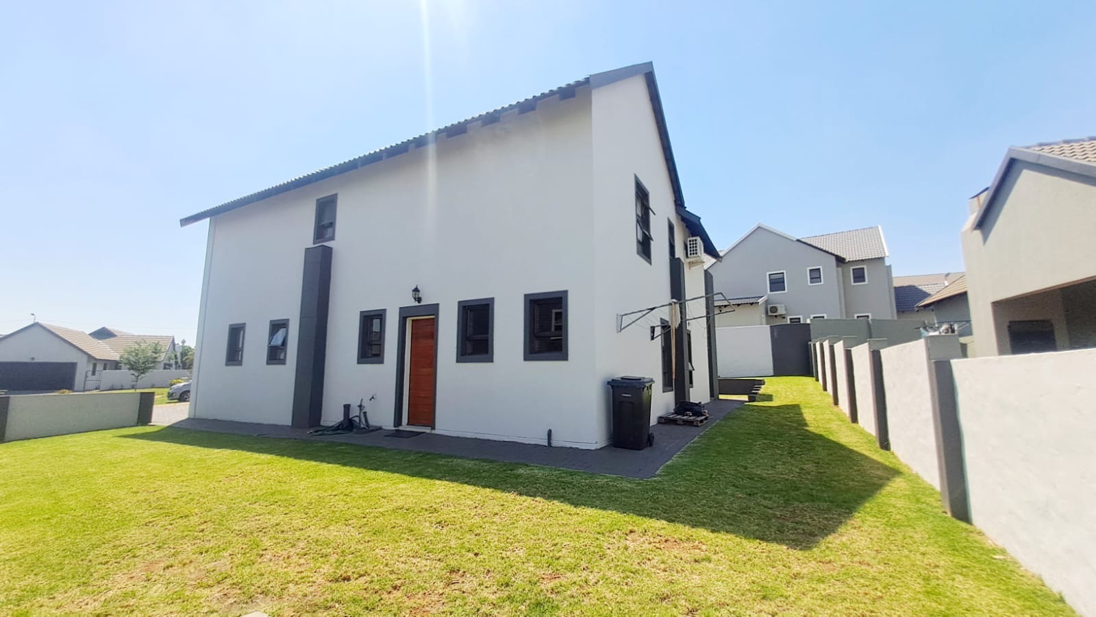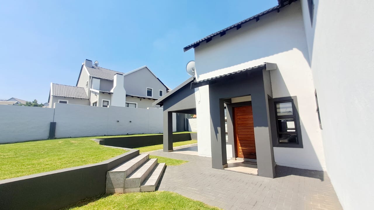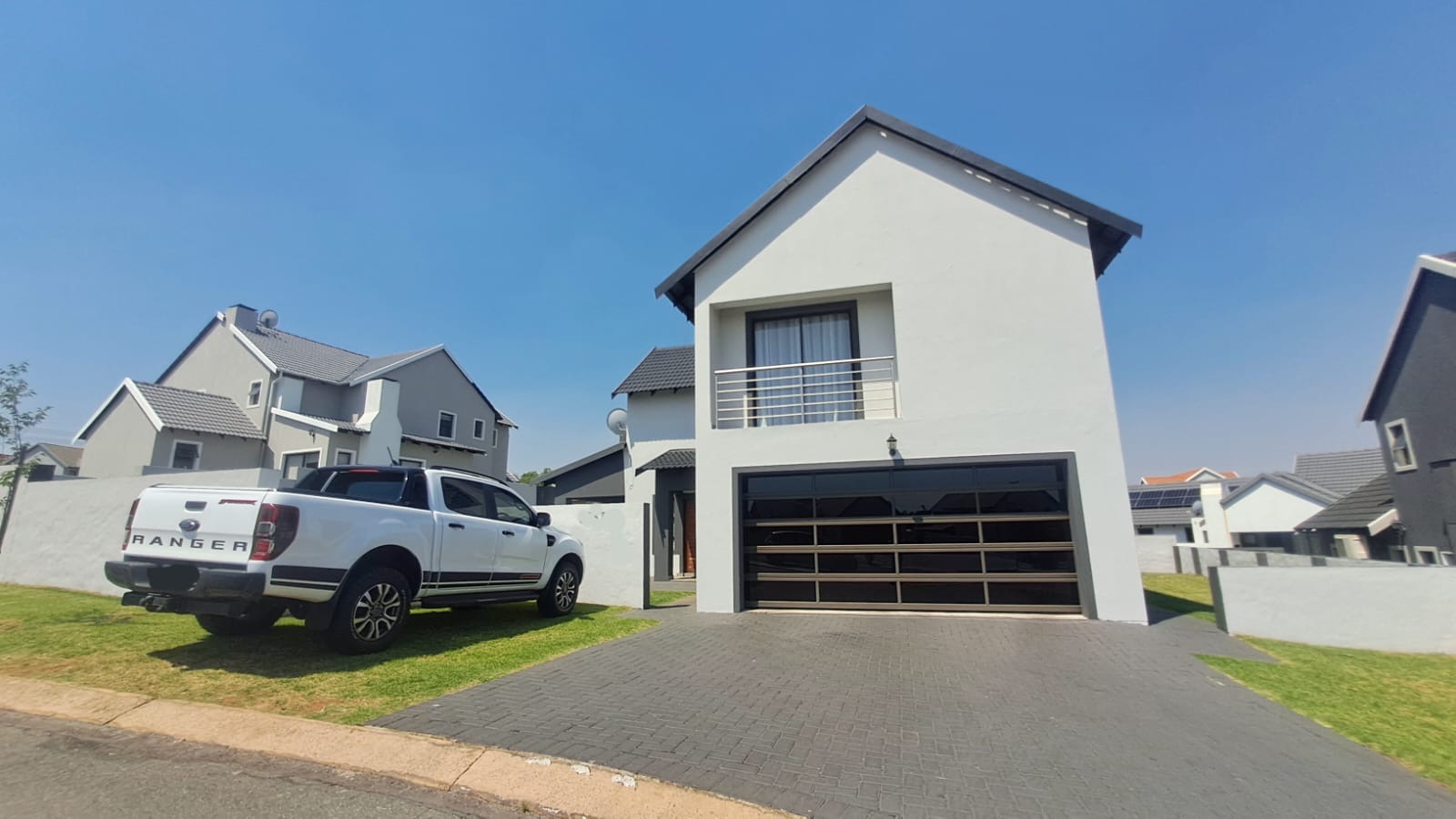 Discover the perfect balance of style, comfort, and security in this immaculate 3-bedroom, 2.5-bathroom double-story home situated in a sought-after estate in Kosmosdal, Centurion. The residence boasts a sleek white and charcoal-grey exterior, complemented by a manicured lawn and paved driveway leading to a double automated garage—offering impressive kerb appeal from the moment you arrive.