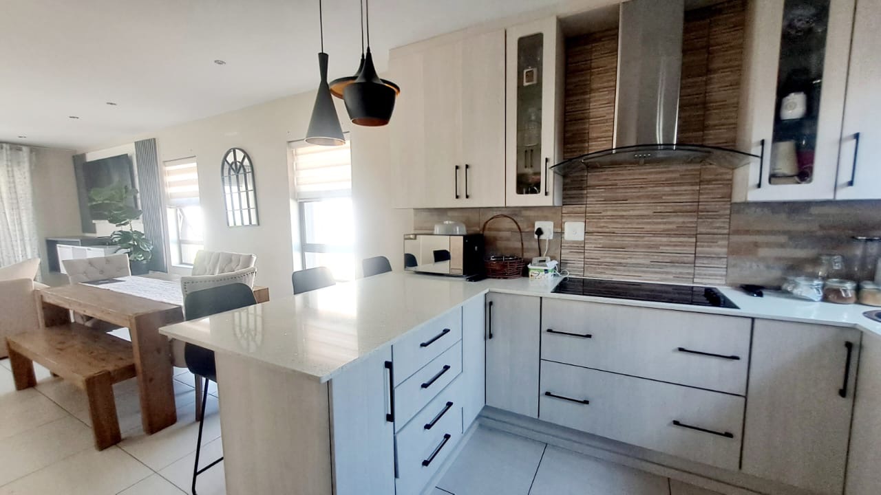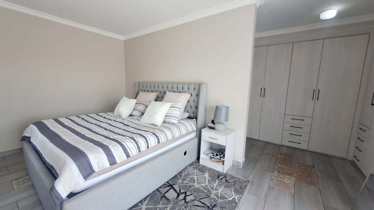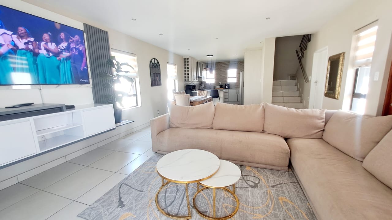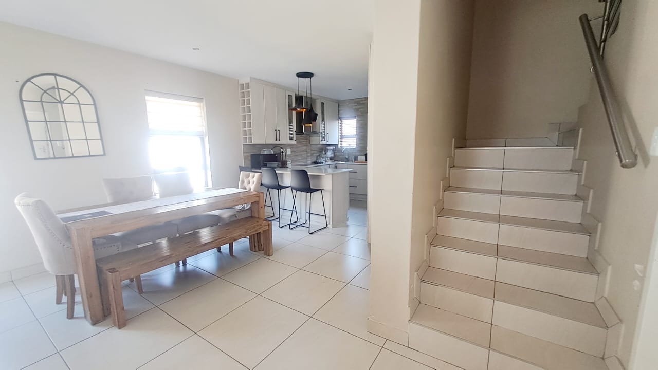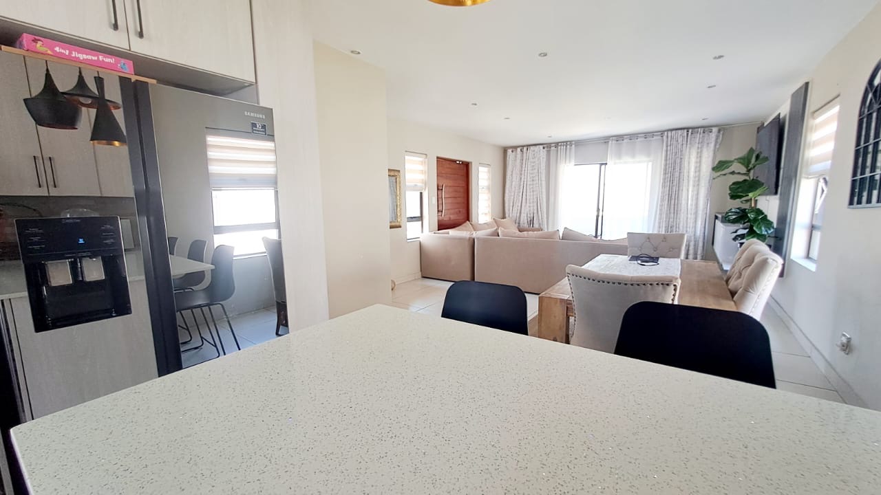 Discover the perfect balance of style, comfort, and security in this immaculate 3-bedroom, 2.5-bathroom double-story home situated in a sought-after estate in Kosmosdal, Centurion. The residence boasts a sleek white and charcoal-grey exterior, complemented by a manicured lawn and paved driveway leading to a double automated garage—offering impressive kerb appeal from the moment you arrive.