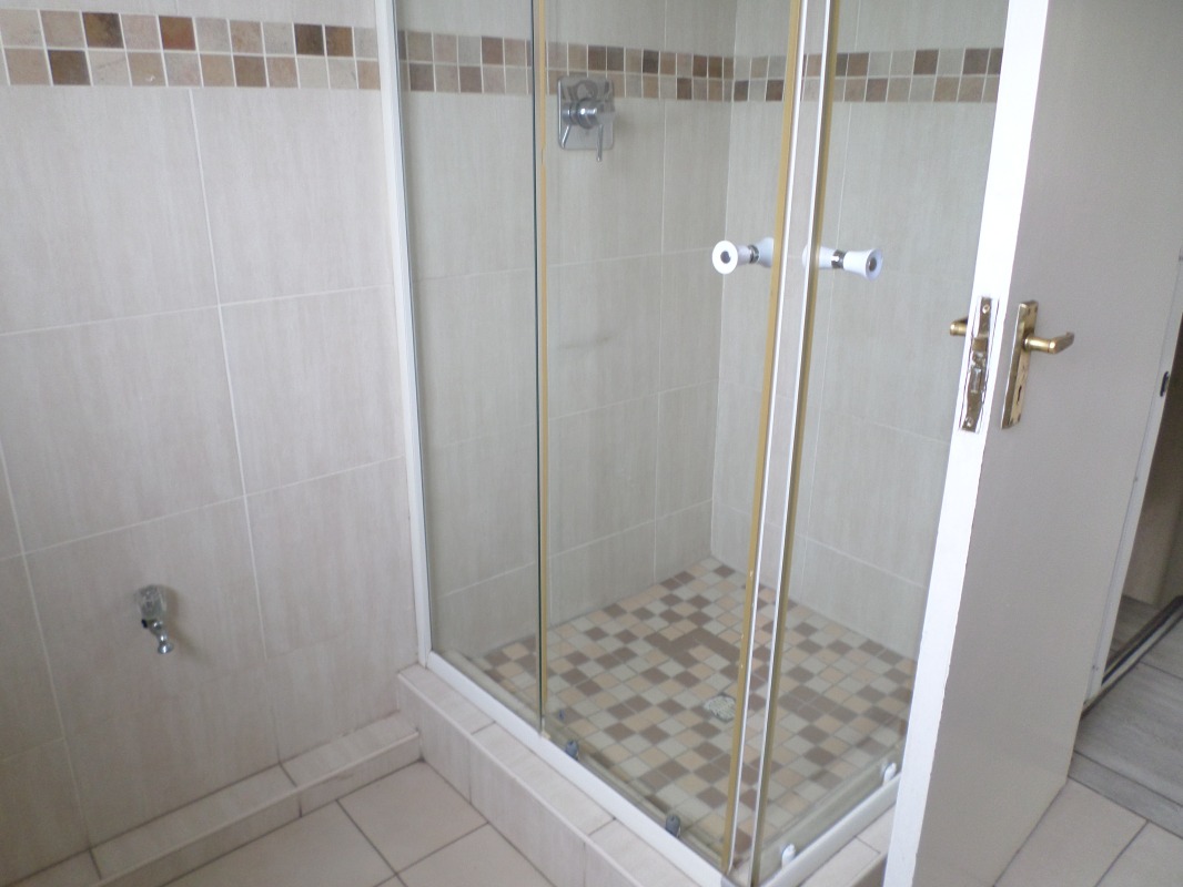 The property offers two well-proportioned bedrooms, each fitted with easy-to-maintain tiled flooring and large windows equipped with security bars, ensuring both safety and natural light. Built-in white wardrobes provide ample storage. The unit includes a clean, fully tiled bathroom featuring a modern pedestal sink, toilet, and a clear glass shower enclosure, catering to daily needs.