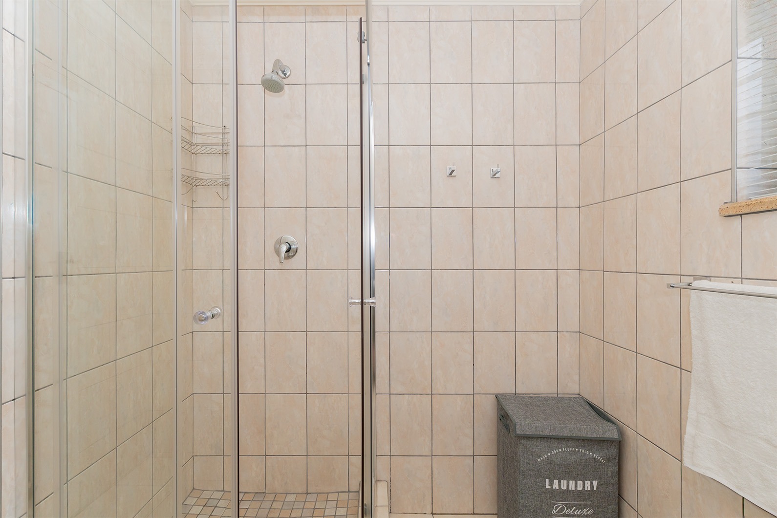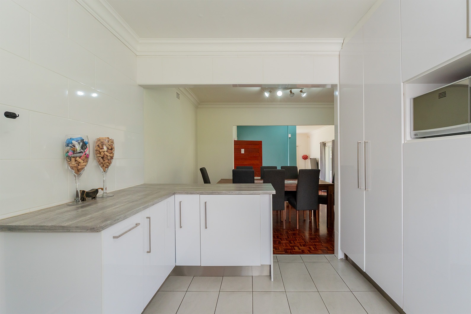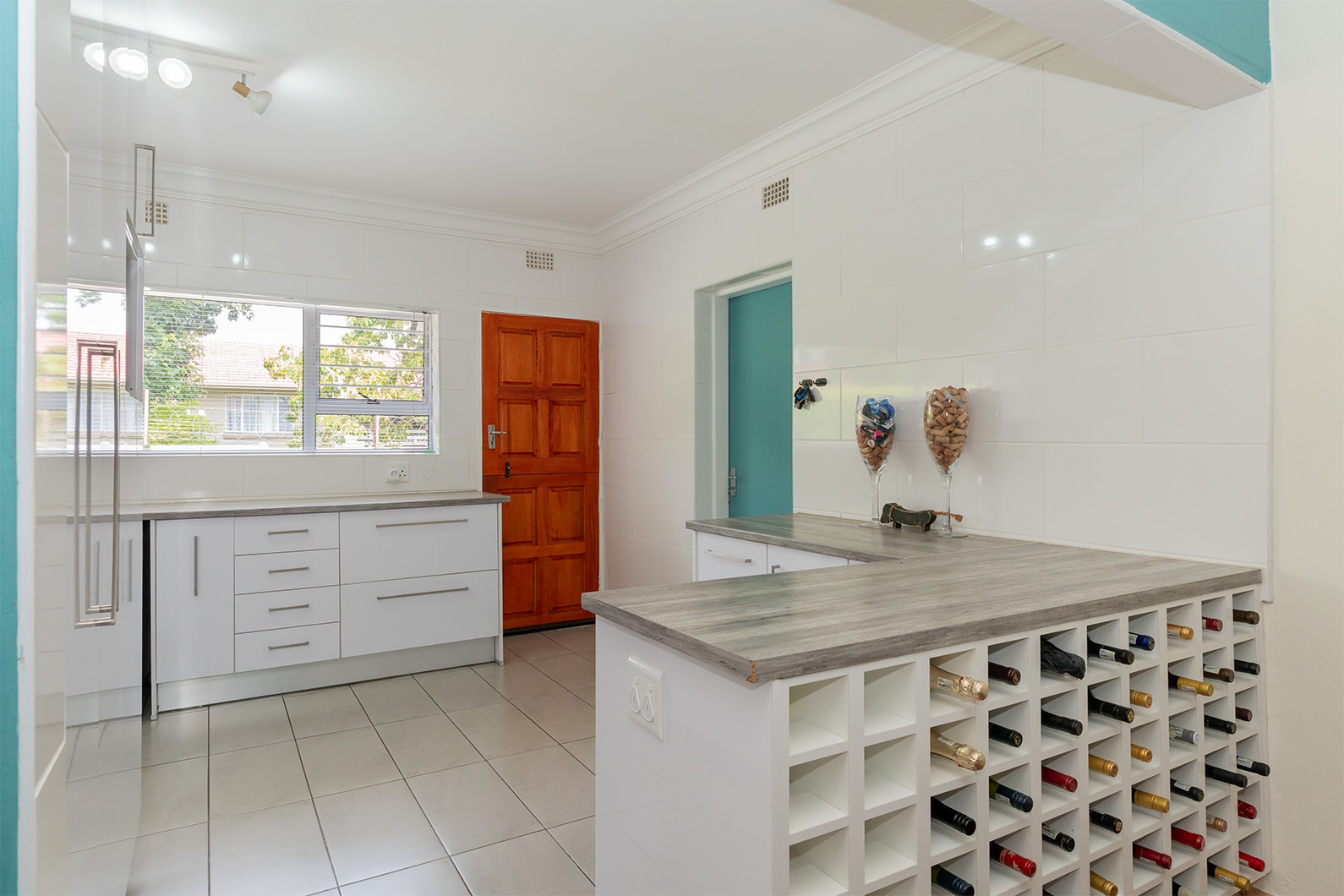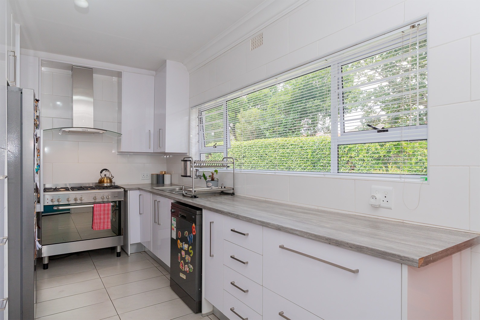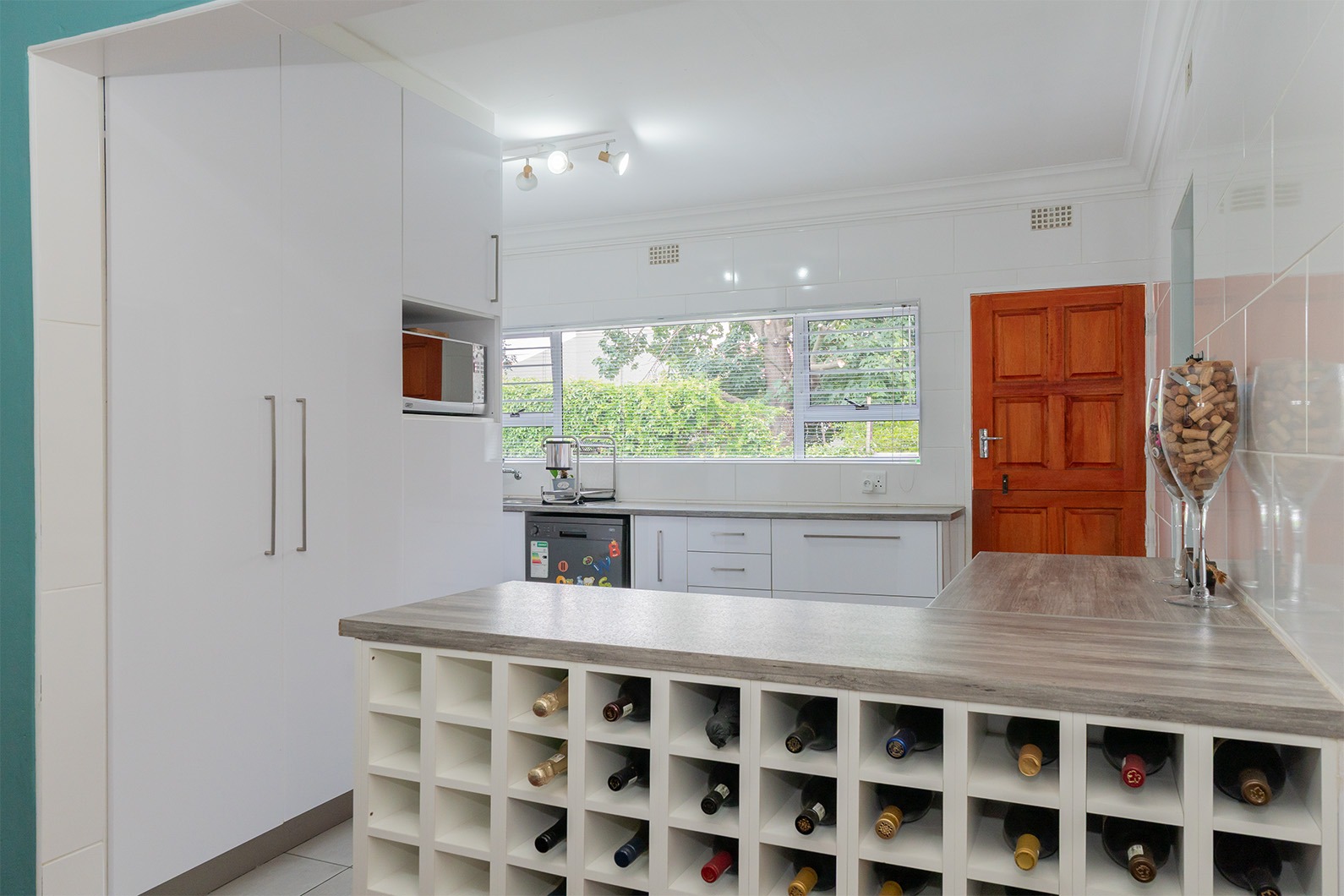 The Kitchen offers a lovely built in wine rack facing the dining room, ample cupboard space, space for a double door fridge, granite tops and a gas stove/electric oven. The garage leads off into the kitchen. Double automated garage with extra space for a trailer and laundry area.