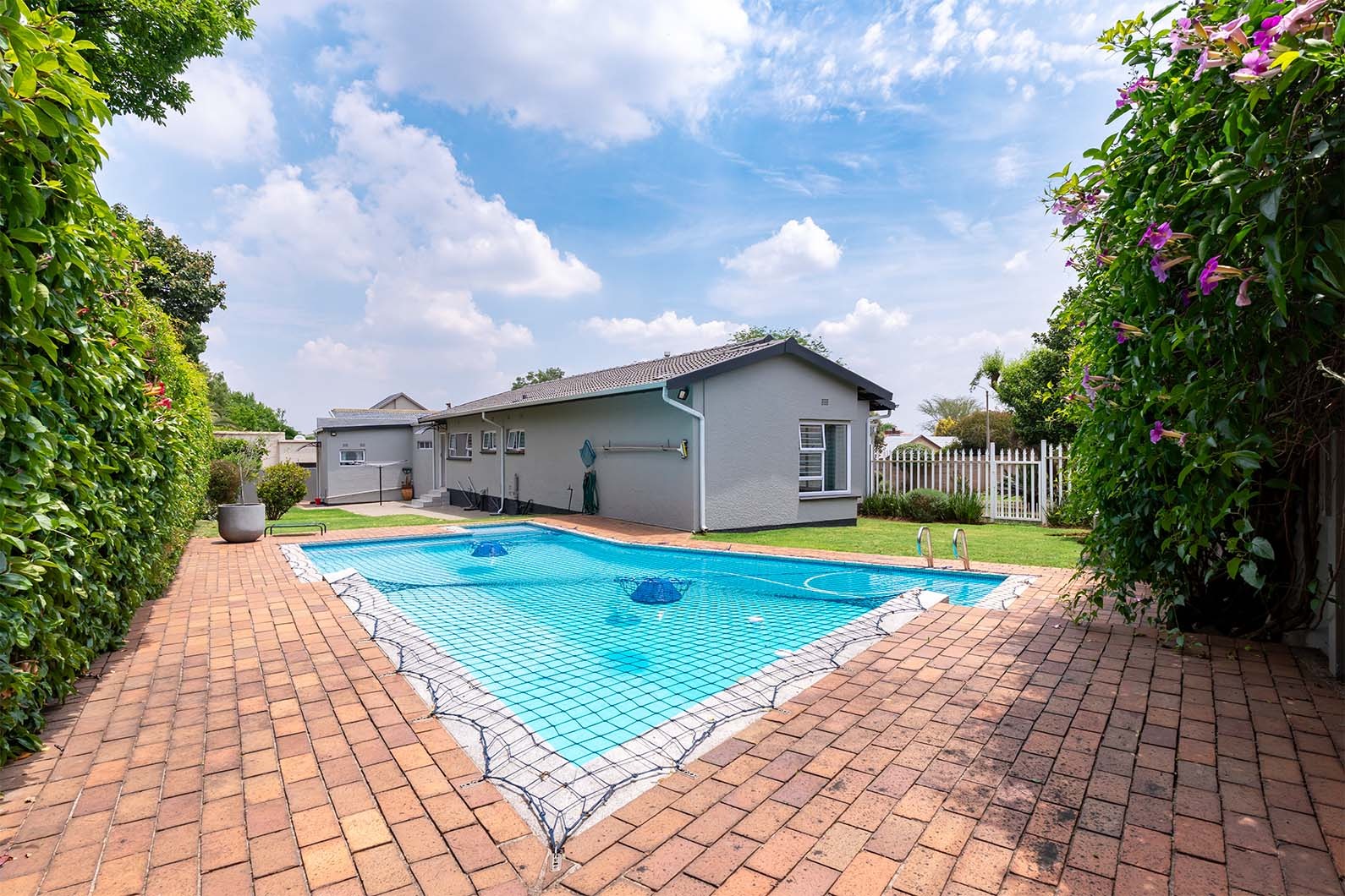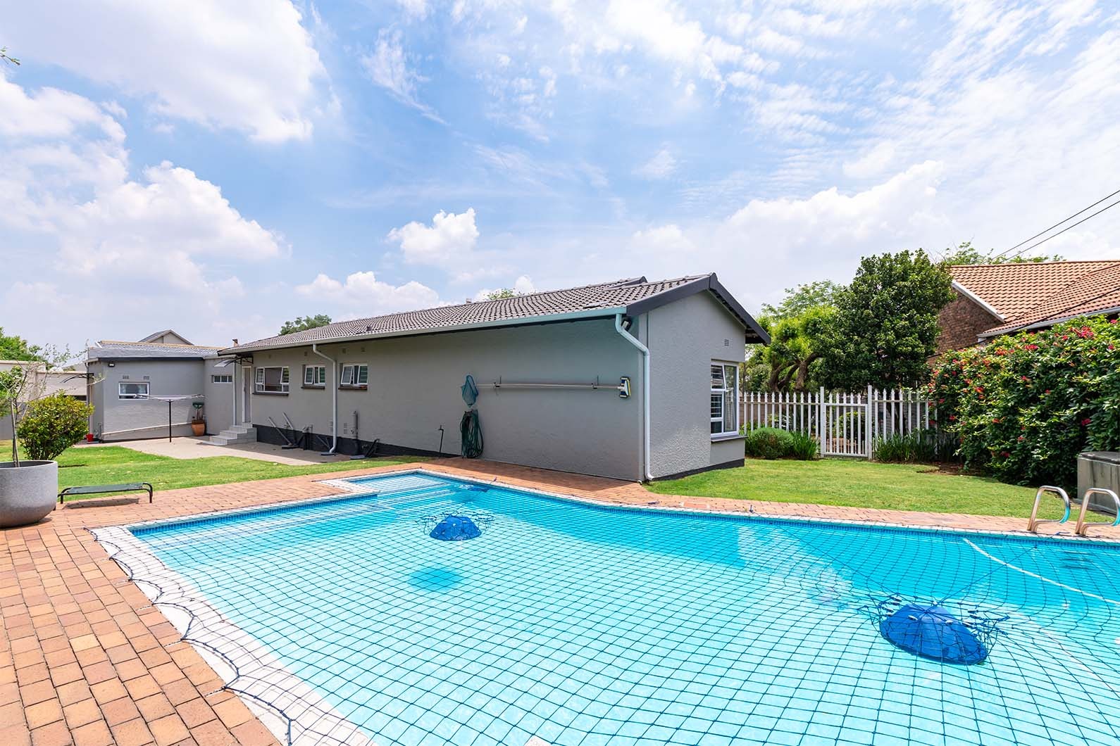 The outdoor spaces are designed for relaxation and entertaining. A spacious covered patio, complete with a built-in braai and drop down awnings, overlooks a large, well-maintained private garden with established trees and ample lawn space. Enjoy sunny days by the substantial swimming pool, fitted with a safety net for peace of mind. The property also benefits from staff quarters and a bathroom.