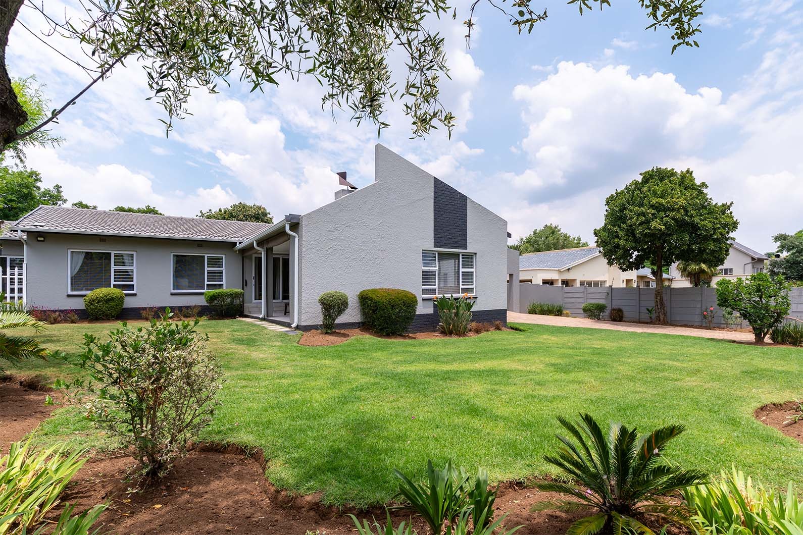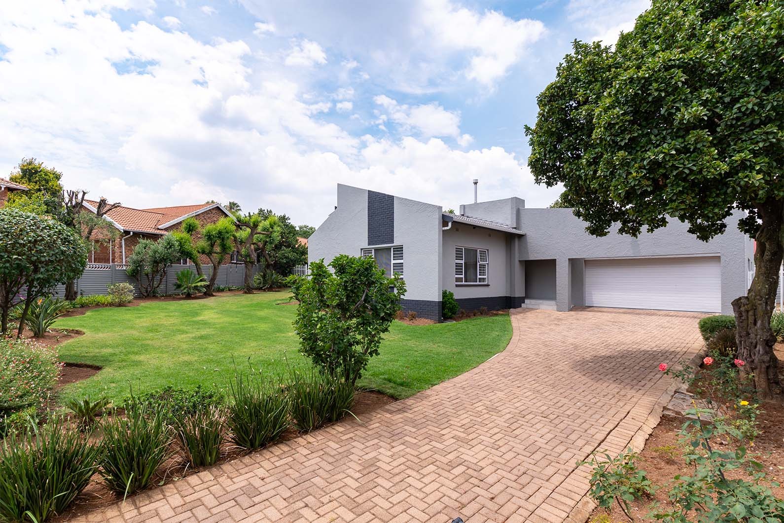 This inviting 4-bedroom, 2-bathroom family home in the desirable suburb of Eden Glen, Edenvale, offers a blend of modern comfort and spacious living. The property boasts excellent kerb appeal with its contemporary grey facade, large manicured lawn, and mature trees. A paved driveway leads to a double garage plus ample secure parking for four more vehicles.