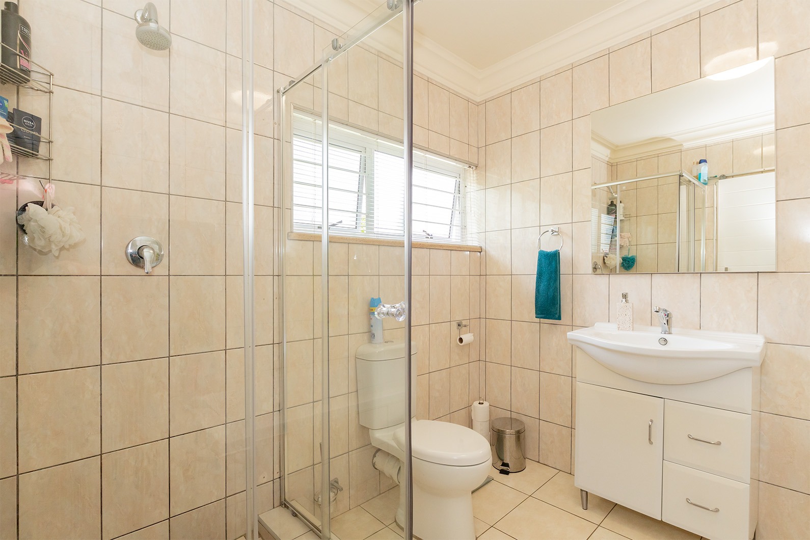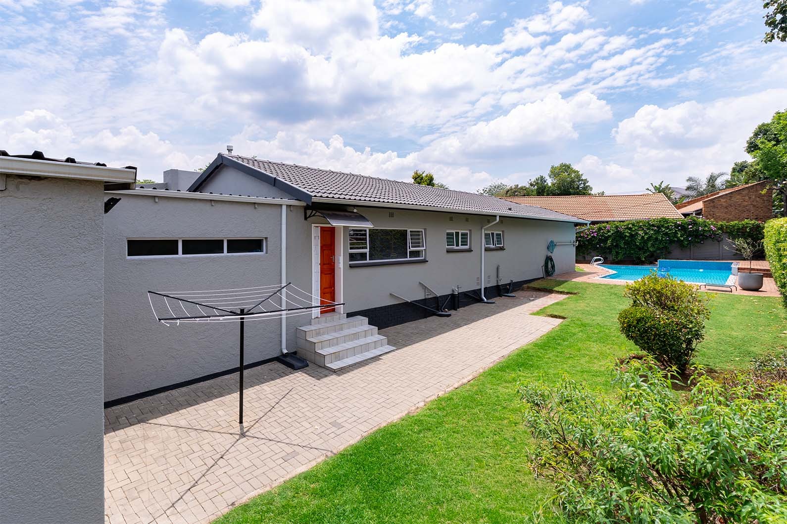 The outdoor spaces are designed for relaxation and entertaining. A spacious covered patio, complete with a built-in braai and drop down awnings, overlooks a large, well-maintained private garden with established trees and ample lawn space. Enjoy sunny days by the substantial swimming pool, fitted with a safety net for peace of mind. The property also benefits from staff quarters and a bathroom.