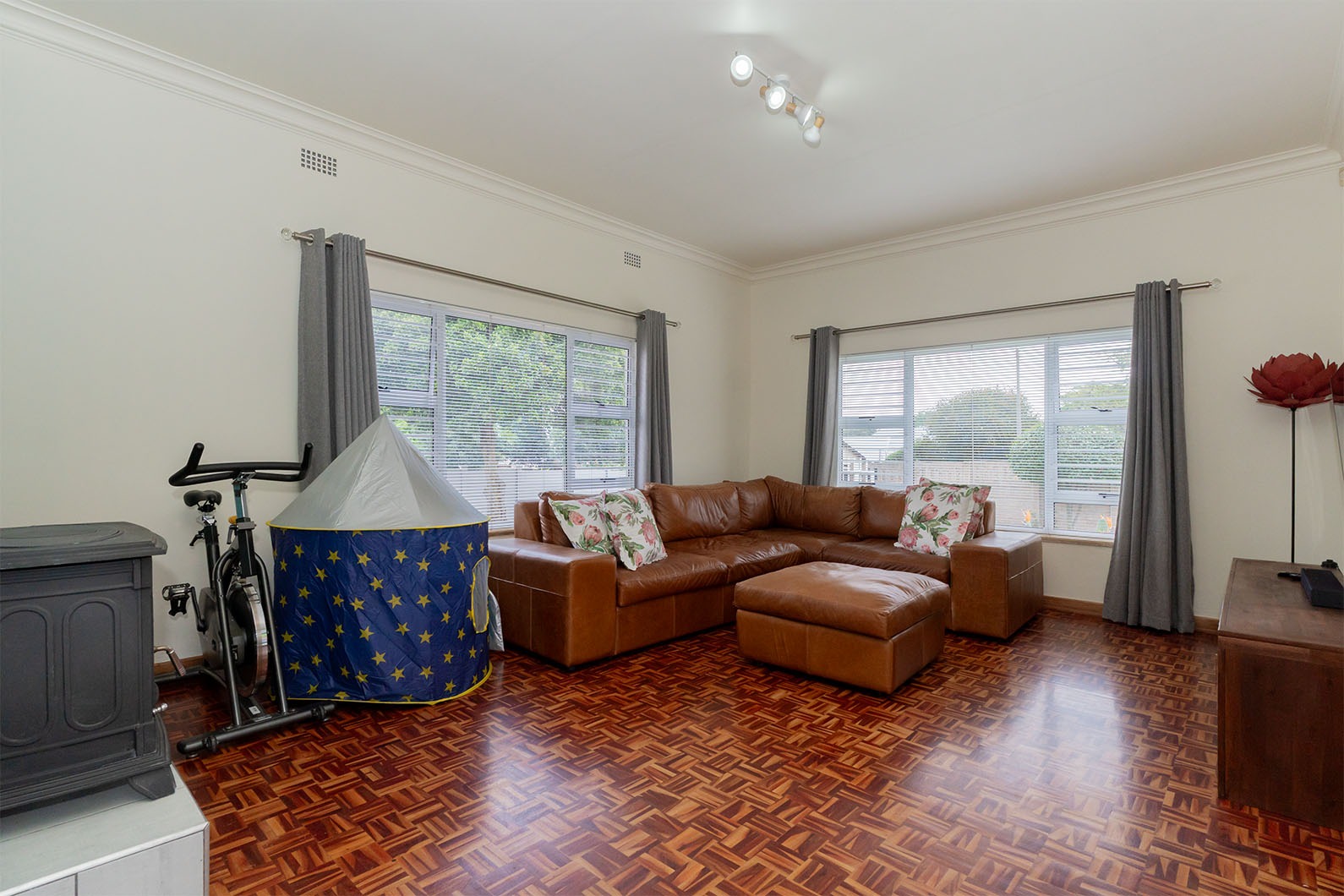 Step inside to discover generous living areas featuring classic parquet flooring and elegant crown moulding, creating a warm and welcoming atmosphere. Large windows throughout ensure abundant natural light, enhancing the spacious feel. The home includes a dedicated dining room and a comfortable lounge, with an open-plan design promoting seamless flow. A cosy fireplace adds to the ambiance, perfect for cooler evenings.