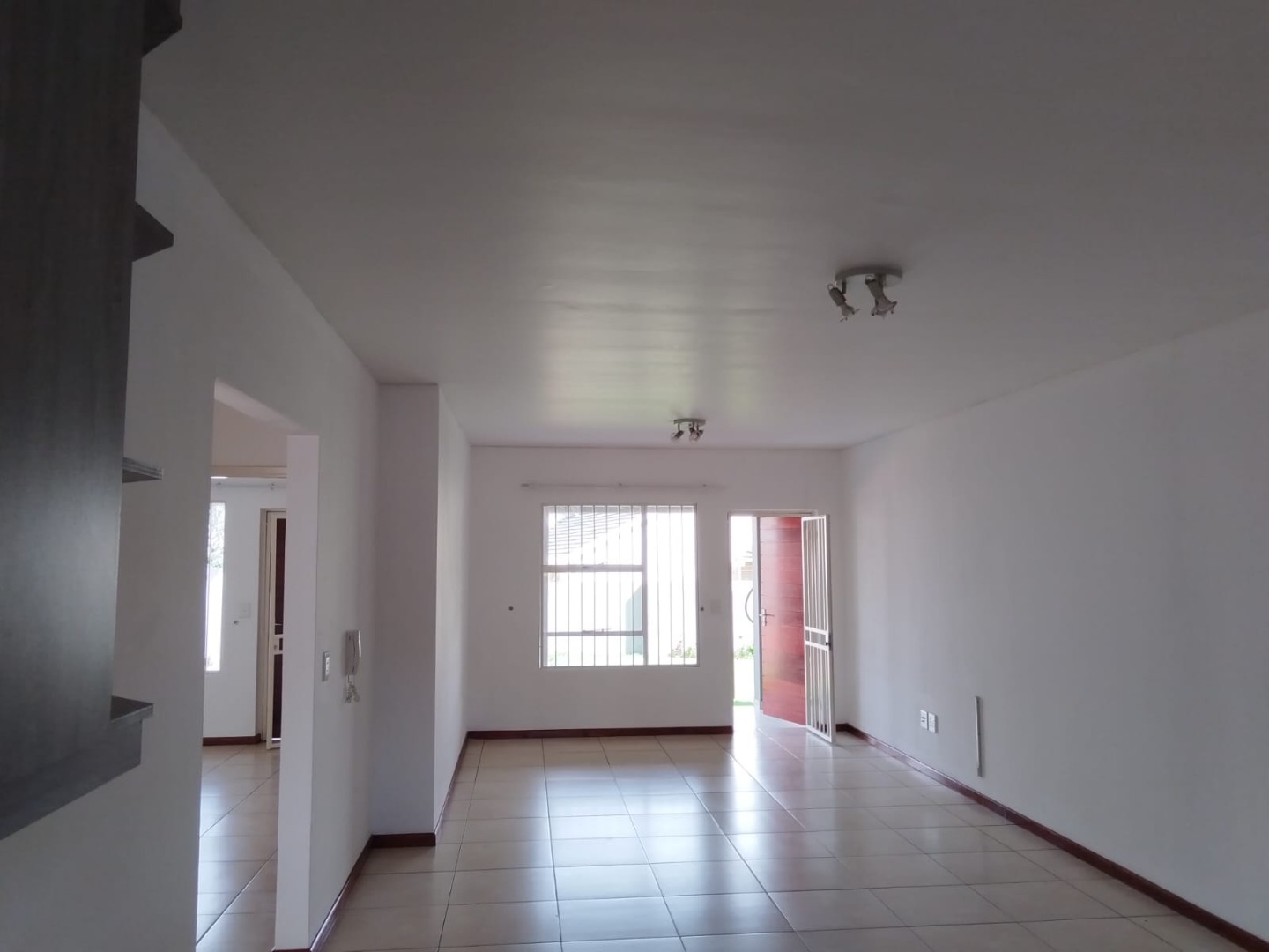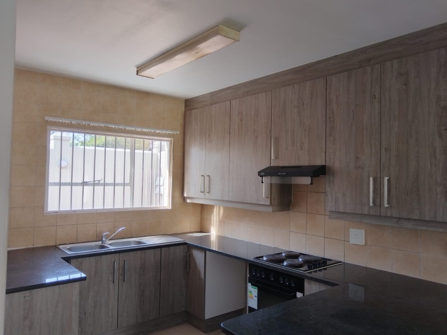 This modern two-bedroom, one-bathroom home, spanning 99sqm, offers comfortable living within a well-maintained complex in Edenvale Central. The property boasts an attractive kerb appeal with its contemporary grey exterior, striking red accent doors, and a neatly paved driveway complemented by a small, manicured garden. An integrated outdoor braai area provides an ideal setting for entertaining.