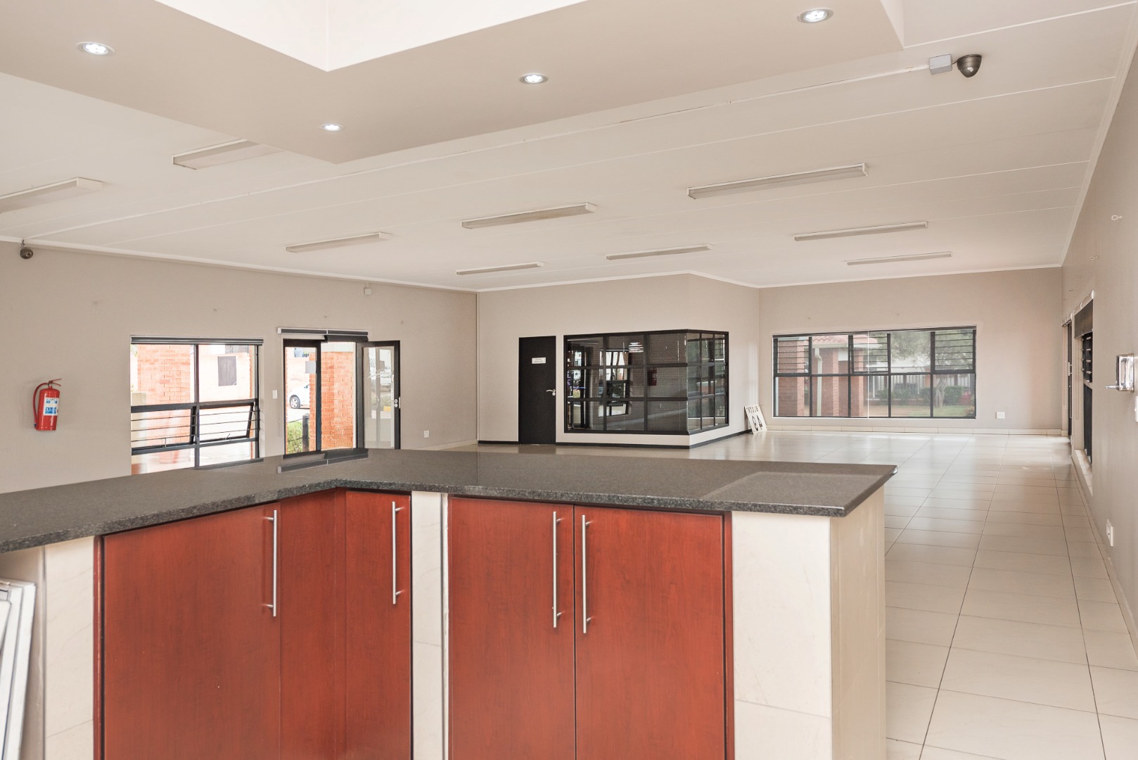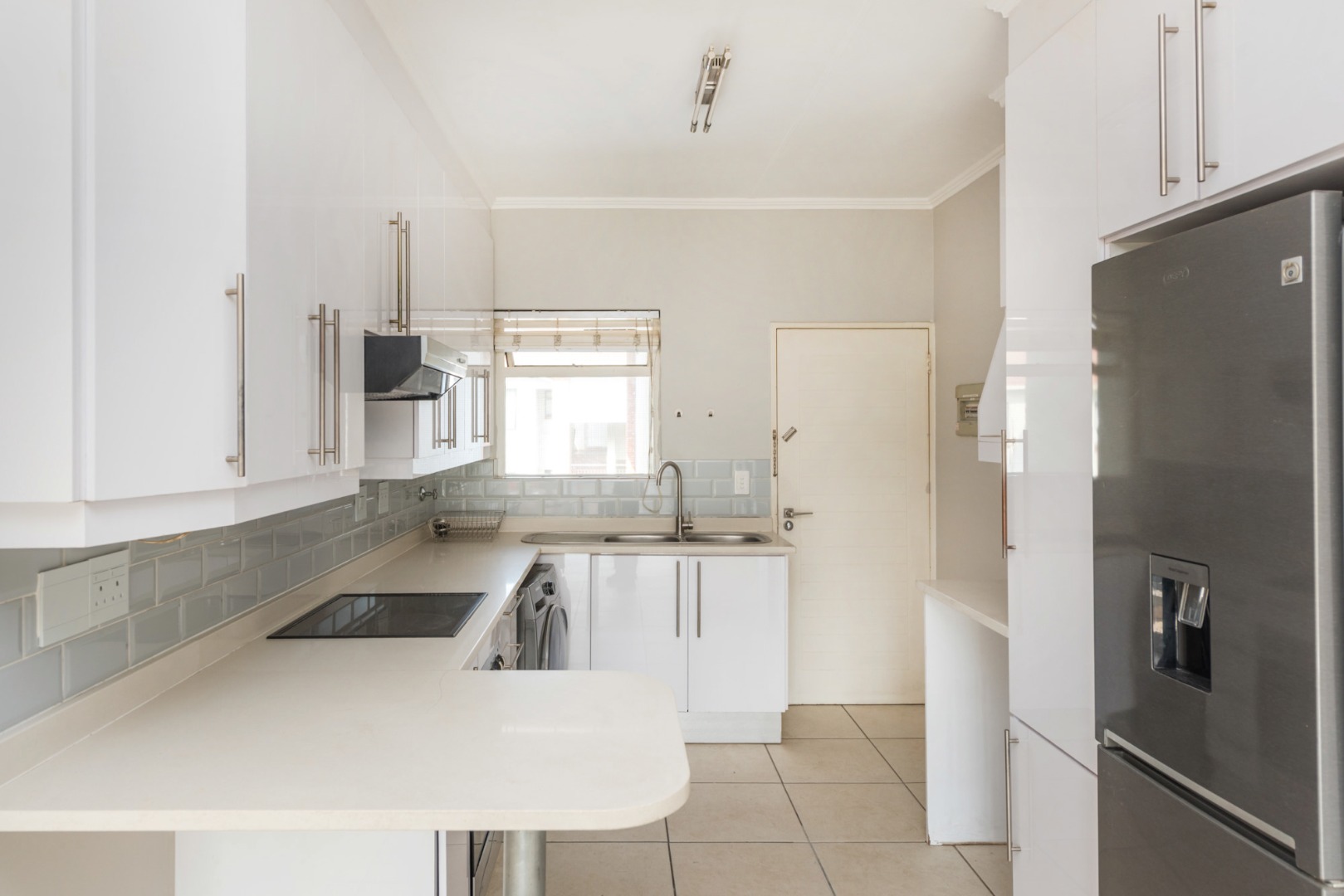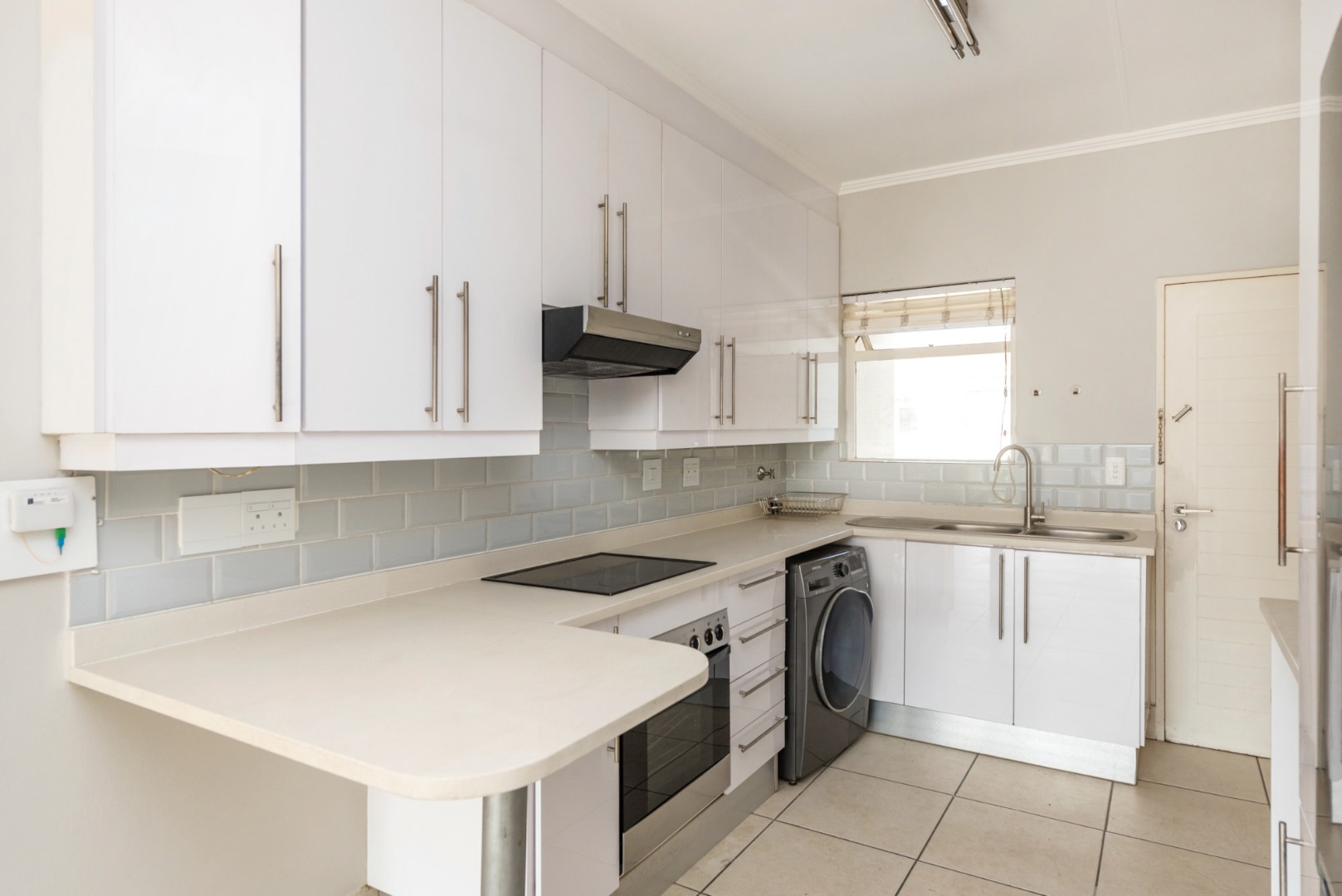 From the moment you enter, you are welcomed by a sleek, contemporary kitchen fitted with elegant Caesarstone countertops, an electric oven, hob and extractor, along with space for two undercounter appliances and a single-door fridge. A convenient breakfast counter creates the ideal spot for casual dining or morning coffee, while the open-plan design allows the kitchen to flow seamlessly into a generously sized lounge.