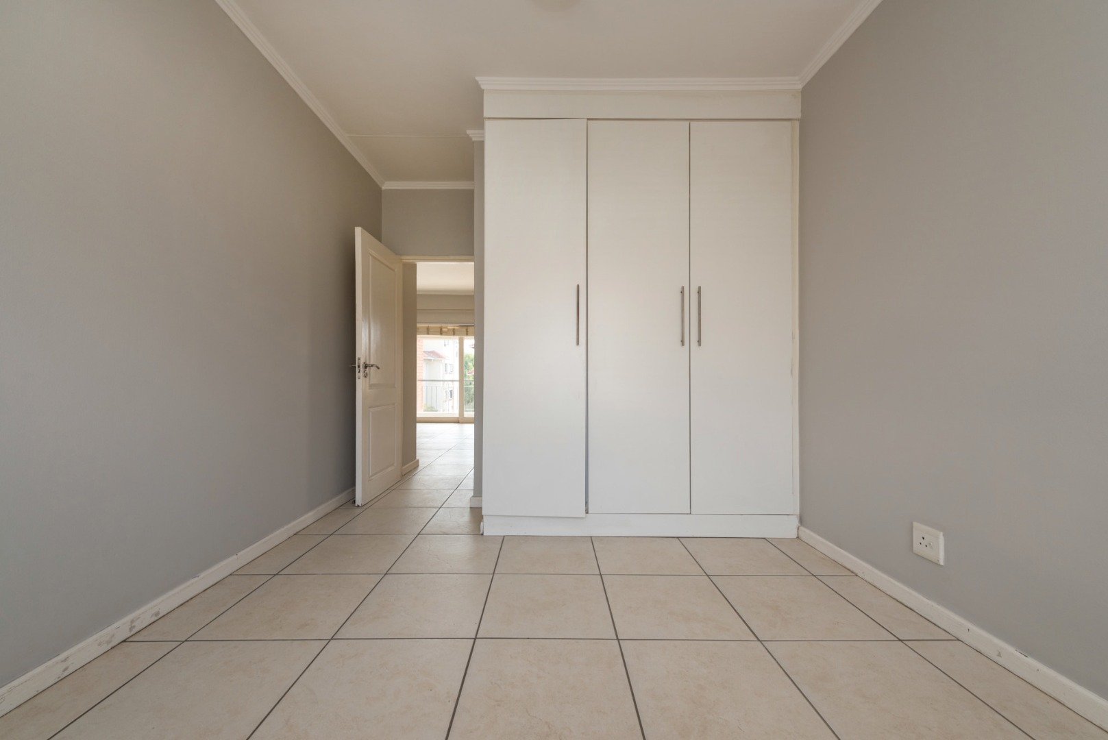 The living area extends effortlessly onto a spacious, covered balcony complete with a built-in braai, making it perfect for entertaining guests or simply unwinding while enjoying the elevated position and added privacy of a second-floor unit.