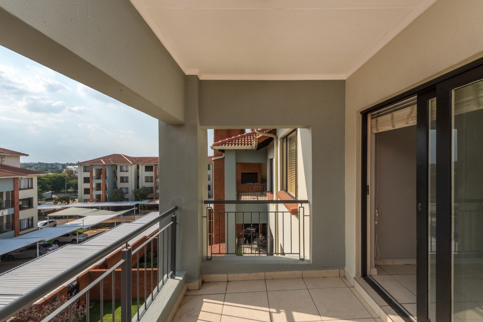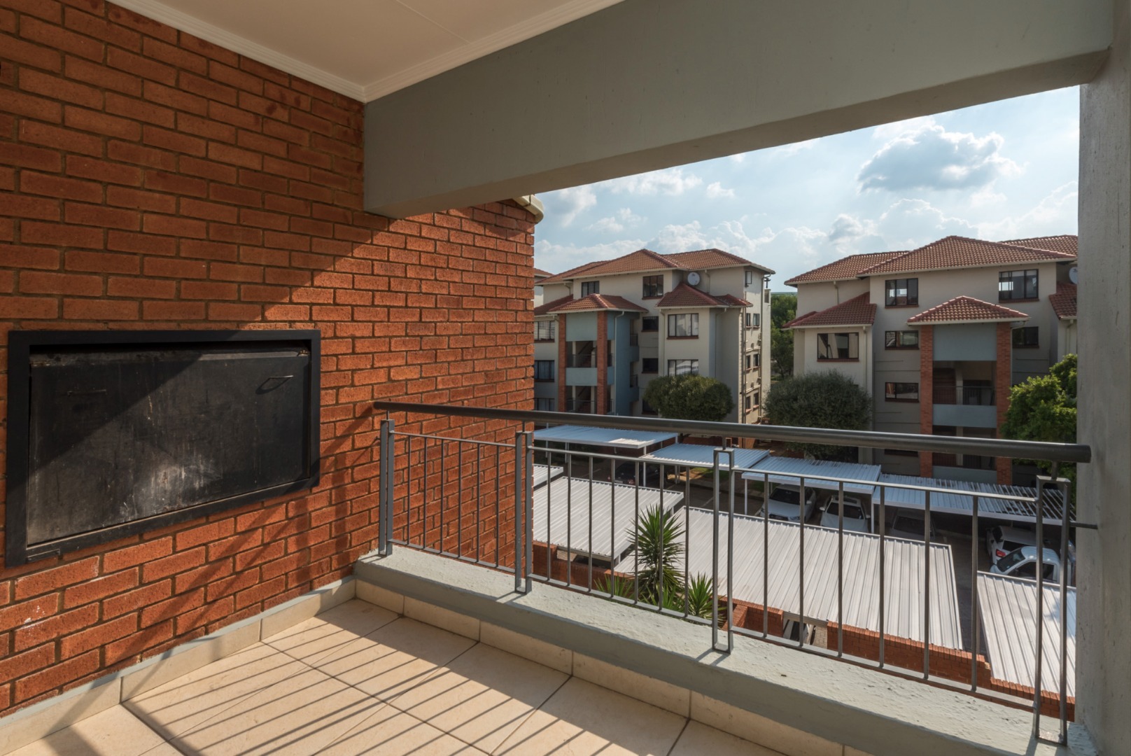 The living area extends effortlessly onto a spacious, covered balcony complete with a built-in braai, making it perfect for entertaining guests or simply unwinding while enjoying the elevated position and added privacy of a second-floor unit.