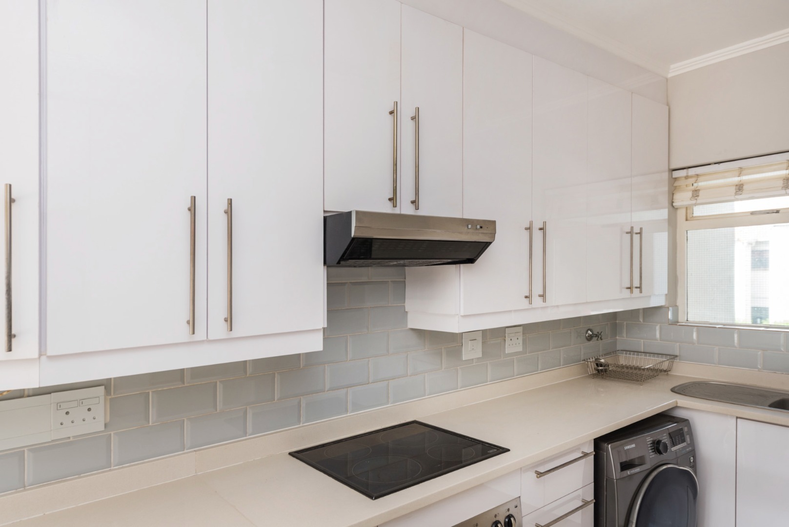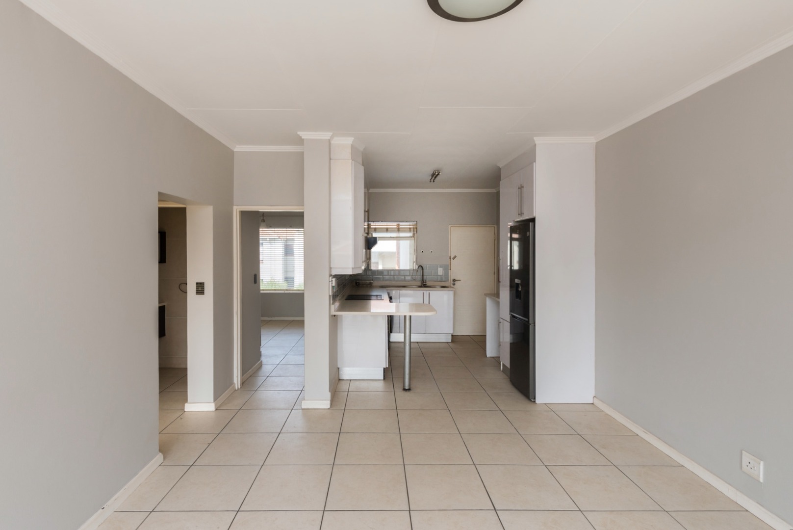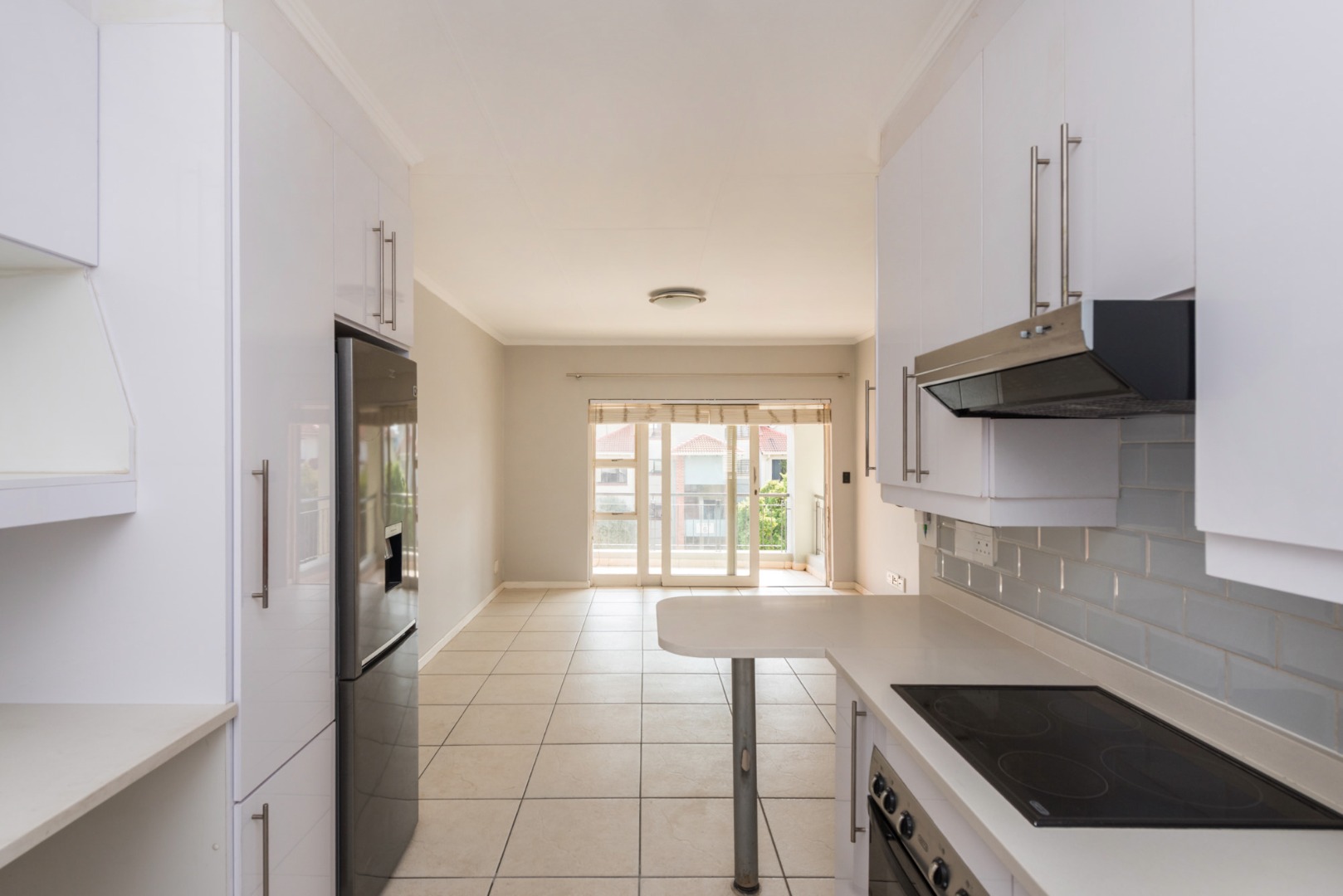 From the moment you enter, you are welcomed by a sleek, contemporary kitchen fitted with elegant Caesarstone countertops, an electric oven, hob and extractor, along with space for two undercounter appliances and a single-door fridge. A convenient breakfast counter creates the ideal spot for casual dining or morning coffee, while the open-plan design allows the kitchen to flow seamlessly into a generously sized lounge.
