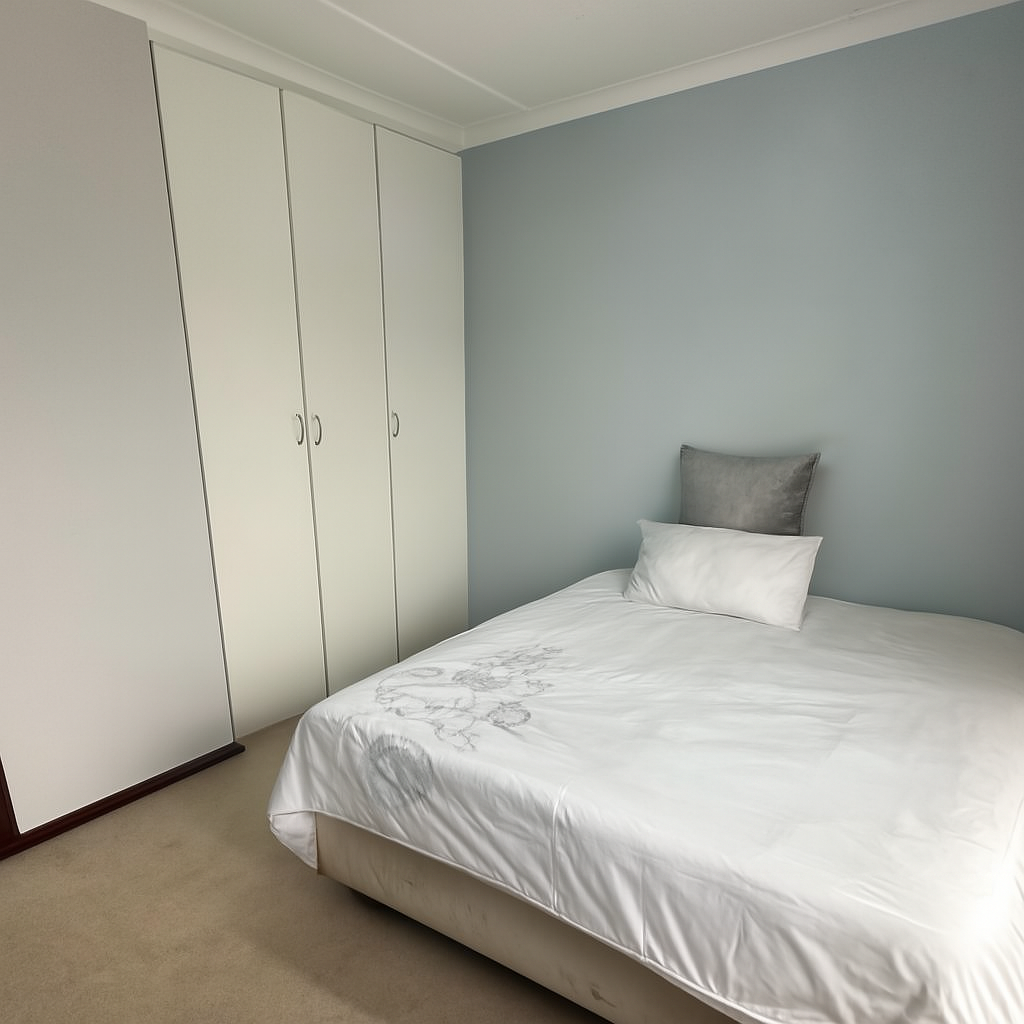 Both bedrooms are carpeted, fitted with built-in wardrobes, and enjoy skyline views. The main bedroom is north-facing, allowing for plenty of natural light. A full family bathroom serves both rooms.