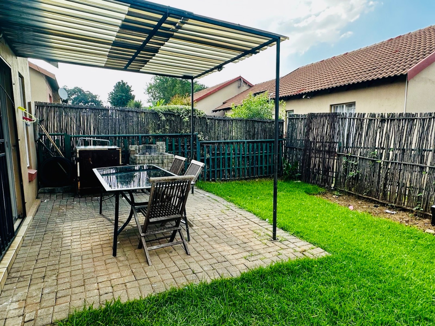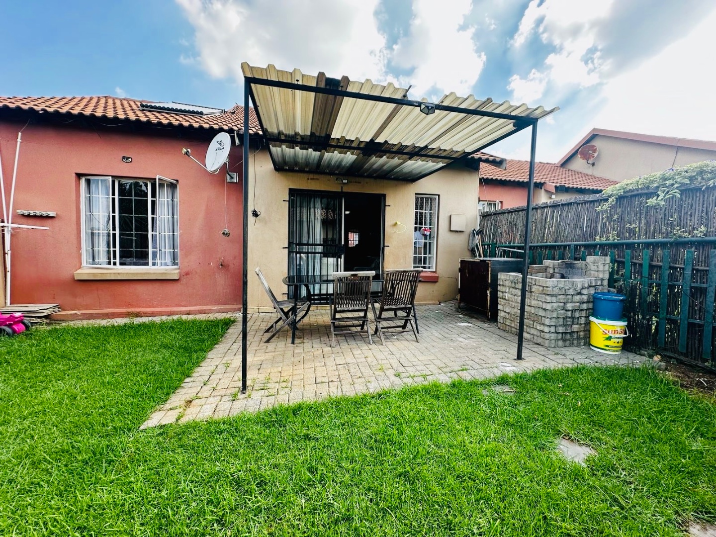 Outside, a private, well-maintained garden awaits, complete with a paved patio area and a shaded pergola, perfect for relaxation or entertaining. A built-in braai area provides an ideal spot for outdoor cooking. The property includes two dedicated parking spaces, adding to its practicality.