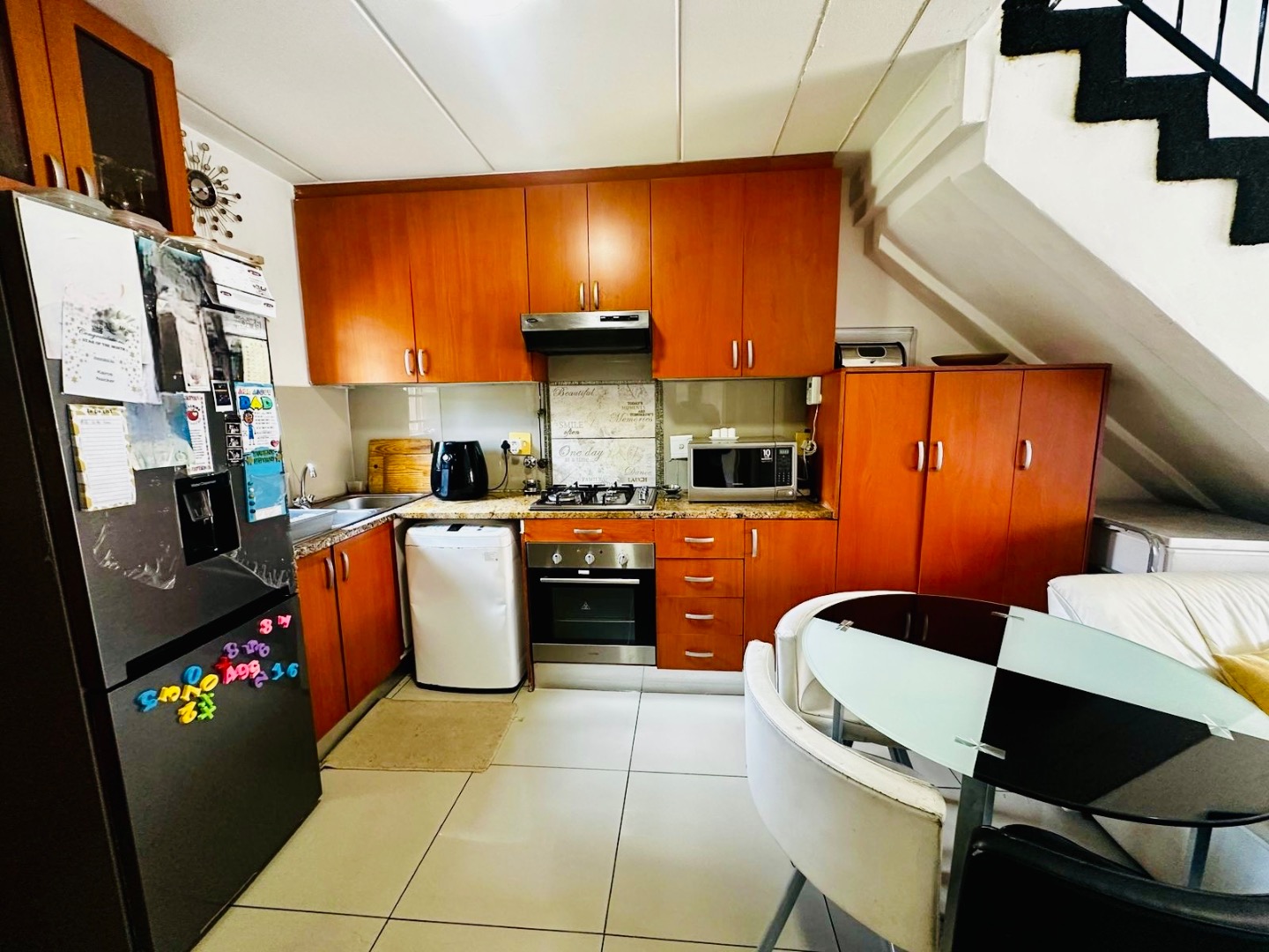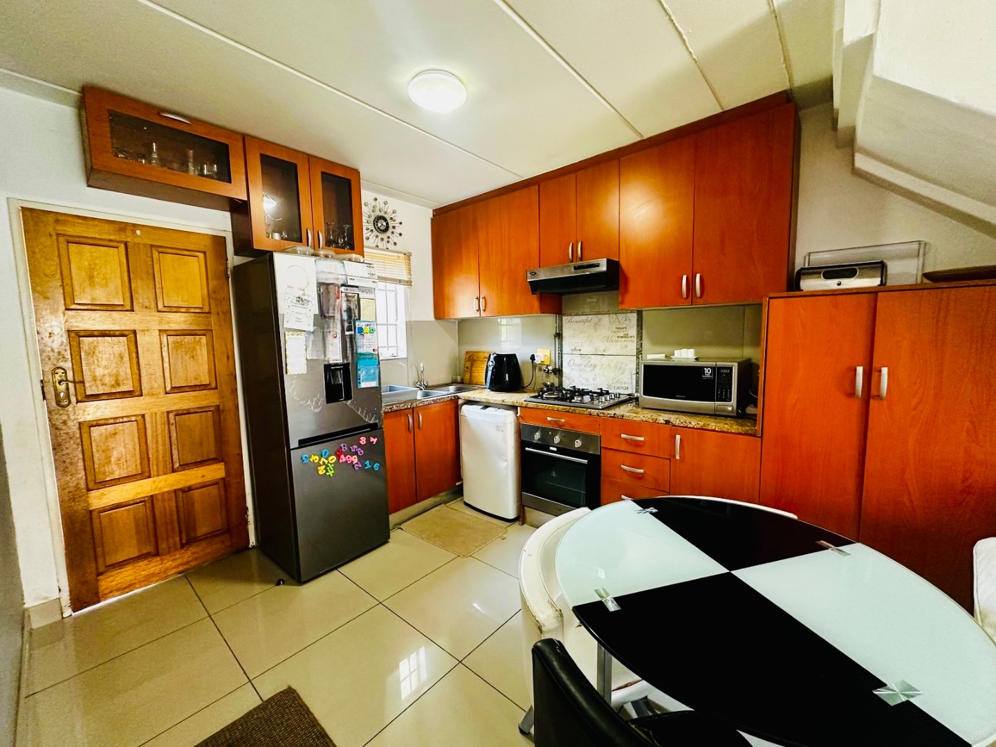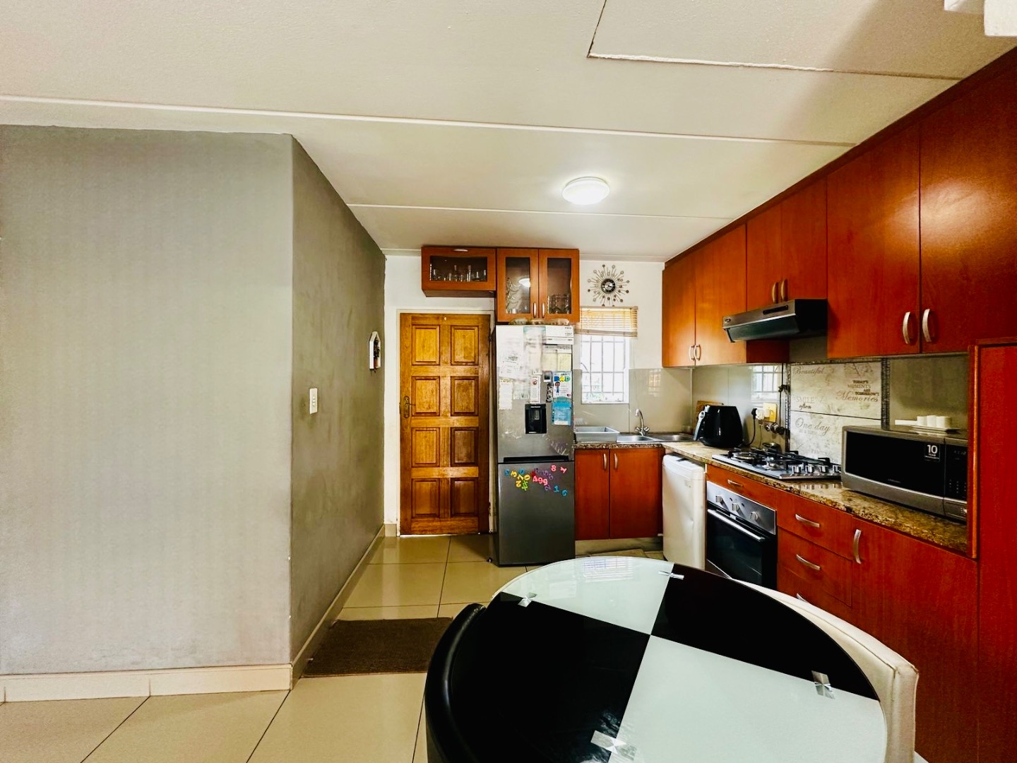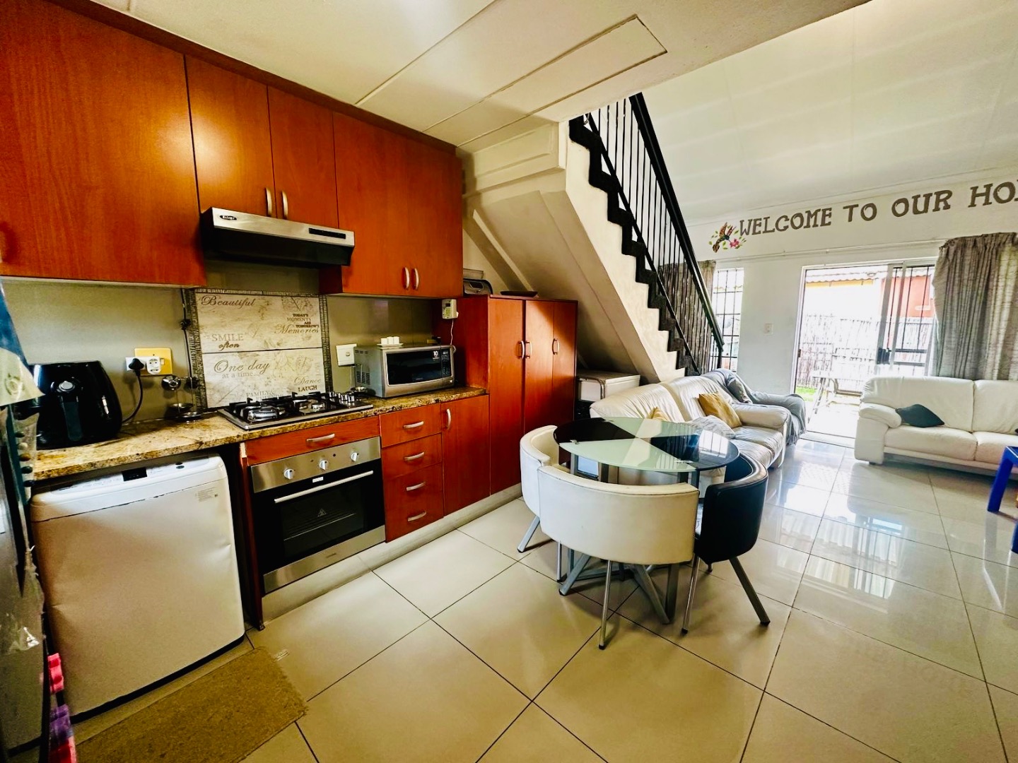 Step inside to an inviting open-plan layout that seamlessly integrates the kitchen, dining, and lounge areas. The functional kitchen is equipped with modern appliances, including a built-in oven and gas hob, complemented by ample cabinetry and granite-style countertops. Tiled flooring extends throughout these main living spaces, ensuring easy maintenance and a cohesive flow. Sliding glass doors provide convenient access to the private outdoor area, enhancing indoor-outdoor living.