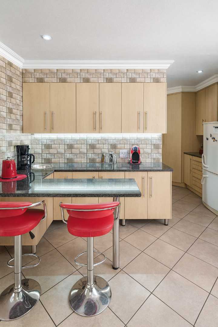 Set on a substantial 1481 sqm erf, the outdoor area is designed for relaxation and entertainment, featuring a private garden and a refreshing swimming pool. A built-in braai is perfect for hosting gatherings with family and friends. Security is paramount, with the home situated in a gated community and further secured by an alarm system, electric fencing, and a totally walled perimeter. Modern connectivity is assured with fibre readiness.