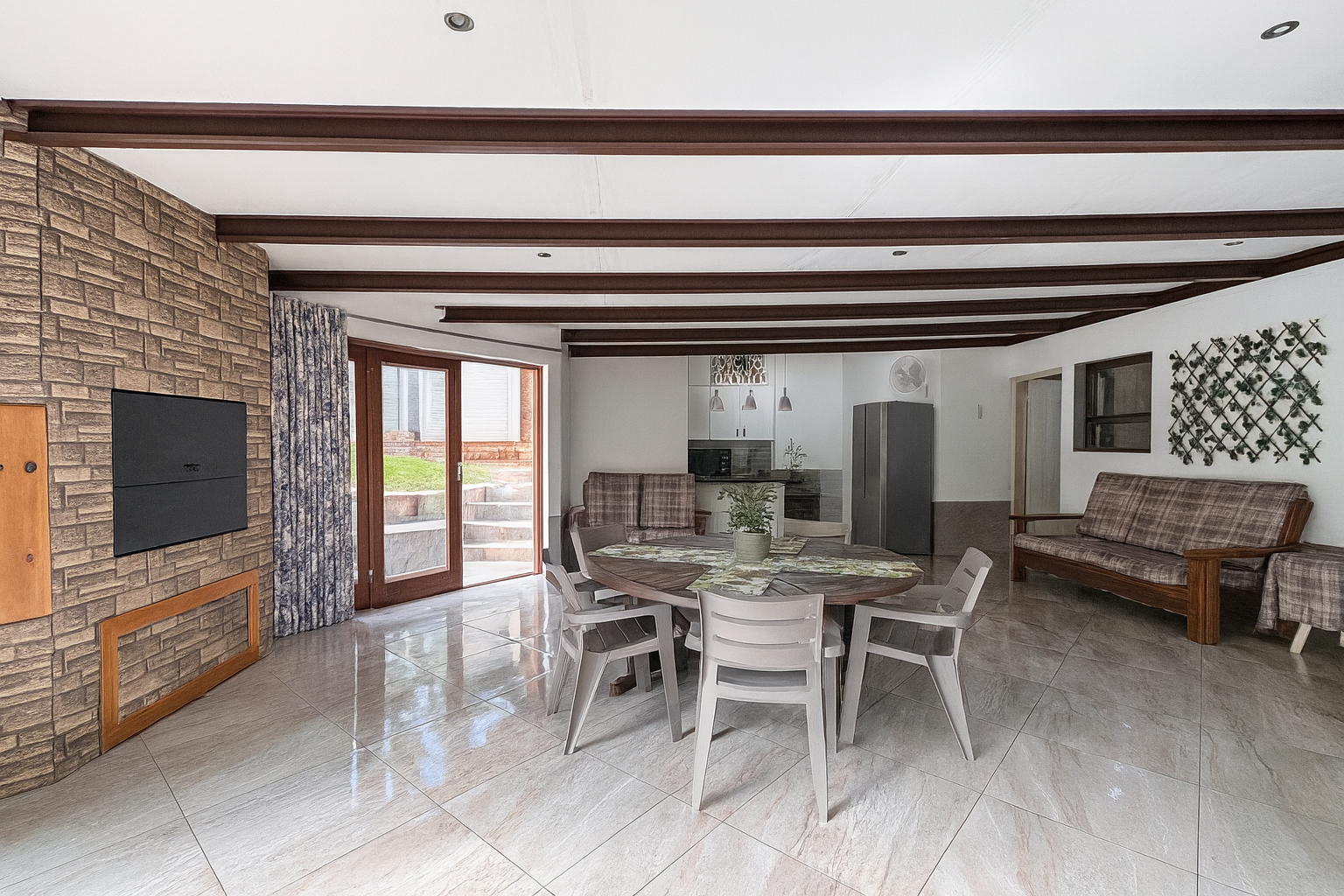 The interior offers a flexible layout with two distinct lounges and two dining rooms, catering to diverse family needs. The heart of the home comprises two modern kitchens, each equipped with light wood or white cabinetry, dark countertops, and breakfast bars, with one featuring a gas range. Open-plan living areas are adorned with tiled flooring, recessed lighting, and crown molding, creating a bright and inviting atmosphere. Exposed wooden beams add character, while sliding doors seamlessly connect indoor spaces to the outdoors.