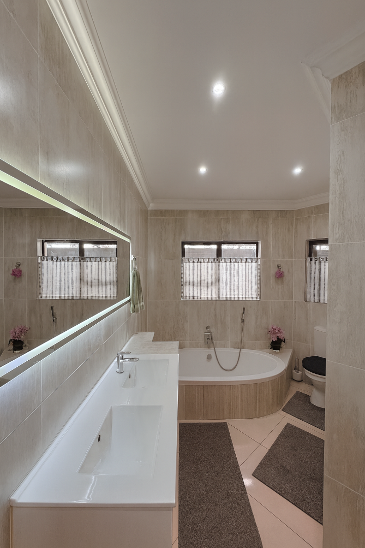 Discover this expansive six-bedroom family residence nestled within a secure gated community in Marais Steyn Park, Edenvale. Boasting an impressive kerb appeal, the property features a well-maintained exterior with a traditional tiled roof, neutral stucco, and an upper-level balcony. A large paved driveway leads to a double garage, complemented by three additional parking bays. The attached single-story wing presents an excellent opportunity for a private flatlet or versatile extended living space, enhancing the home's functionality.