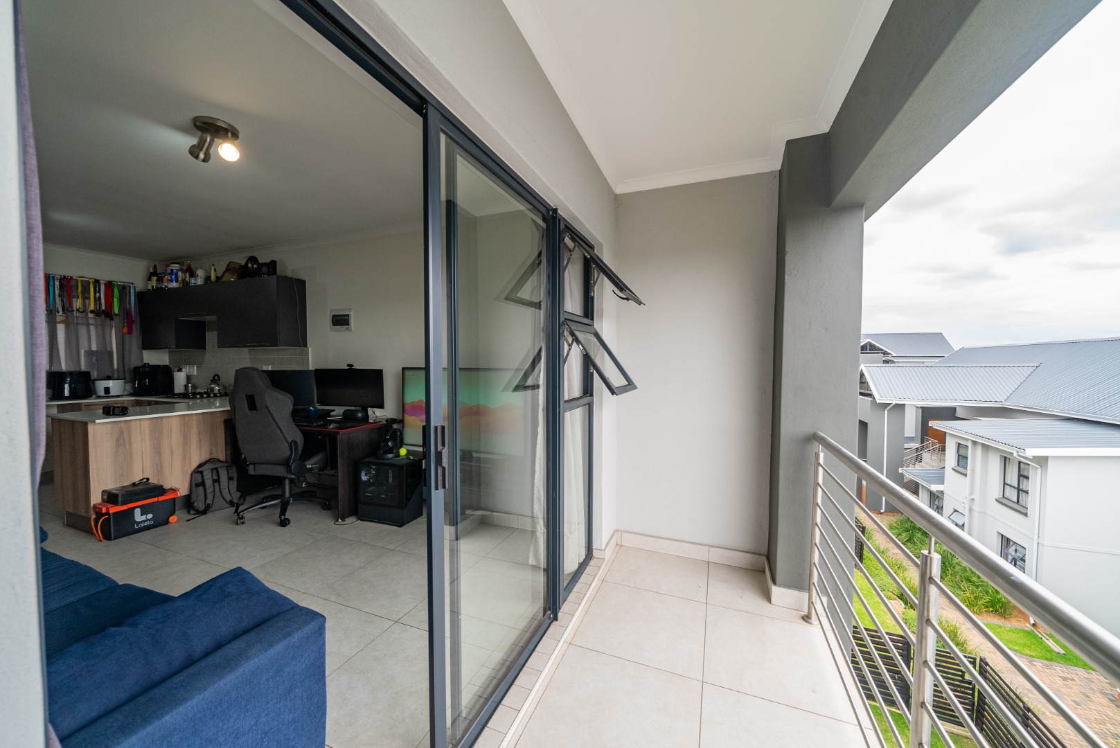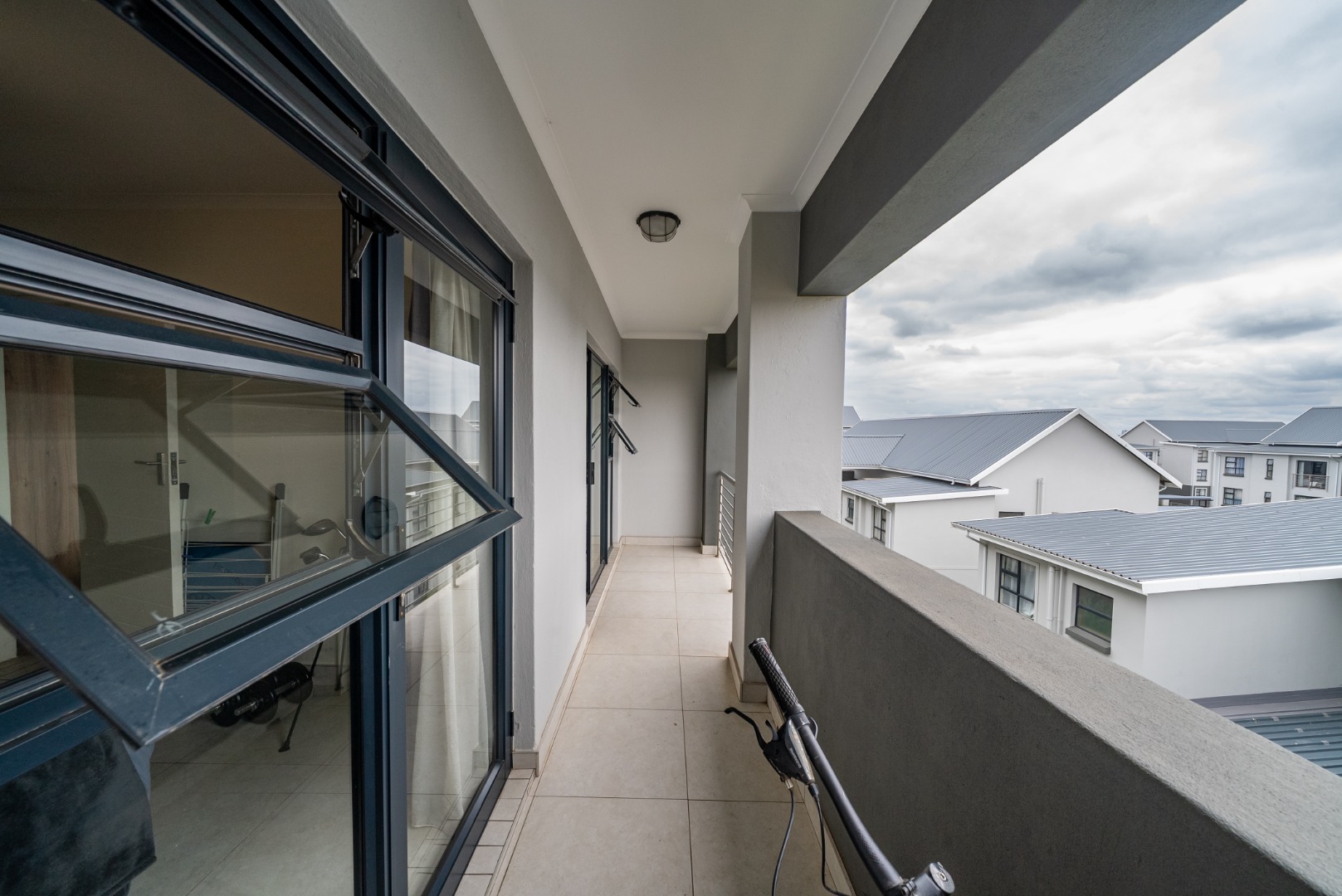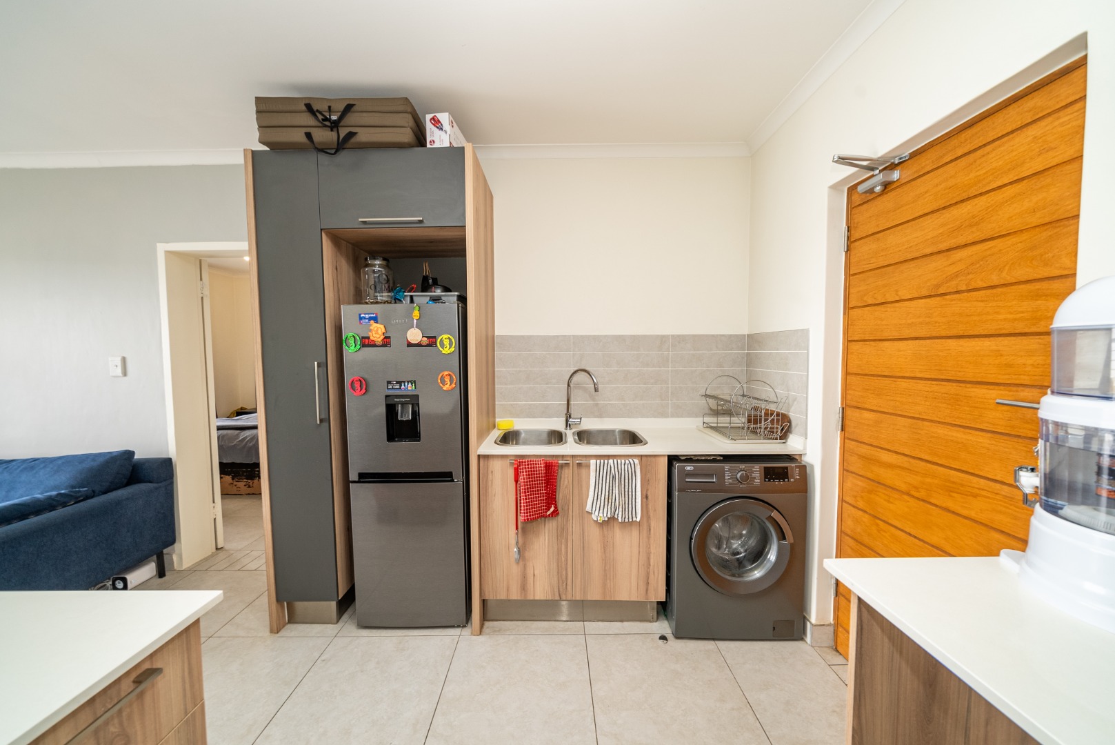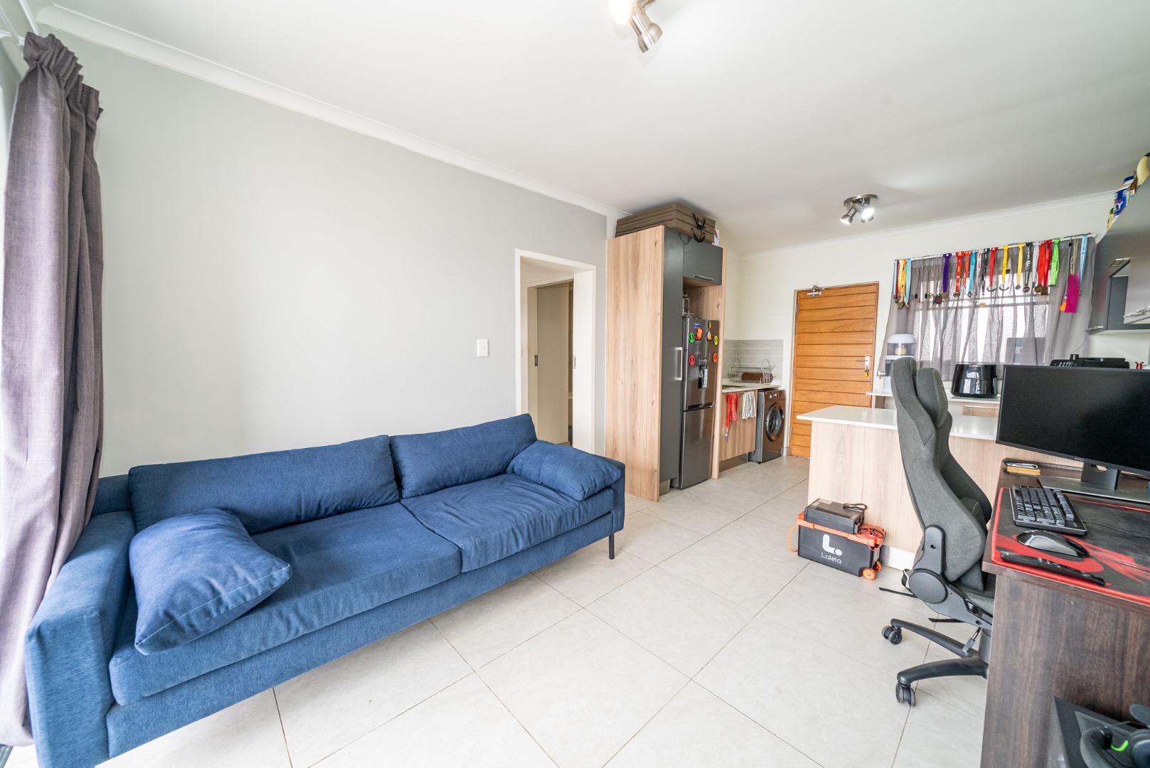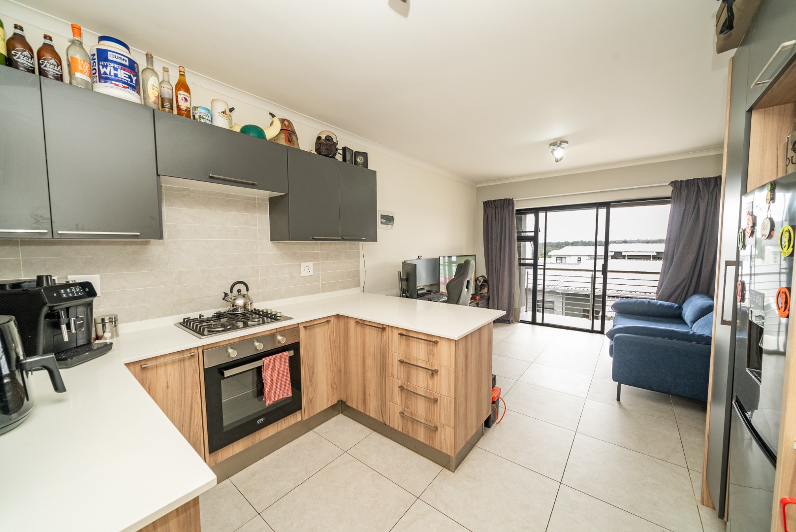 The apartment features a well-designed open-plan layout, seamlessly connecting the lounge and kitchen areas, creating a spacious and functional environment. The modern kitchen is equipped for everyday living, while the lounge provides direct access to a private balcony through elegant sliding doors. This outdoor space is perfect for relaxed entertaining. Practical amenities include a gas geyser for energy efficiency and fibre readiness, ensuring high-speed internet connectivity.